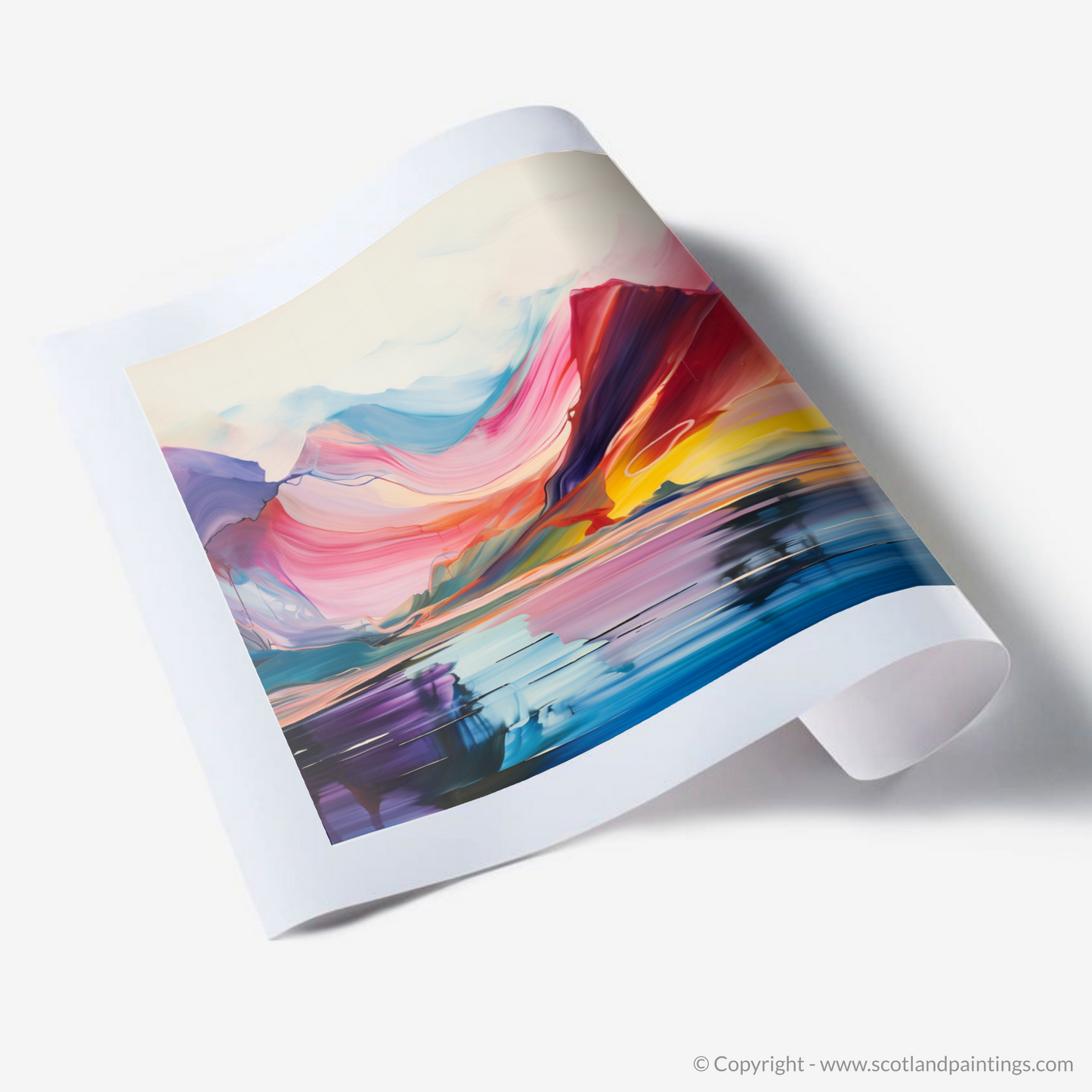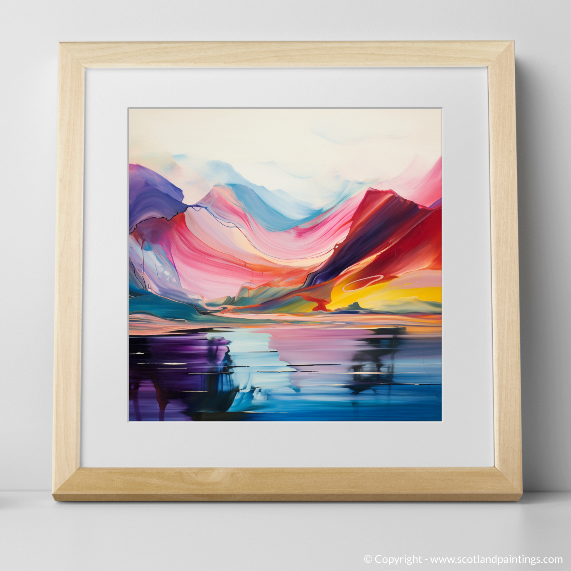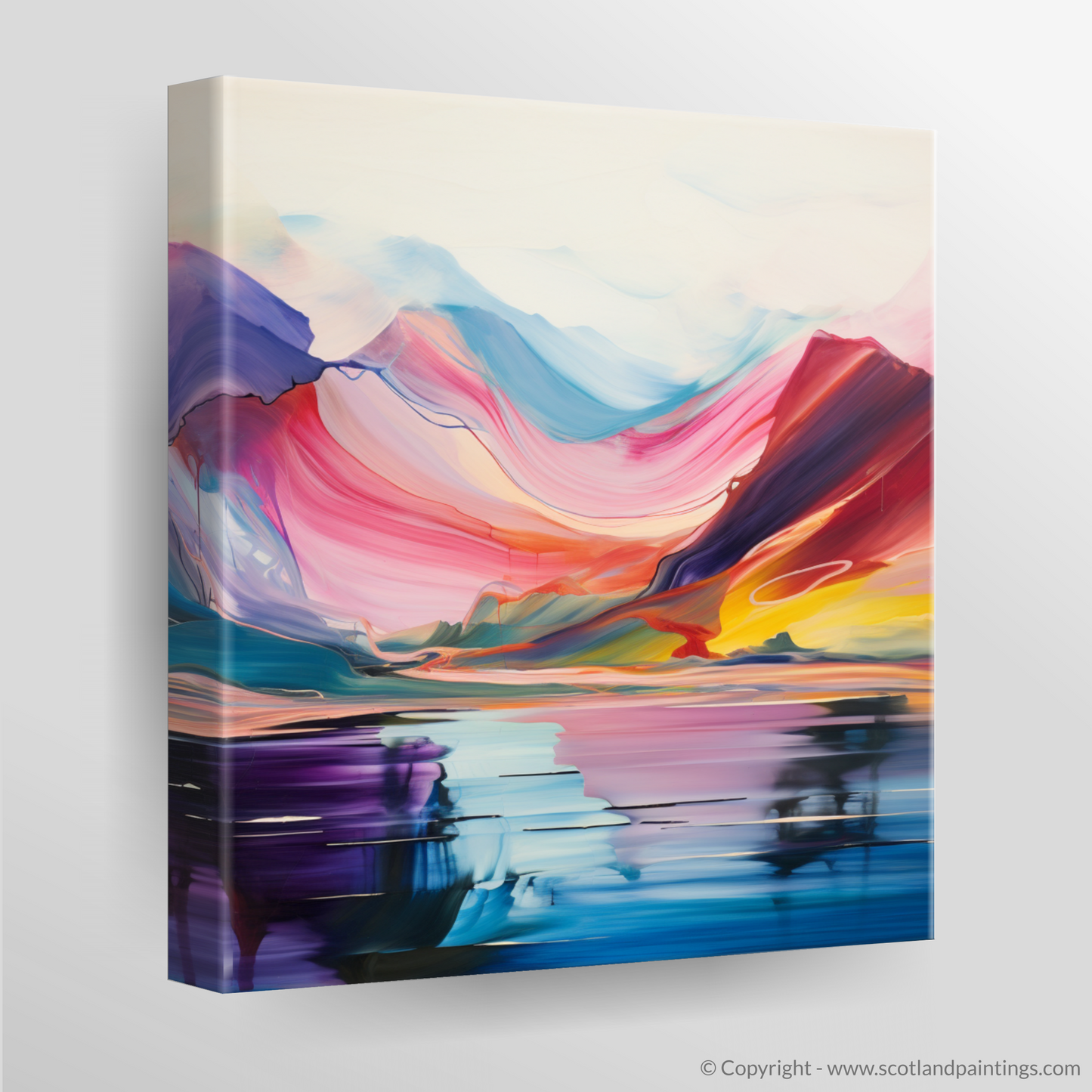 The artwork features an array of sweeping hues, ranging from deep purples and vibrant pinks to soothing blues and invigorating yellows, each blending seamlessly into the next. The bold, vivid colours are used to suggest the natural majesty of the Scottish Highlands, while abstract reflections in the tranquil waters of Loch Lomond create an almost symmetrical balance that invites contemplation.