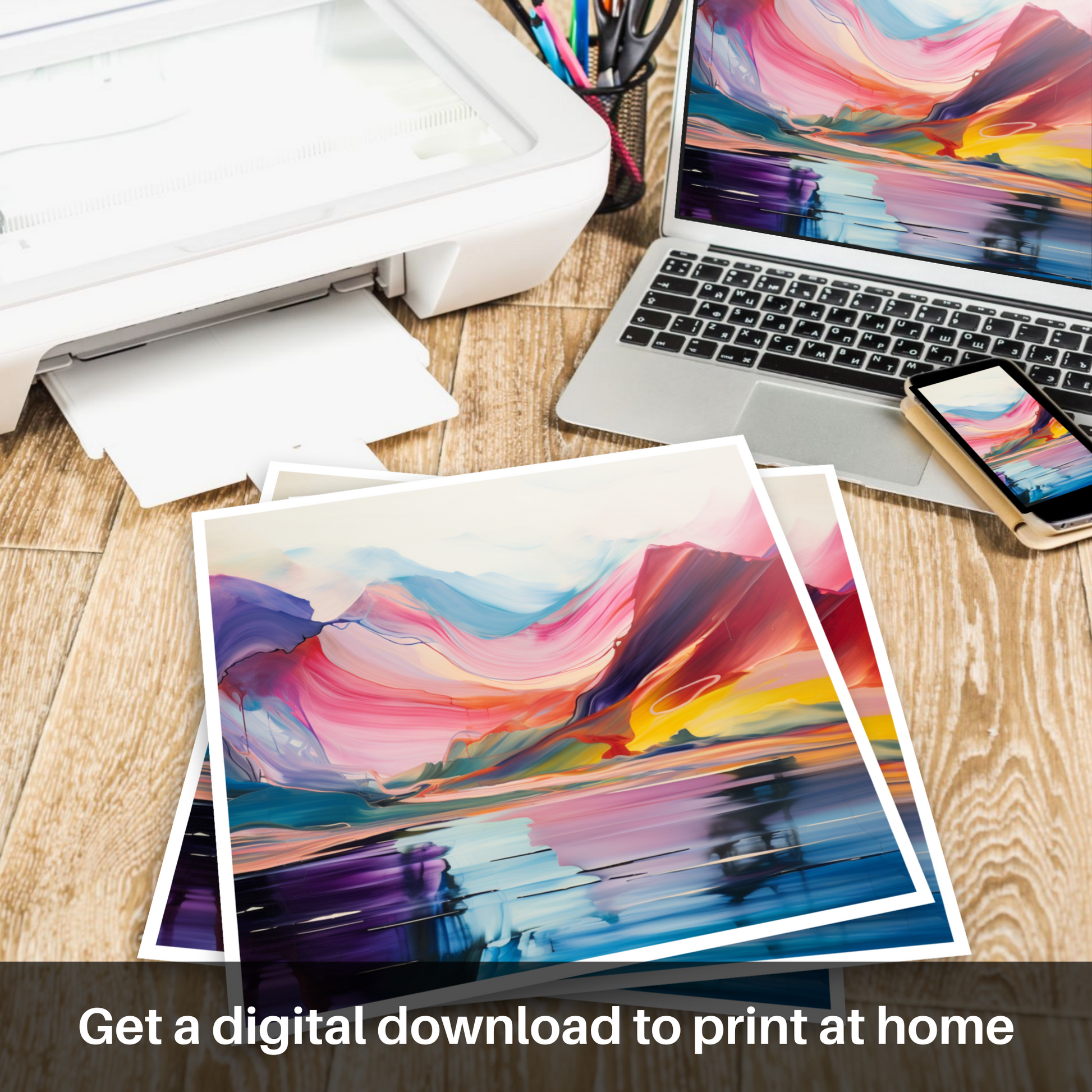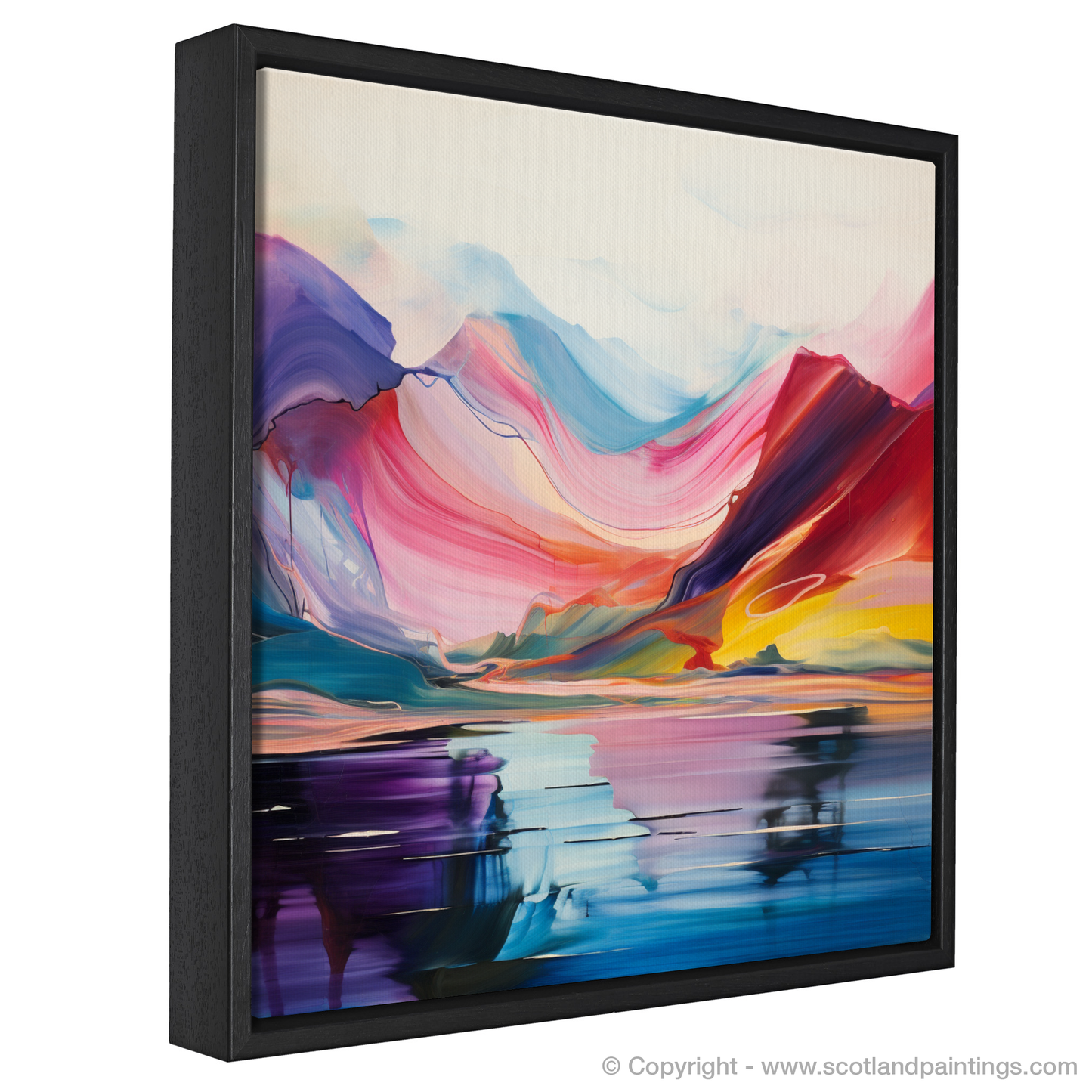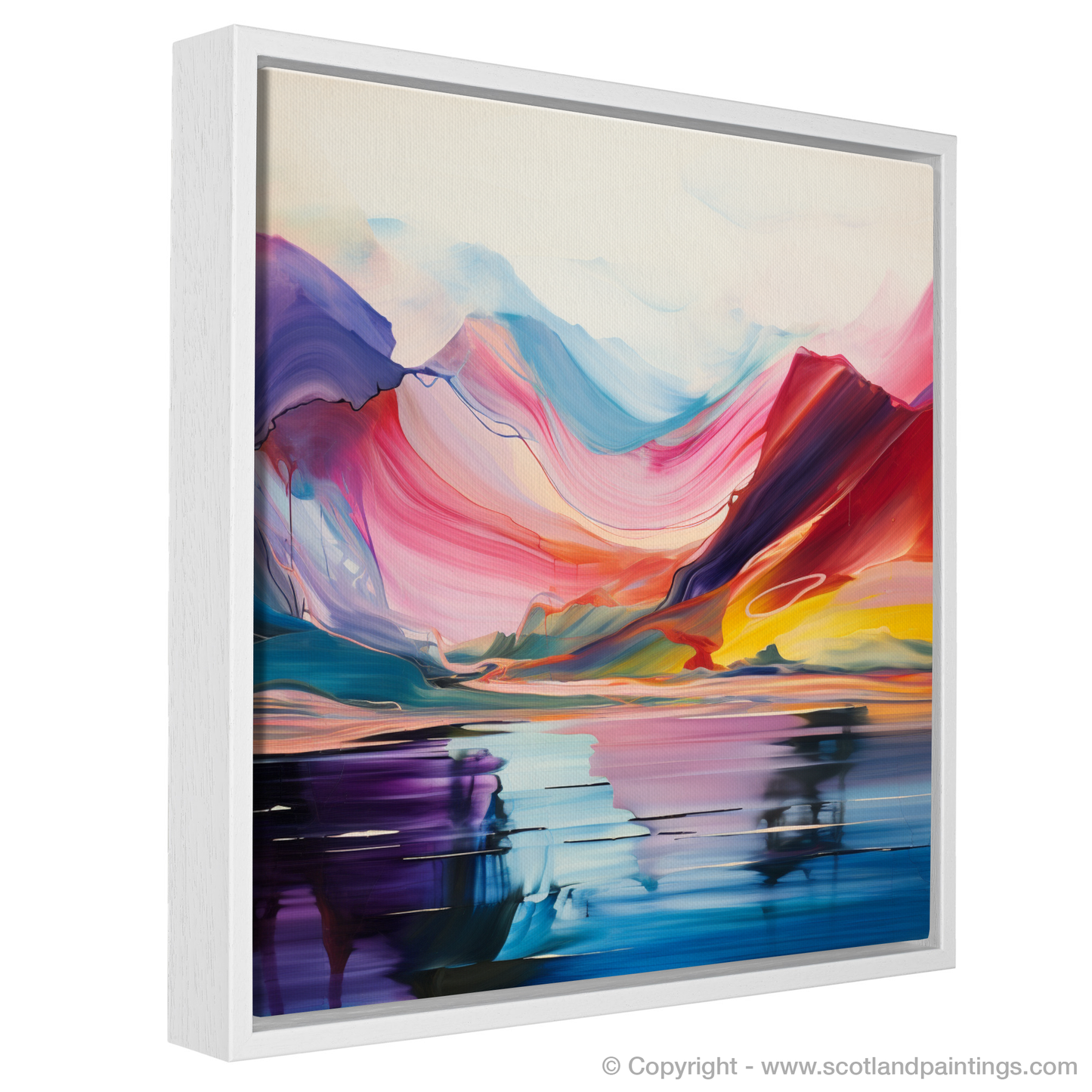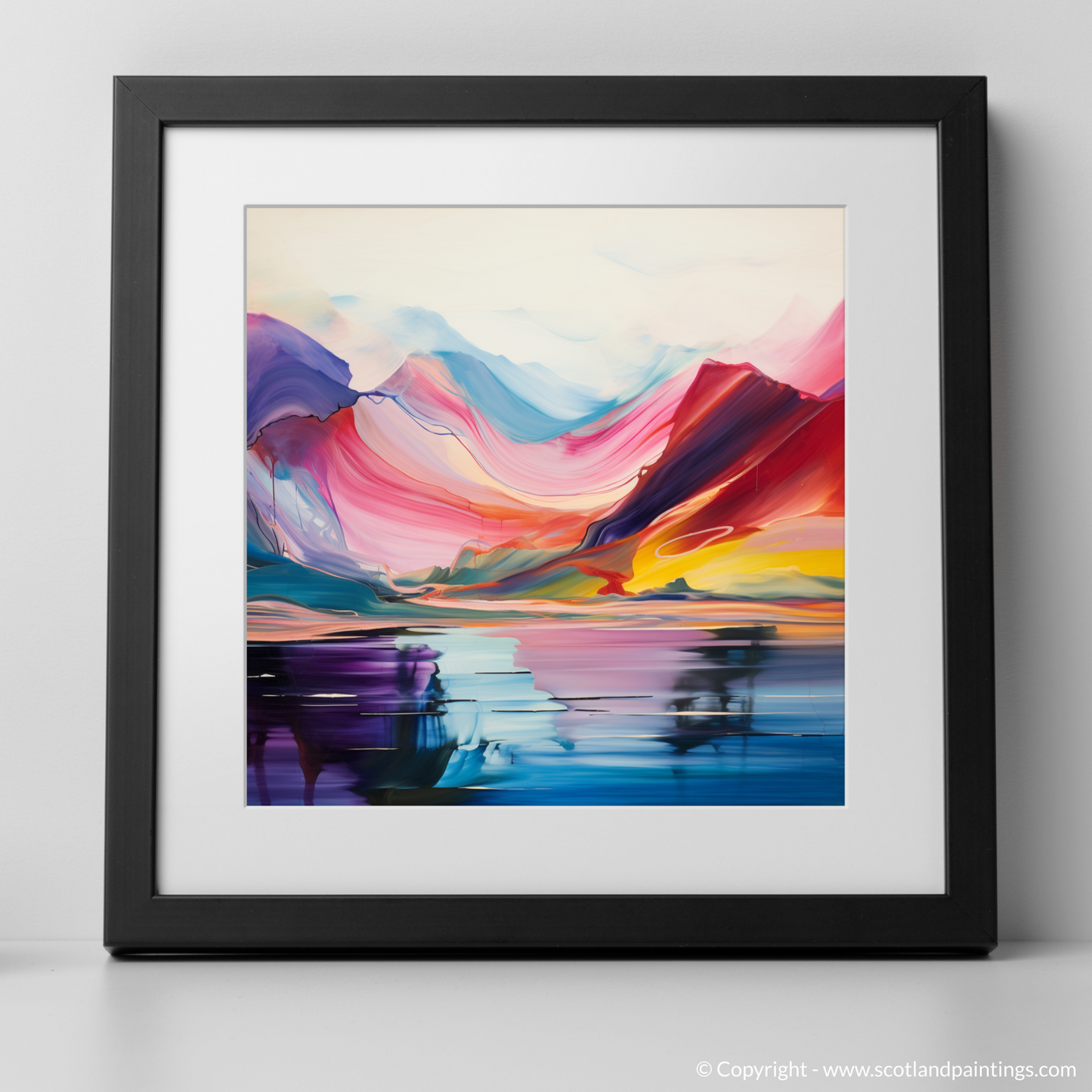 The artwork features an array of sweeping hues, ranging from deep purples and vibrant pinks to soothing blues and invigorating yellows, each blending seamlessly into the next. The bold, vivid colours are used to suggest the natural majesty of the Scottish Highlands, while abstract reflections in the tranquil waters of Loch Lomond create an almost symmetrical balance that invites contemplation.