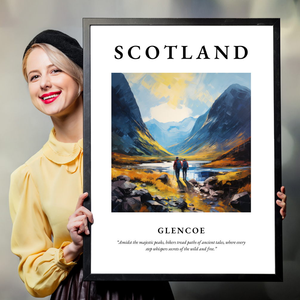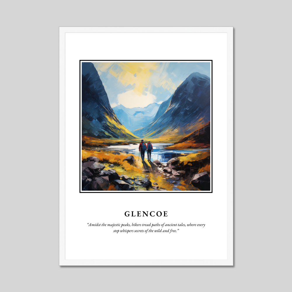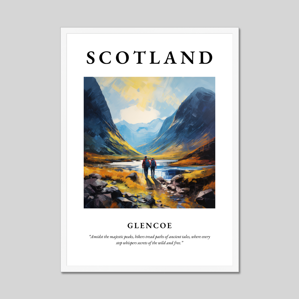 At the heart of this poster is a breathtaking minimalist depiction of Glencoe, one of Scotland’s most awe-inspiring landscapes. The large, bold lettering of “SCOTLAND” ensures a striking presence, while the painting itself captures the serene essence of Glencoe. The minimalist style accentuates the sweeping contours of the glen, with hikers traversing a path that invites viewers to step into a world where nature tells its own ancient stories. Beneath the painting, the quote “Amidst the majestic peaks, hikers tread paths of ancient tales, where every step whispers secrets of the wild and free.” adds a poetic touch, encapsulating the spirit of adventure and the sublime beauty of the Highlands.