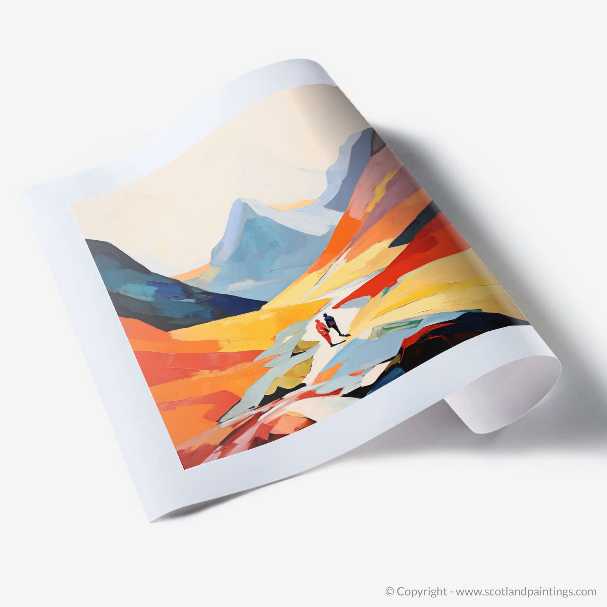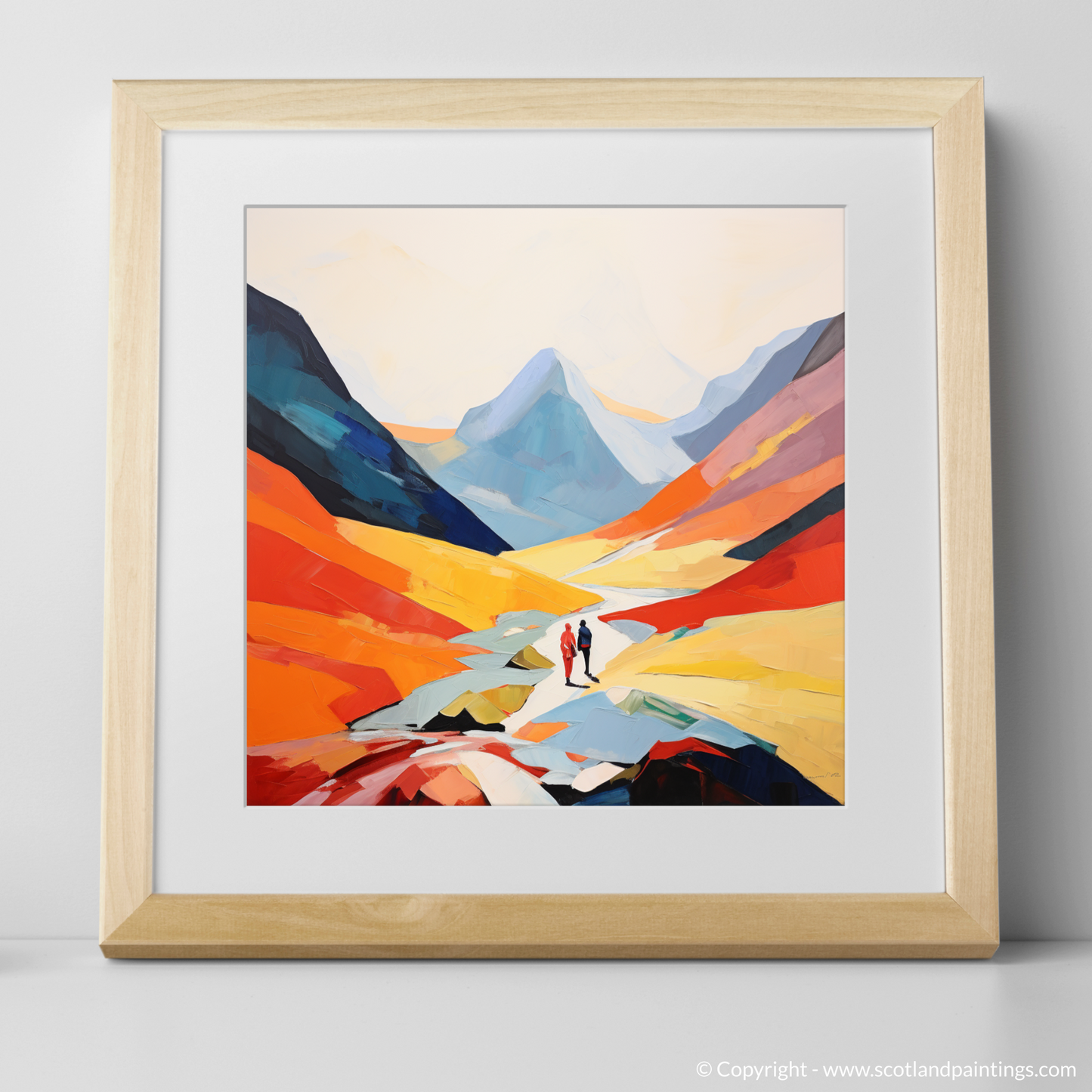 The print's minimalistic approach strips away the complexity of detail, allowing blocks of colour to shape the land, sky, and elements of water coursing through the glen. A perfect union of simplicity and depth, this piece is a testament to the power of colour and form in portraying the soul-stirring beauty of one of Scotland's most iconic landscapes.