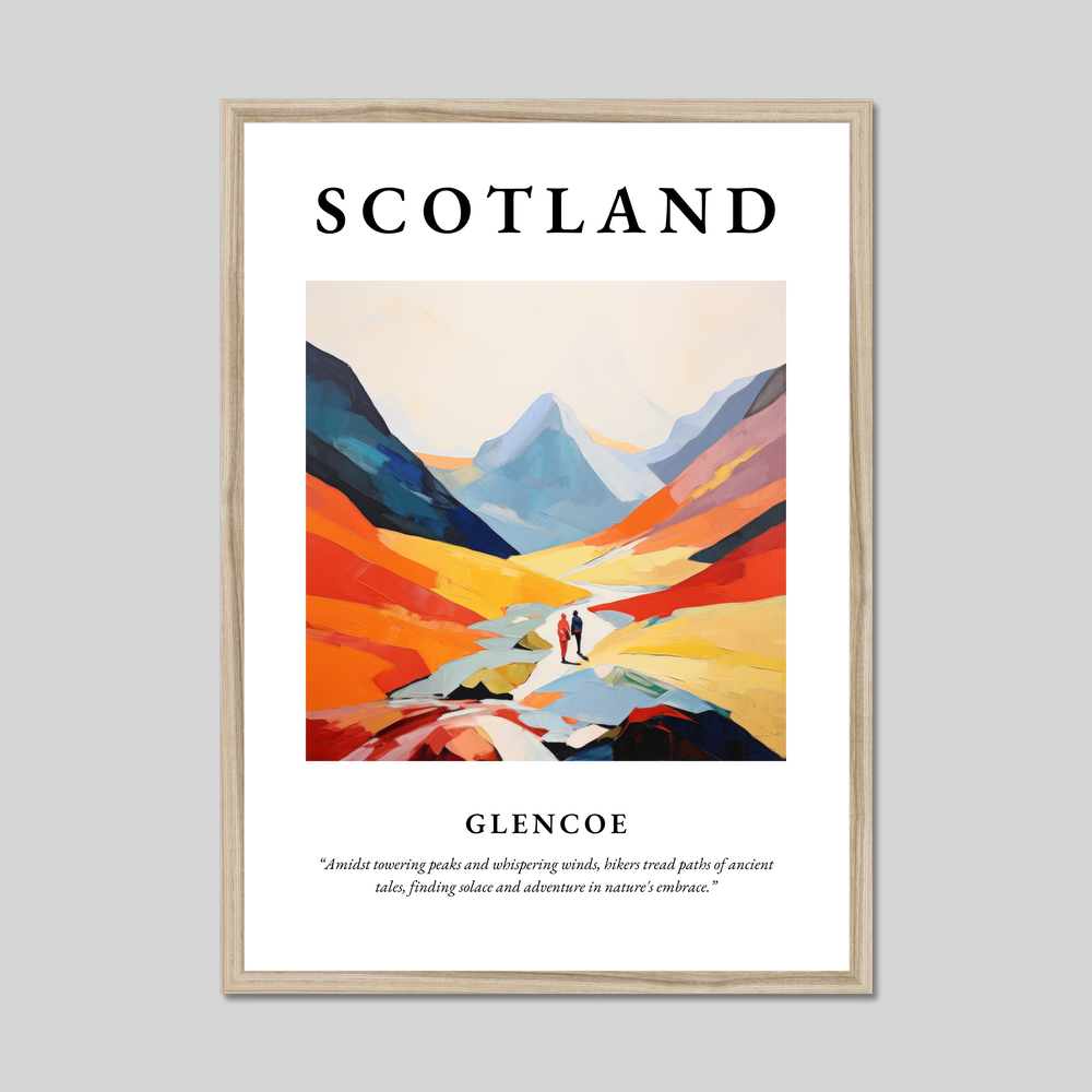 Nestled in the heart of the Highlands, Glencoe is renowned for its dramatic and rugged beauty. Visitors and locals alike are drawn to its rich tapestry of history and myth, where every peak and valley whispers stories from ages past. Walking through its scenic trails, you can almost feel the pulse of Scotland’s ancient clans and hear the distant echoes of their tales. This striking poster captures that very essence — a slice of Scotland's soul frozen in time.