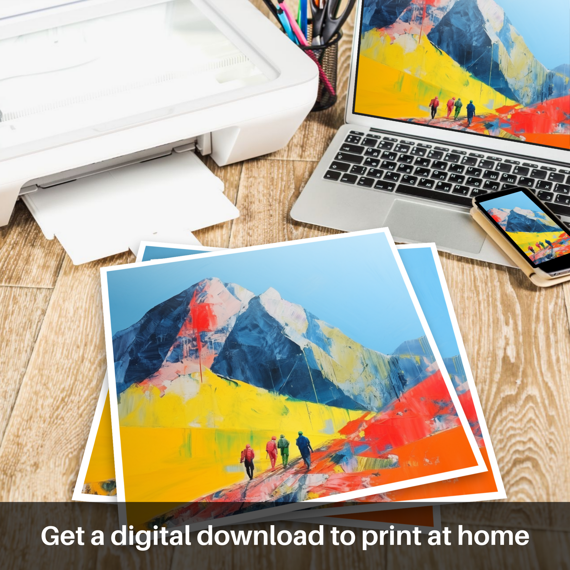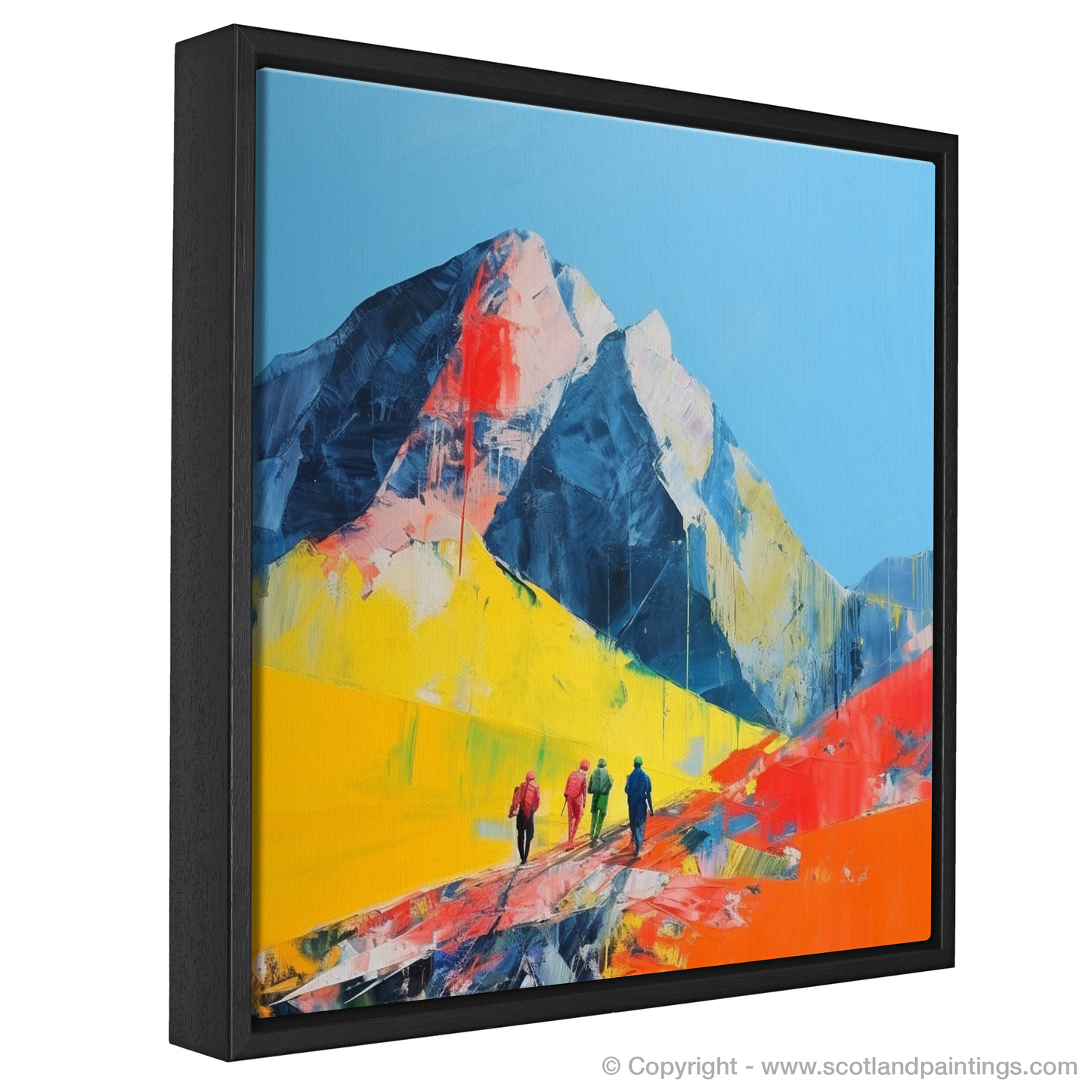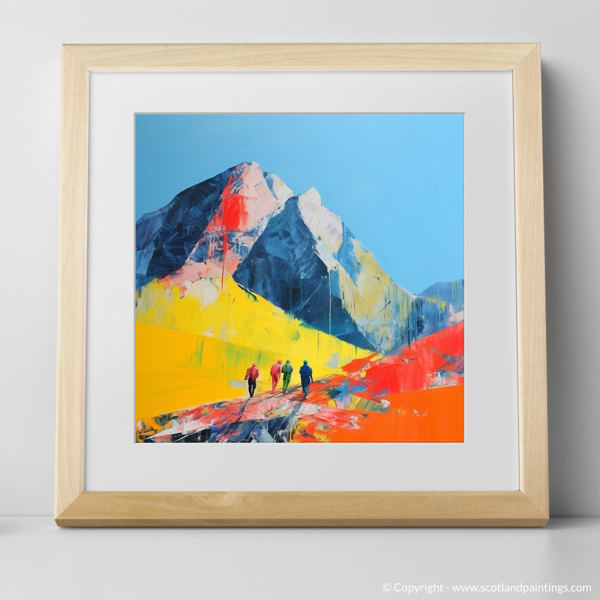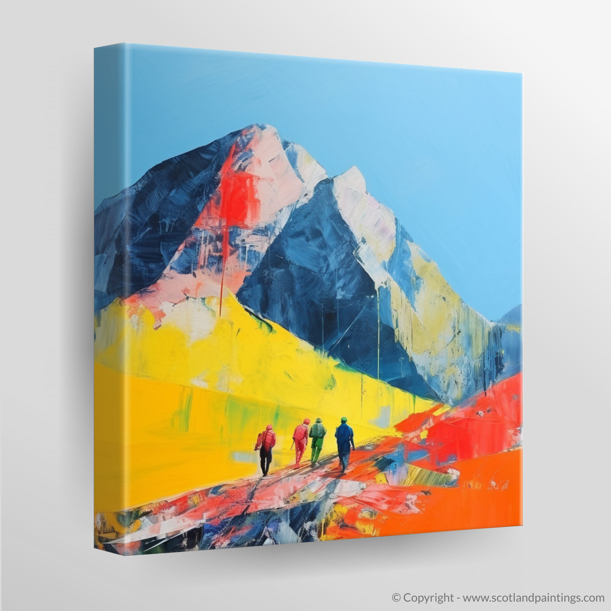 Set against a background of bold cobalt and navy hues that represent the formidable mountain peaks, the artwork is animated by an expanse of electric yellow and vivacious orange that invigorate the terrain with an almost otherworldly vibrancy. These bright, expressive swathes of colour not only mimic the dramatic shifts in Scottish weather but also reflect the region's raw and natural vitality.