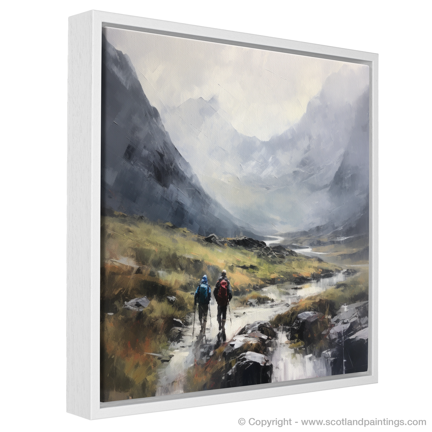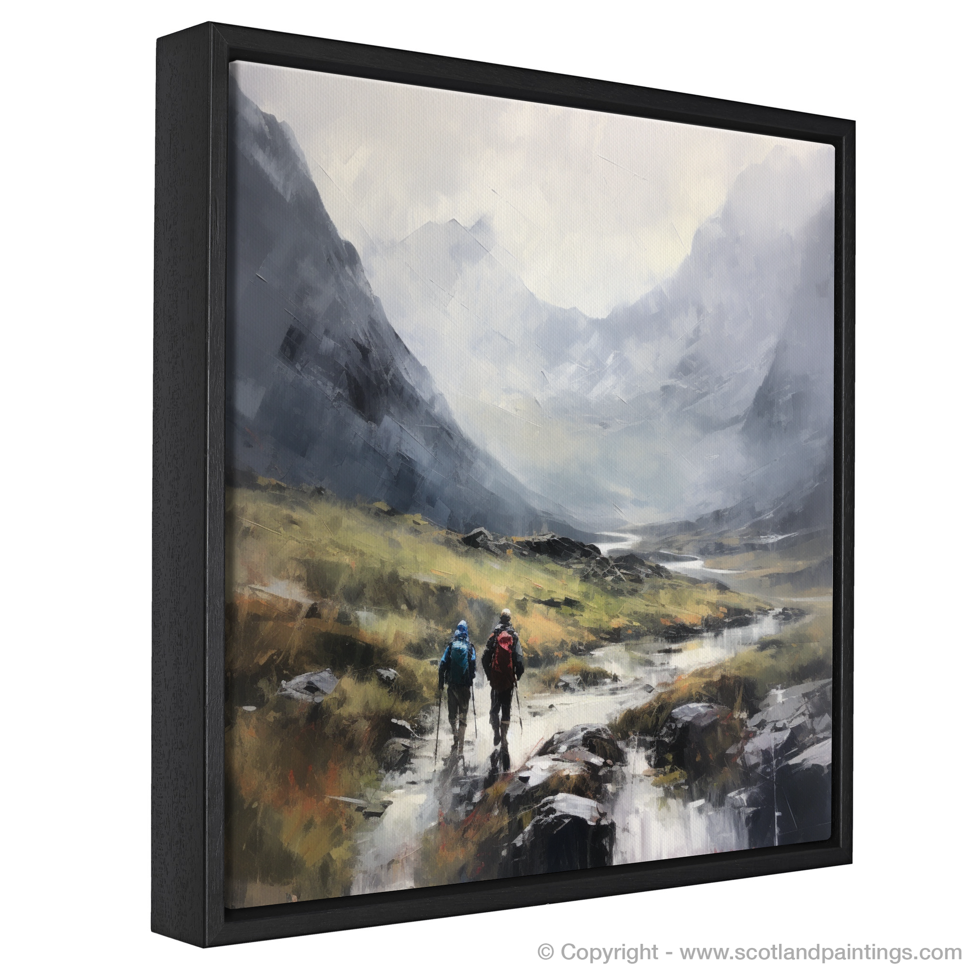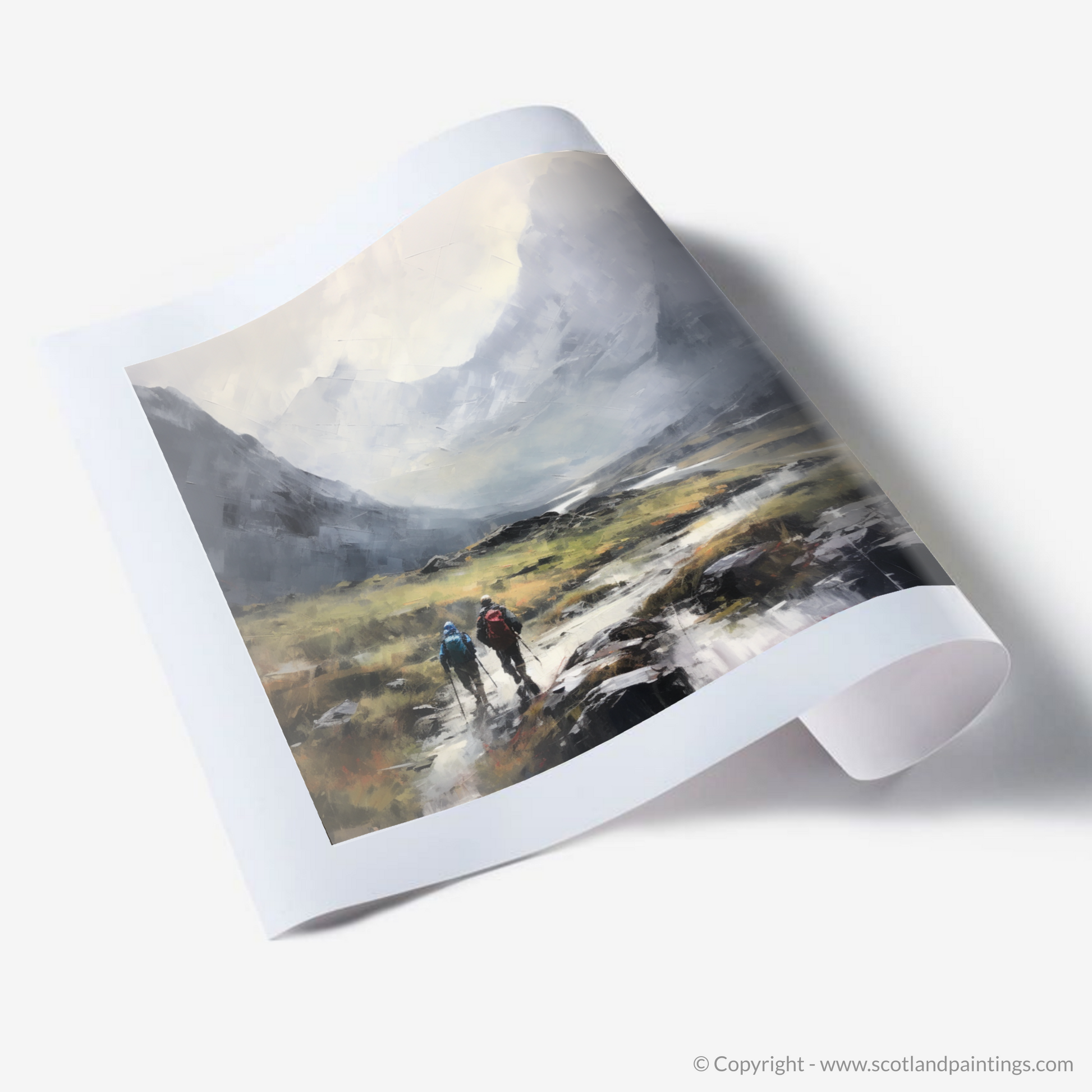 Two hikers, rendered in simple yet expressive strokes, traverse the rugged terrain, their journey dwarfed by the grandeur of the mountains that rise steeply into the mist. Their bright attire contrasts with the subtle hues of nature, adding a human element to the wild, untamed scene. The print encapsulates the raw spirit of adventure and the tranquillity of the Highlands, with scattered light catching the wet surfaces and verdant grasses, hinting at the unpredictable weather that is characteristic of the region.