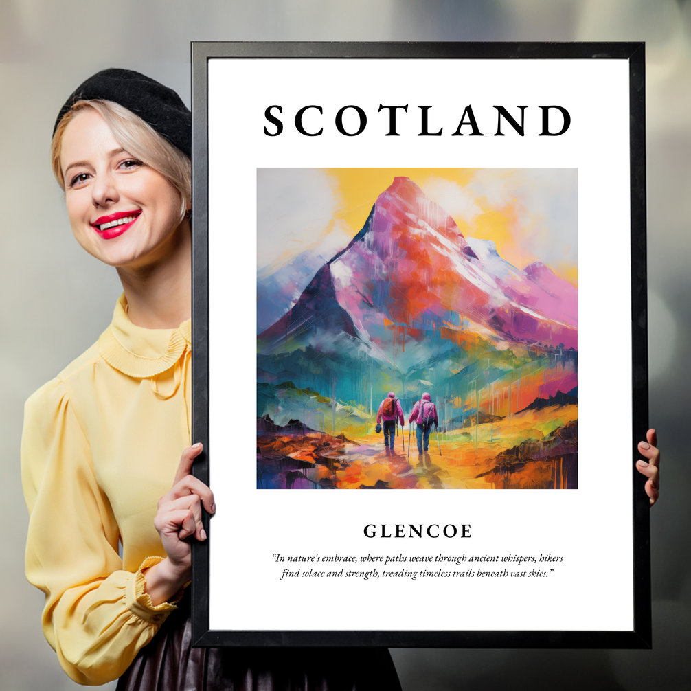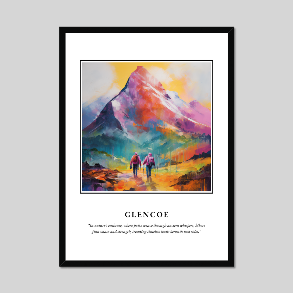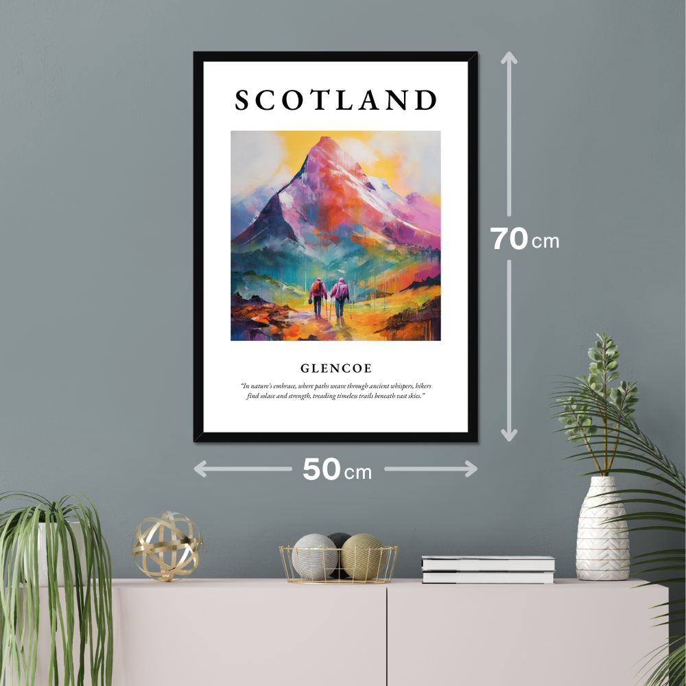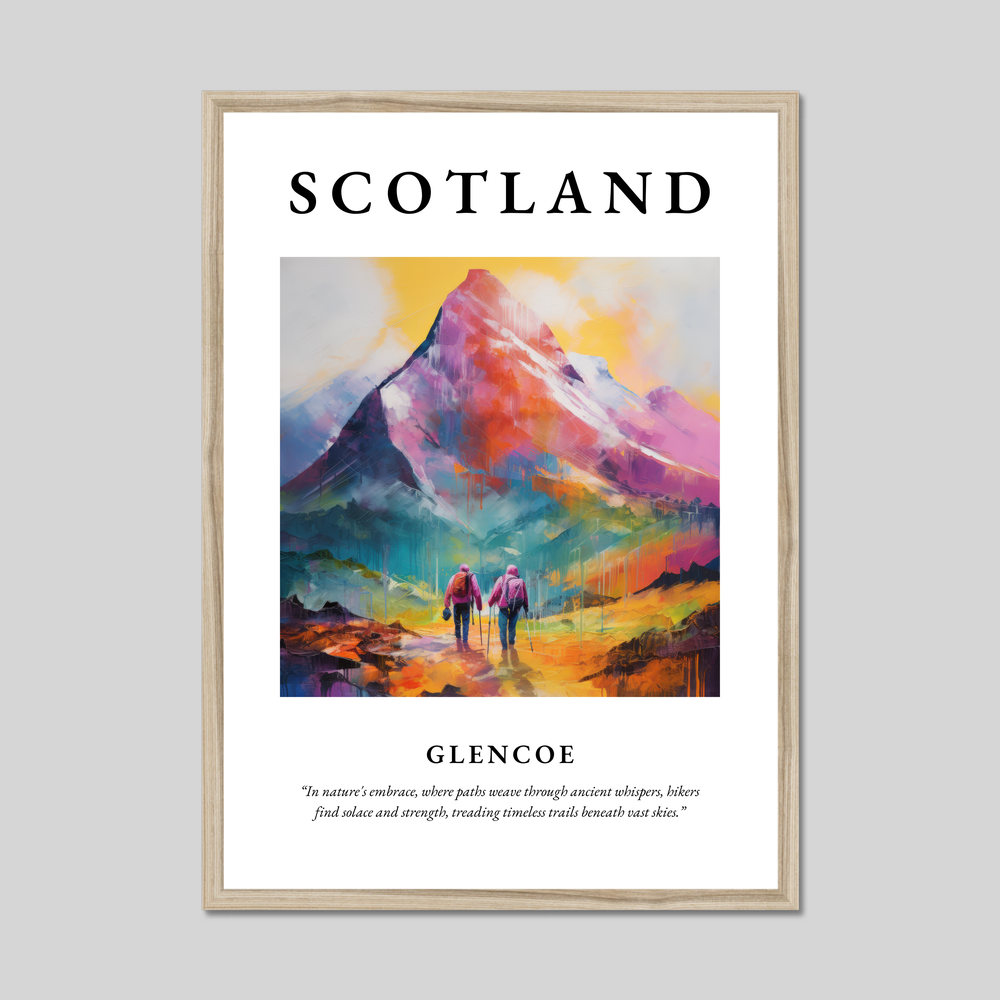 Dive into the captivating essence of Scotland with this stunning 50cm x 70cm framed poster, a perfect addition to any art lover's collection. Featuring "SCOTLAND" in bold lettering at the top, this piece immediately transports you to the breathtaking landscapes of Glencoe. Below, in the gentle whispers of smaller text, lies the evocative quote: “In nature's embrace, where paths weave through ancient whispers, hikers find solace and strength, treading timeless trails beneath vast skies.”