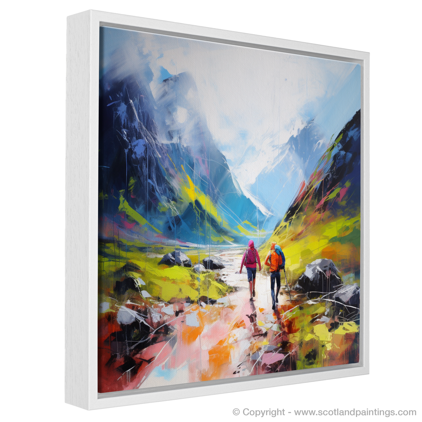 Immerse yourself in the vibrant, enigmatic beauty of the Scottish Highlands with this exquisite abstract impressionist print from our 'Scotland Favourites' collection. The piece vividly captures the spirit of adventure as it portrays two hikers, one cloaked in a vivid pink jacket and the other in hues of brilliant orange, navigating the rugged terrain of Glencoe. They are set against a backdrop that melds wild nature with emotive creativity; the artist uses bold strokes and a dynamic colour palette to evoke the powerful, untamed essence of Scotland's landscapes.