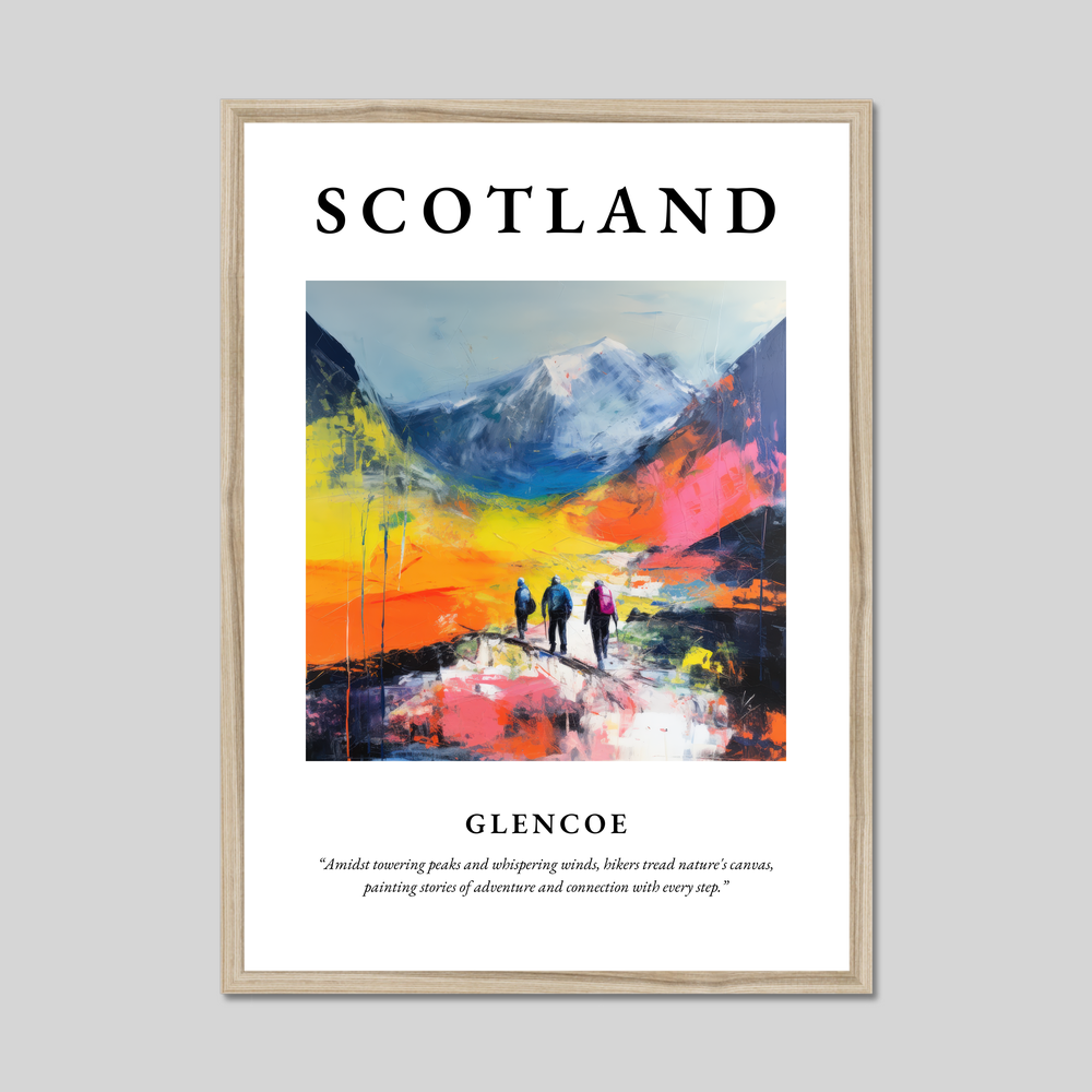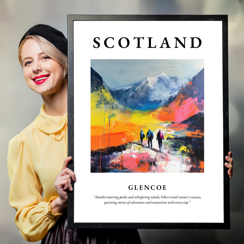 Dominating the scene is the word “SCOTLAND” in bold, compelling lettering, sitting proudly above an expressive interpretation of Glencoe. Swirling hues of vibrant oranges, deep blues, and striking pinks capture the essence of the rugged terrain and ever-changing sky. Below the ethereal peaks, hikers meandering amidst the vivid landscape evoke feelings of adventure and deep connection with nature, vividly underscored by the evocative quote beneath: “Amidst towering peaks and whispering winds, hikers tread nature's canvas, painting stories of adventure and connection with every step.”