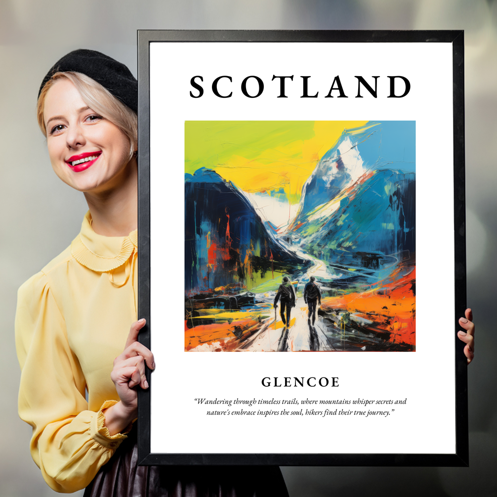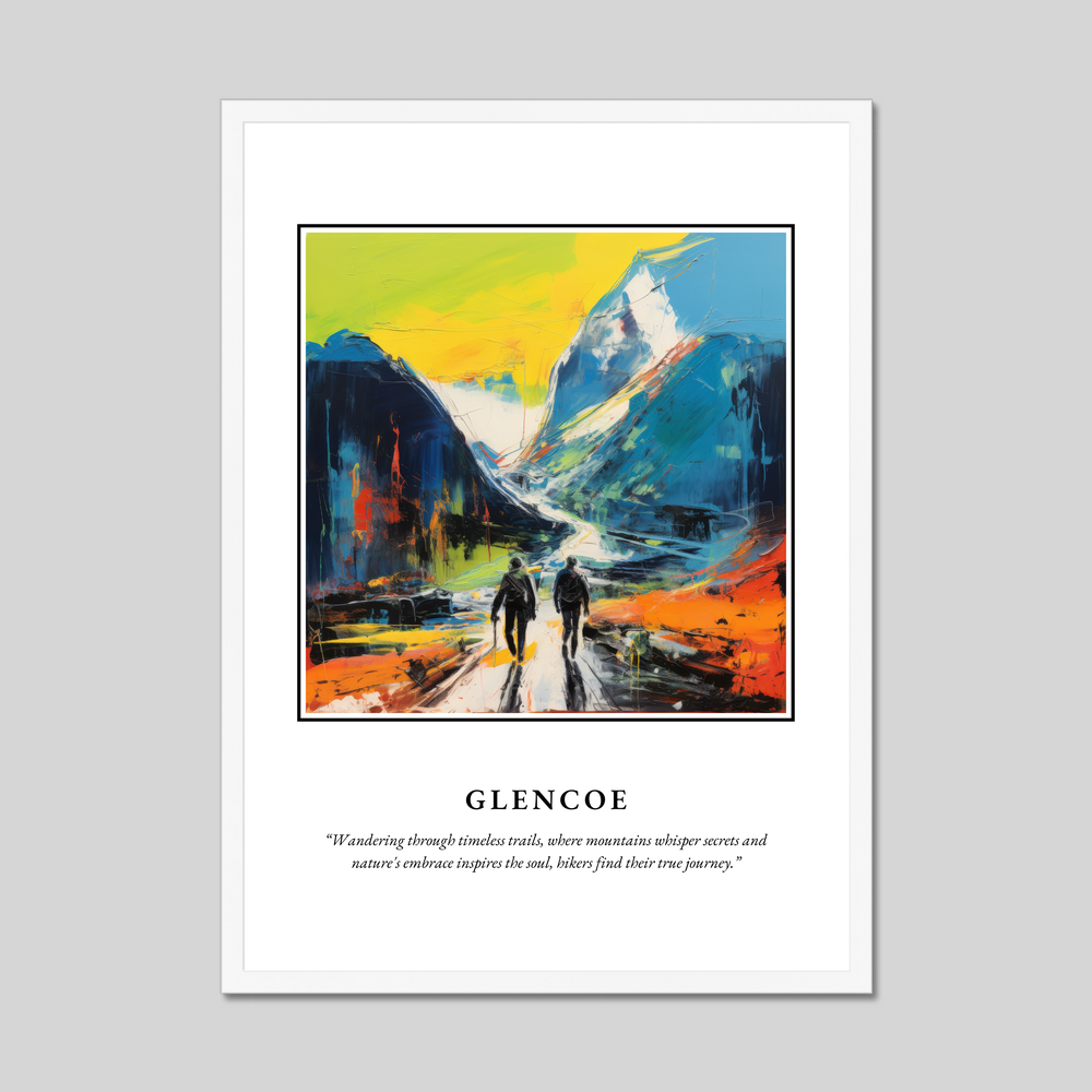 At the top, bold lettering declares “SCOTLAND”, setting the stage for a mesmerising painting that encapsulates the soul of this majestic land. Crafted in the evocative style of Abstract Impressionism, the artwork captures the essence of Glencoe with vibrant swathes of colour and expressive brushstrokes. The painting brings to life an emotional journey through towering peaks, inviting viewers to wander through a dreamscape where every mountain whispers a secret of the ages. Below, a poignant quote completes the scene: “Wandering through timeless trails, where mountains whisper secrets and nature's embrace inspires the soul, hikers find their true journey.”
