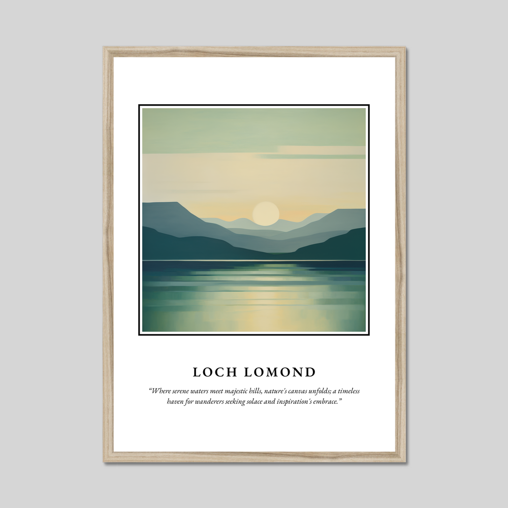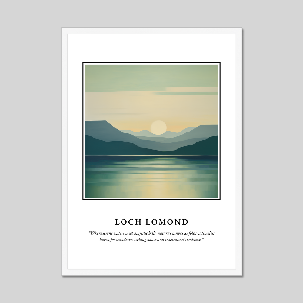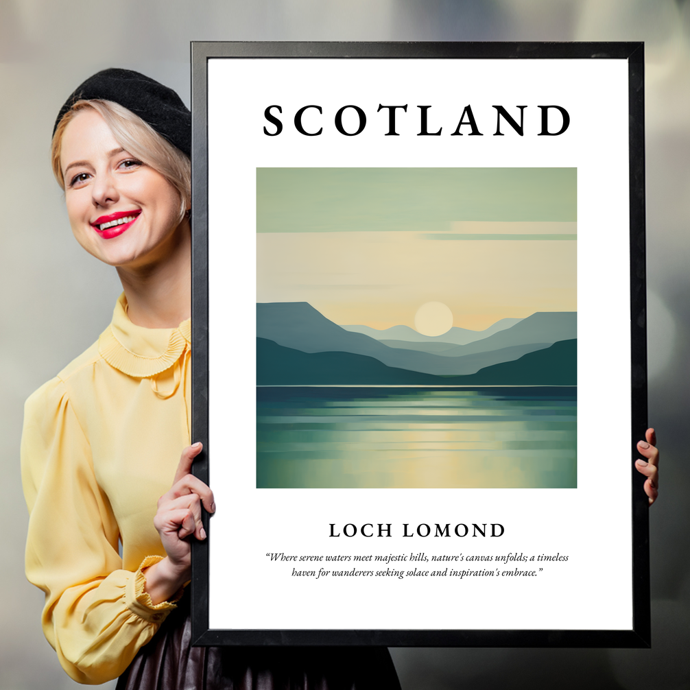 At the top, “SCOTLAND” is emblazoned in bold, inviting you to explore the scenic artistry below. The painting itself showcases Loch Lomond in minimalist style, where simple forms and soothing colours converge to convey the timeless beauty of this iconic locale. Beneath the painting, the evocative quote, “Where serene waters meet majestic hills, nature's canvas unfolds; a timeless haven for wanderers seeking solace and inspiration's embrace,” perfectly encapsulates the depth and allure of this remarkable landscape.