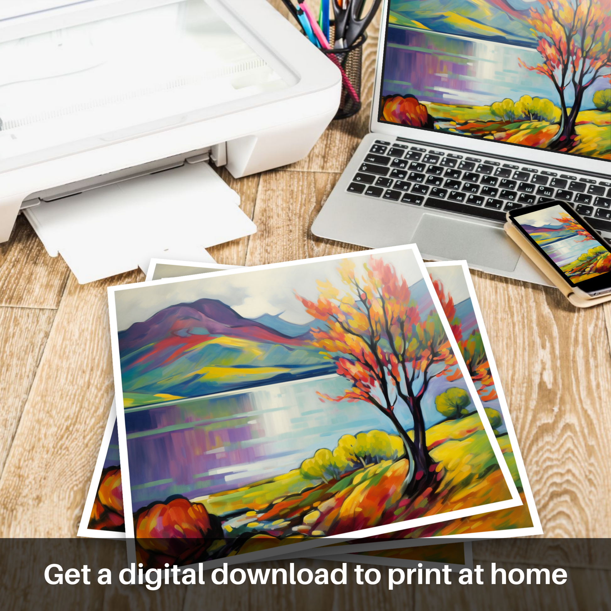 Immerse yourself in the vibrant hues and swirling tones of our exclusive print, a piece that beautifully interprets the natural grandeur of Loch Lomond through the expressive lens of Fauvist inspiration. This captivating artwork invites the viewer into a bold, colour-saturated landscape, where the imagination is set alight by the fiery red and orange foliage of a solitary tree, its branches reaching skyward as if ablaze with the wild spirit of Scotland itself.