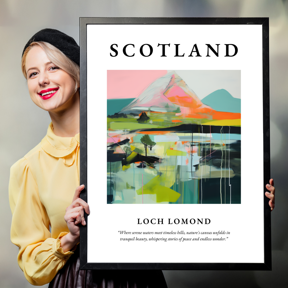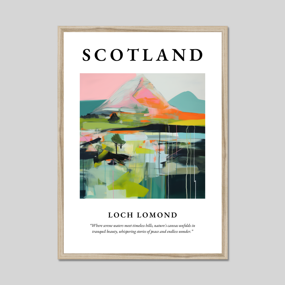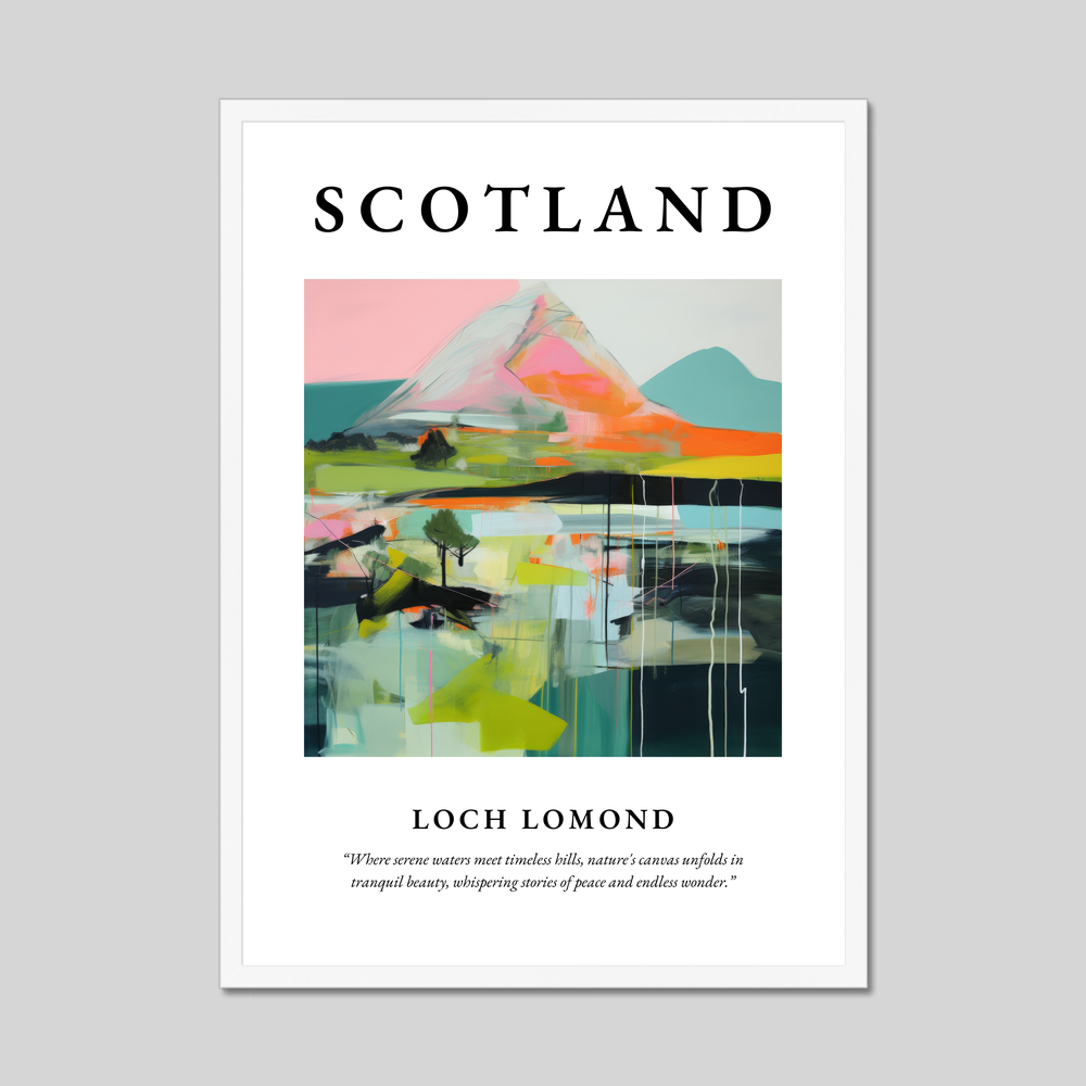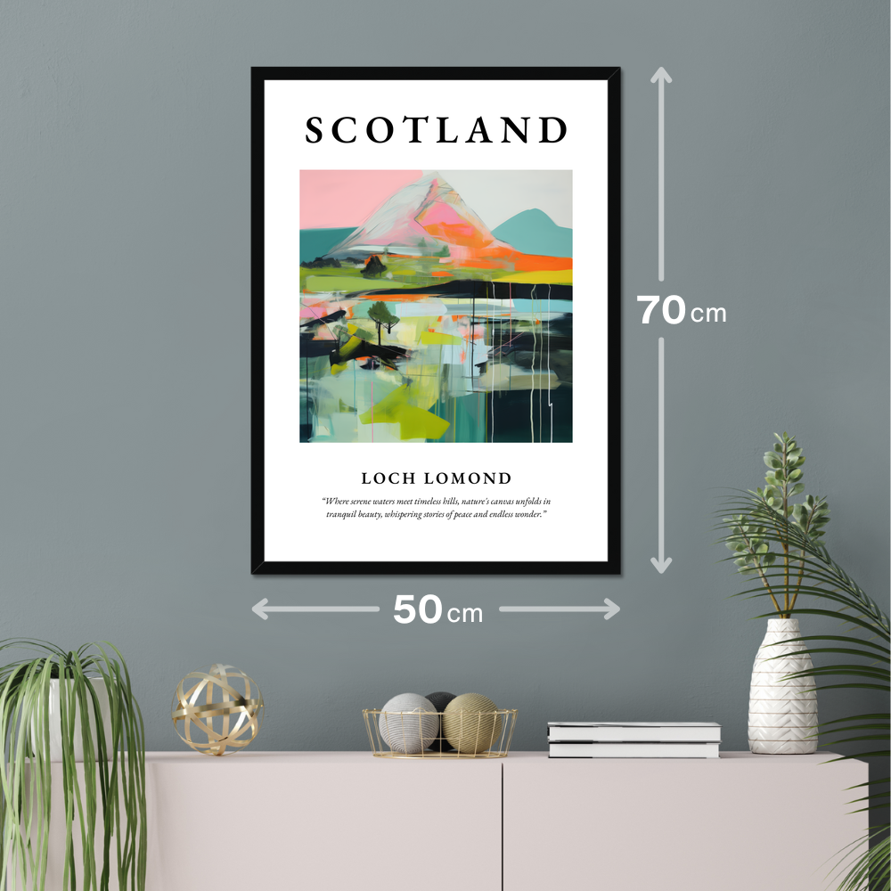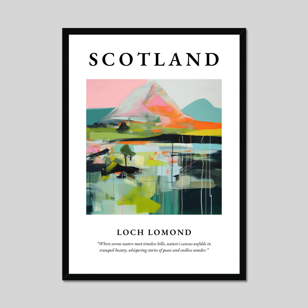 Immerse yourself in the enchanting allure of Scotland with this striking framed poster print, measuring an impressive 50cm x 70cm. Part of our esteemed "Scotland Favourites" collection, this captivating piece showcases the word "SCOTLAND" in bold lettering above a vivid, modern depiction of the serene Loch Lomond. Beneath the painting, you'll find the inspiring quote: "Where serene waters meet timeless hills, nature's canvas unfolds in tranquil beauty, whispering stories of peace and endless wonder."