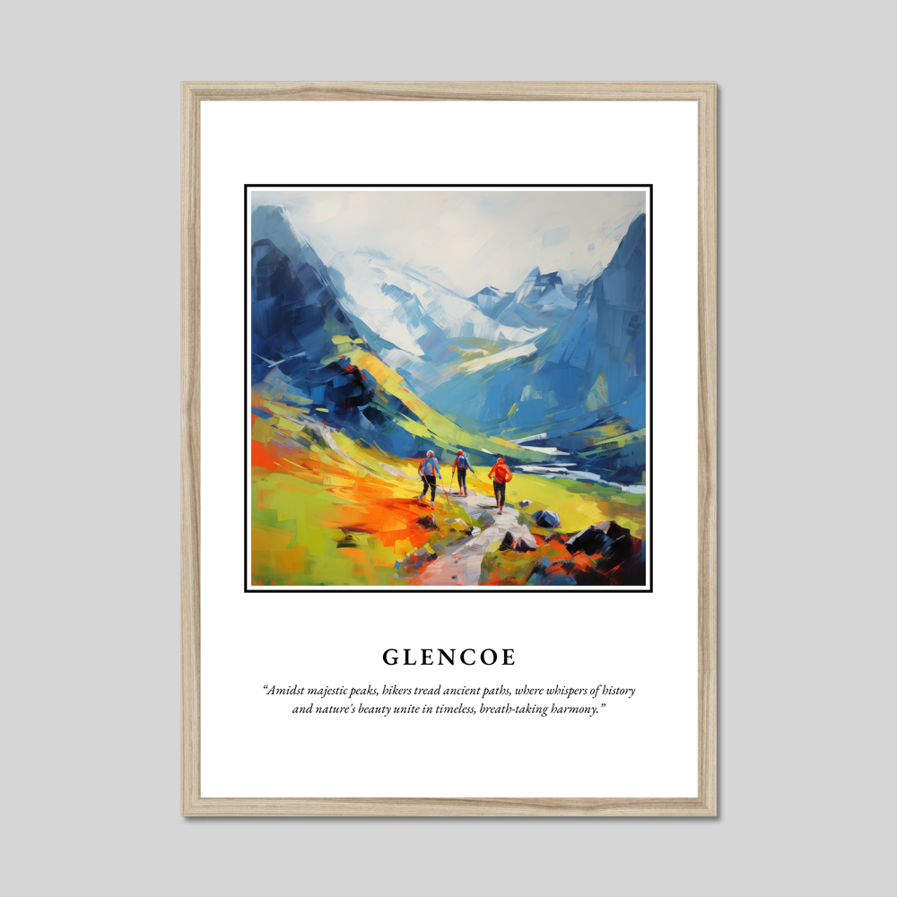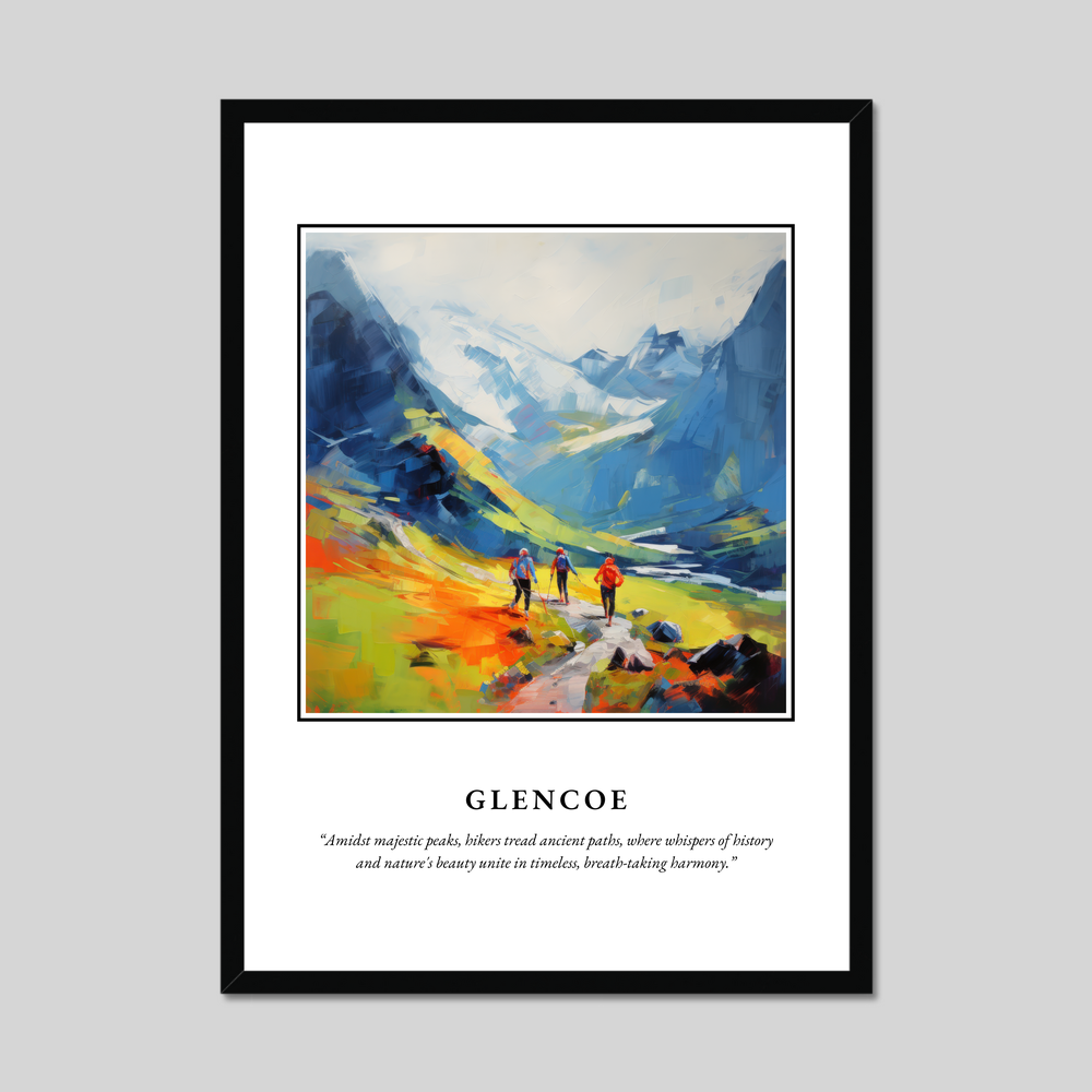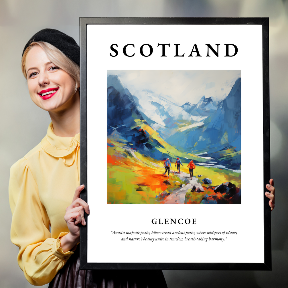 The design features the word “SCOTLAND” in bold lettering, setting the stage for the remarkable painting of Glencoe below. In the style of Color Field, the artwork vividly portrays the serene yet awe-inspiring vistas of Glencoe. Swatches of lush greens and striking blues blend harmoniously, evoking the sweeping valleys and towering peaks. The scene depicts hikers treading ancient paths, a celebration of both nature and history. Beneath, the quote reads: “Amidst majestic peaks, hikers tread ancient paths, where whispers of history and nature's beauty unite in timeless, breath-taking harmony.”