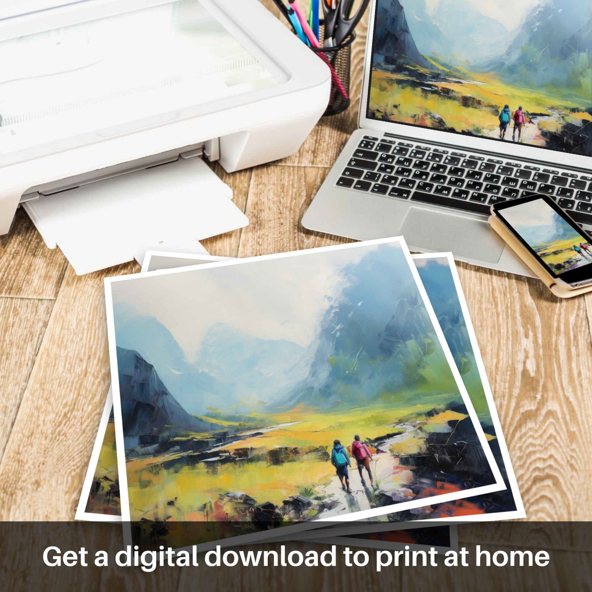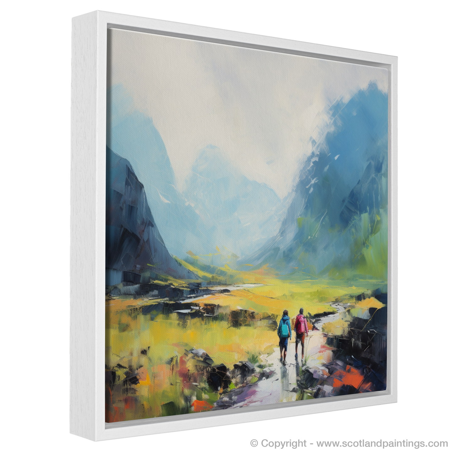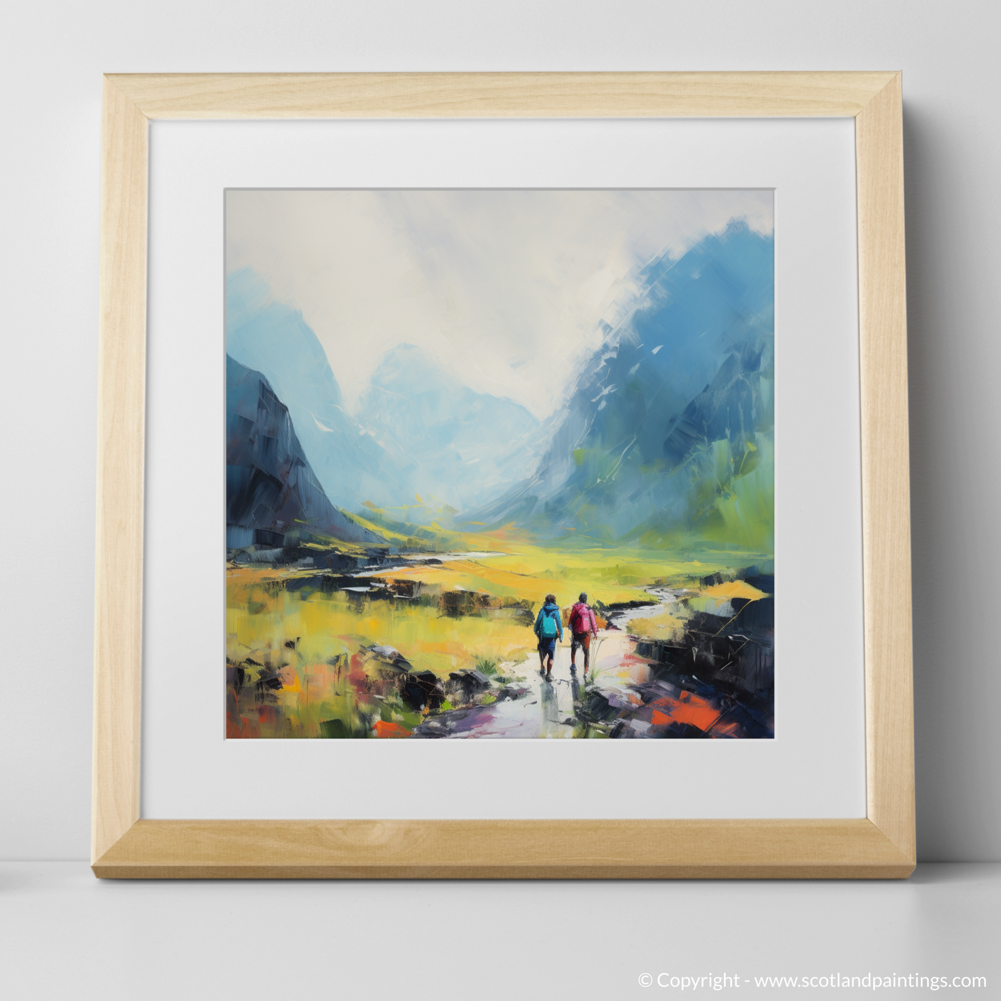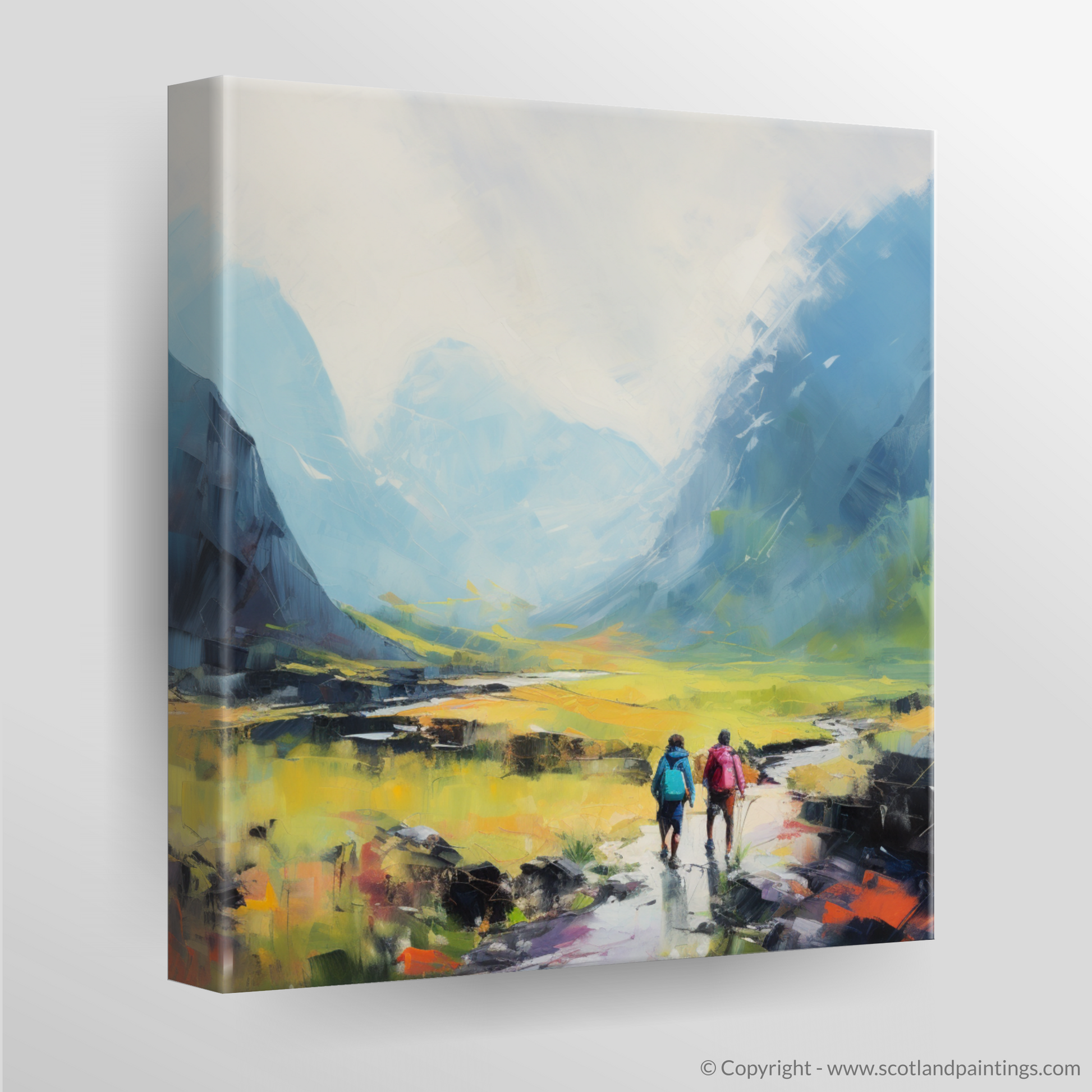 Immerse yourself in the breathtaking vistas of the Scottish Highlands with this evocative piece from our 'Scotland Favourites' collection. Embracing the simplicity and serenity of Color Field art, this image captures two adventurers as they traverse the rugged beauty of Glencoe.