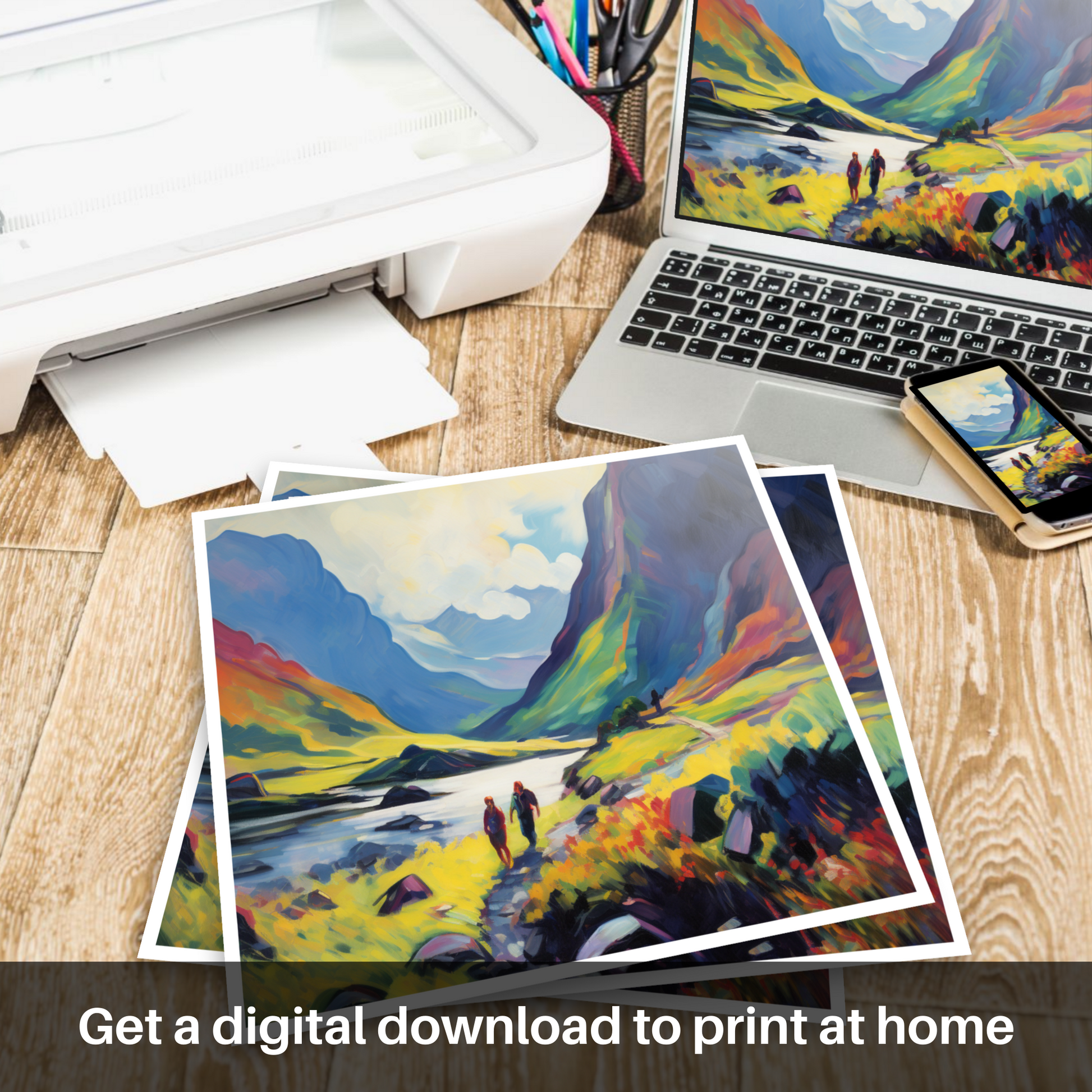 This vivid print brings to life a scene of two adventurers traversing the rugged terrain of Glencoe, a testament to the wanderer's soul and the allure of nature's majesty. With every brushstroke, experience the vibrancy of the highlands: the rich, rolling greens of the hills, the serene blues of the distant lochs, and the fiery oranges and yellows that illuminate the heather and gorse, so characteristic of the Scottish wilds.