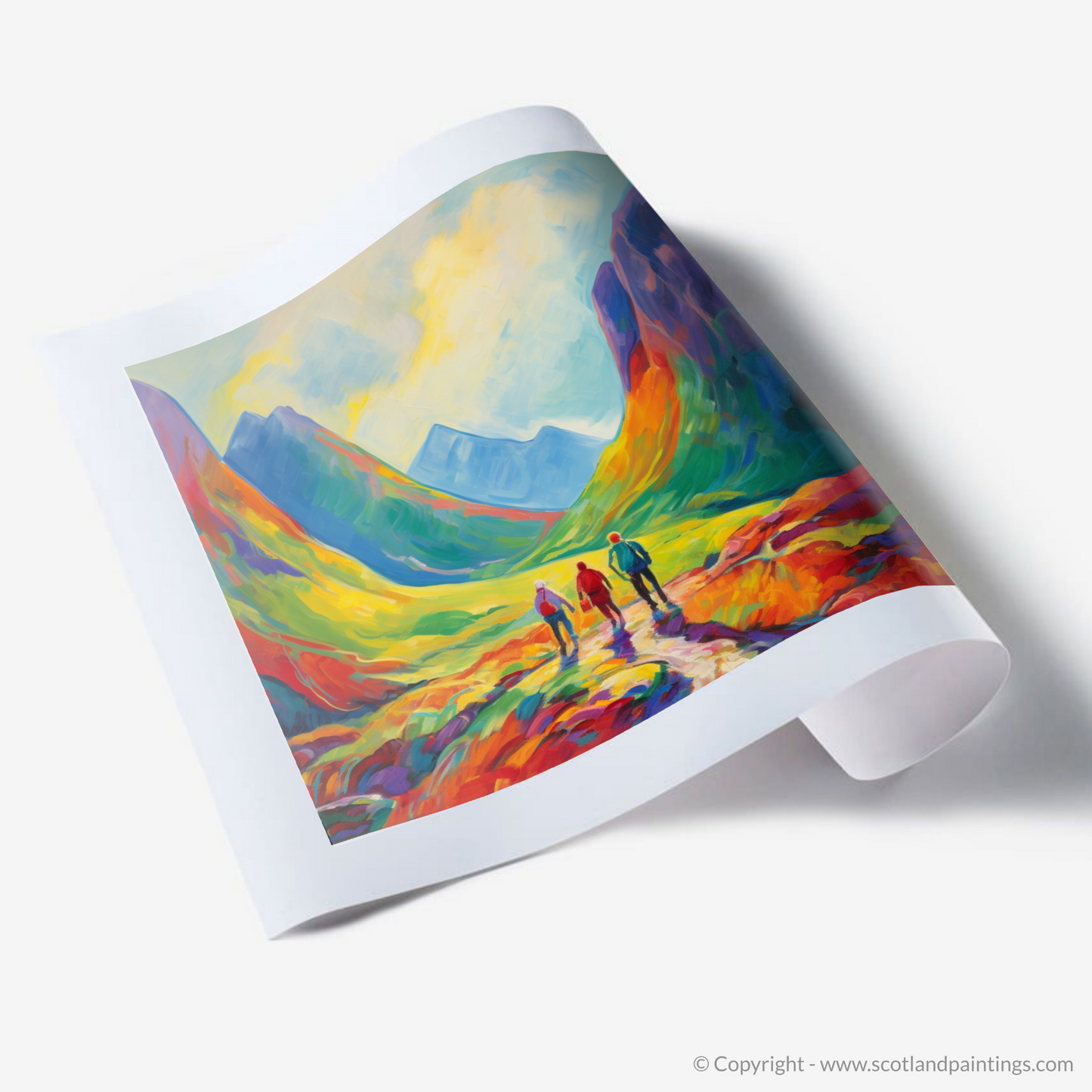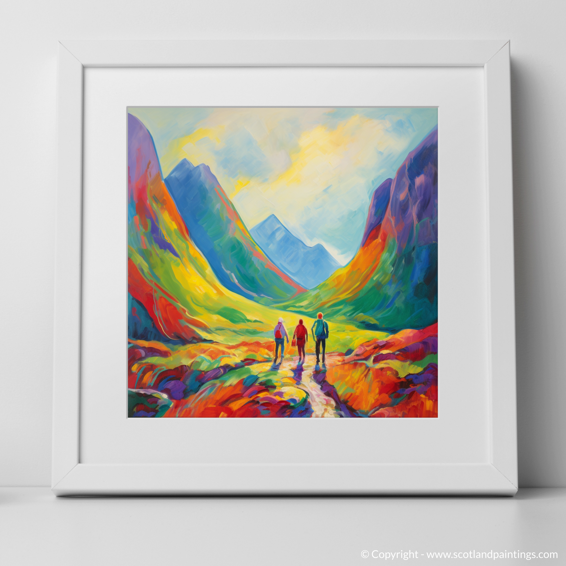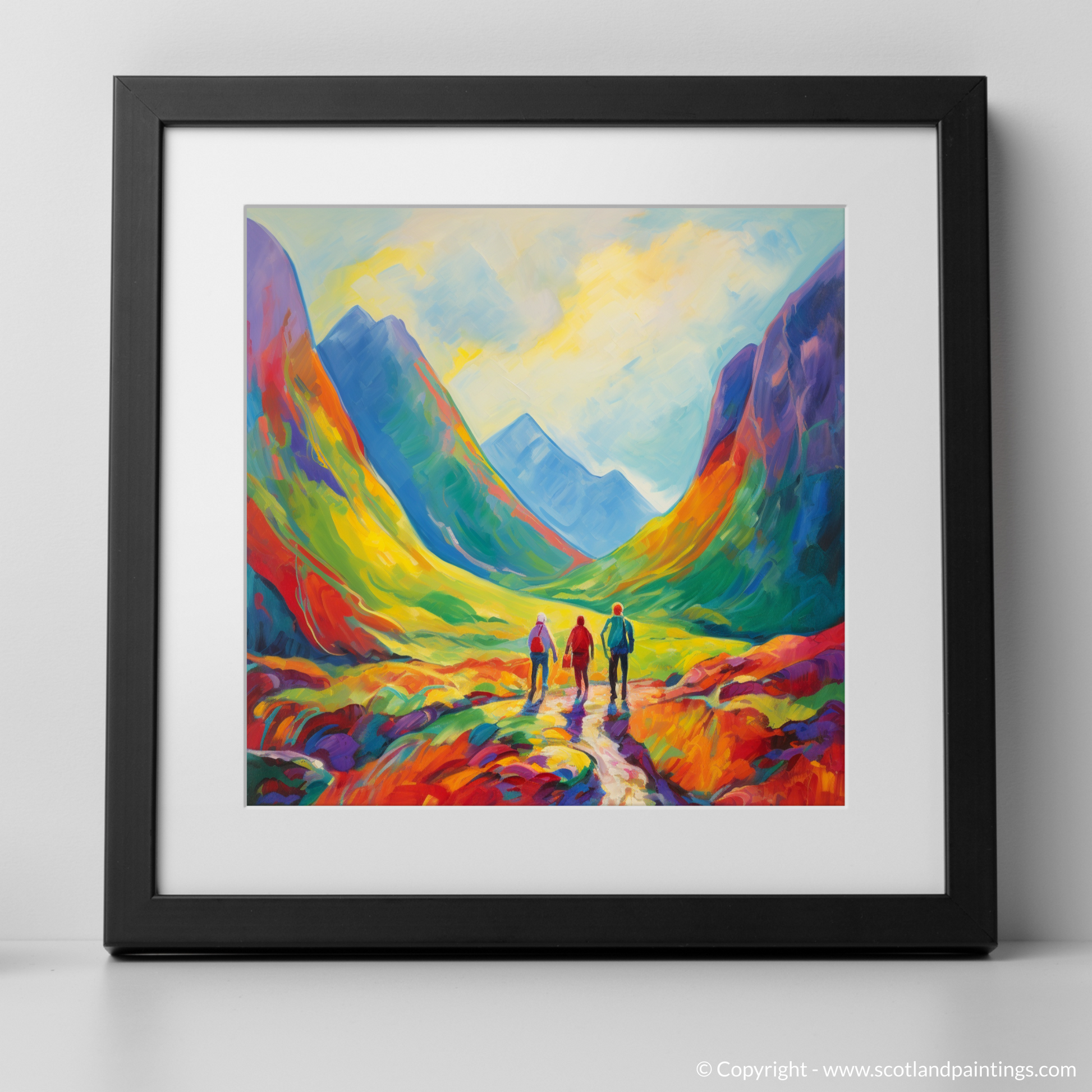Immerse yourself in the vibrant hues and raw beauty of the Scottish Highlands with this mesmerising print. A symphony of colour unfolds across the canvas, where broad strokes of red, orange, and yellow collide with the cool blues and purples, encapsulating the essence of Glencoe. The composition draws you in with three hikers, rendered as silhouettes, embarking on a journey through this dreamlike landscape. Their figures offer a human connection to the wild and abstracted natural world around them.