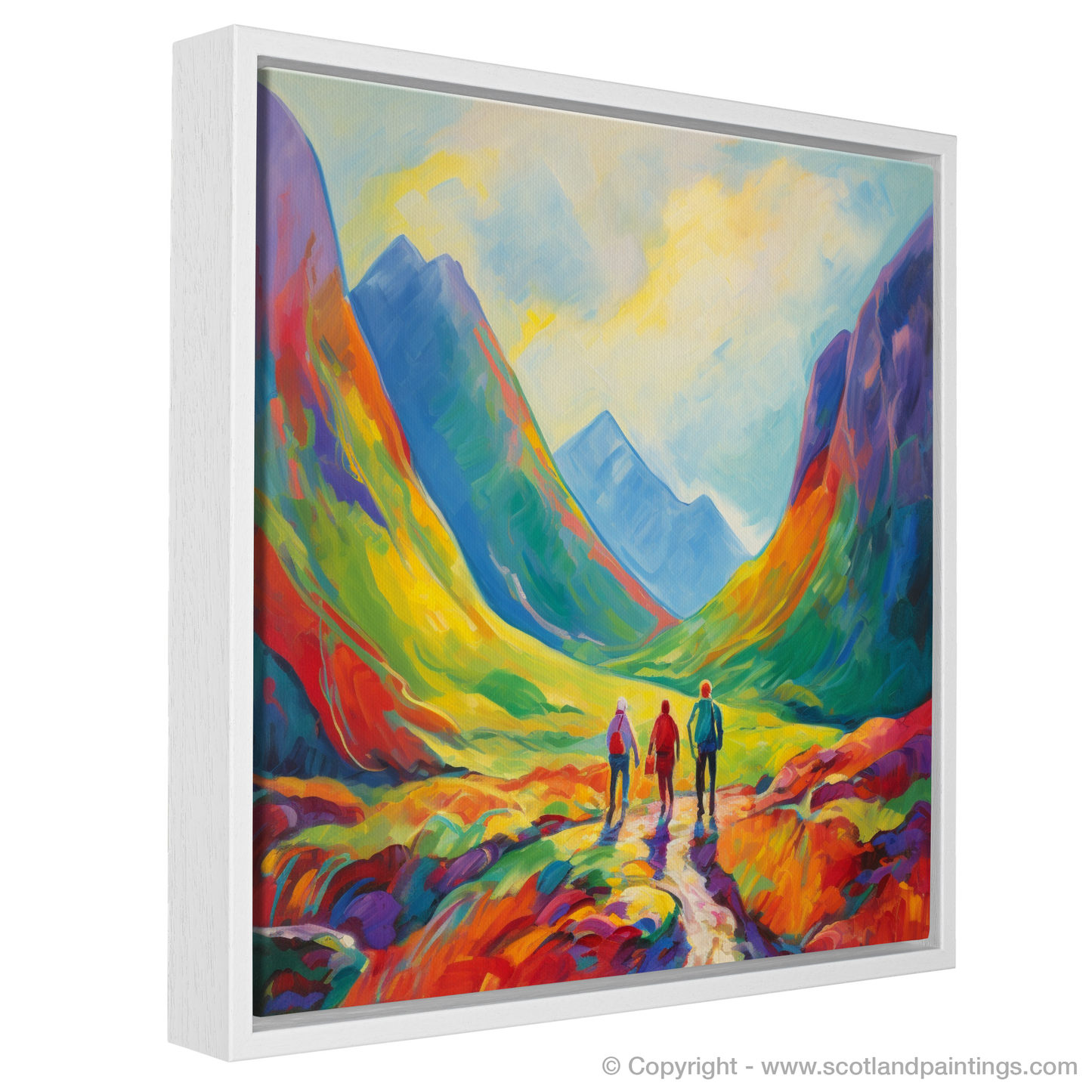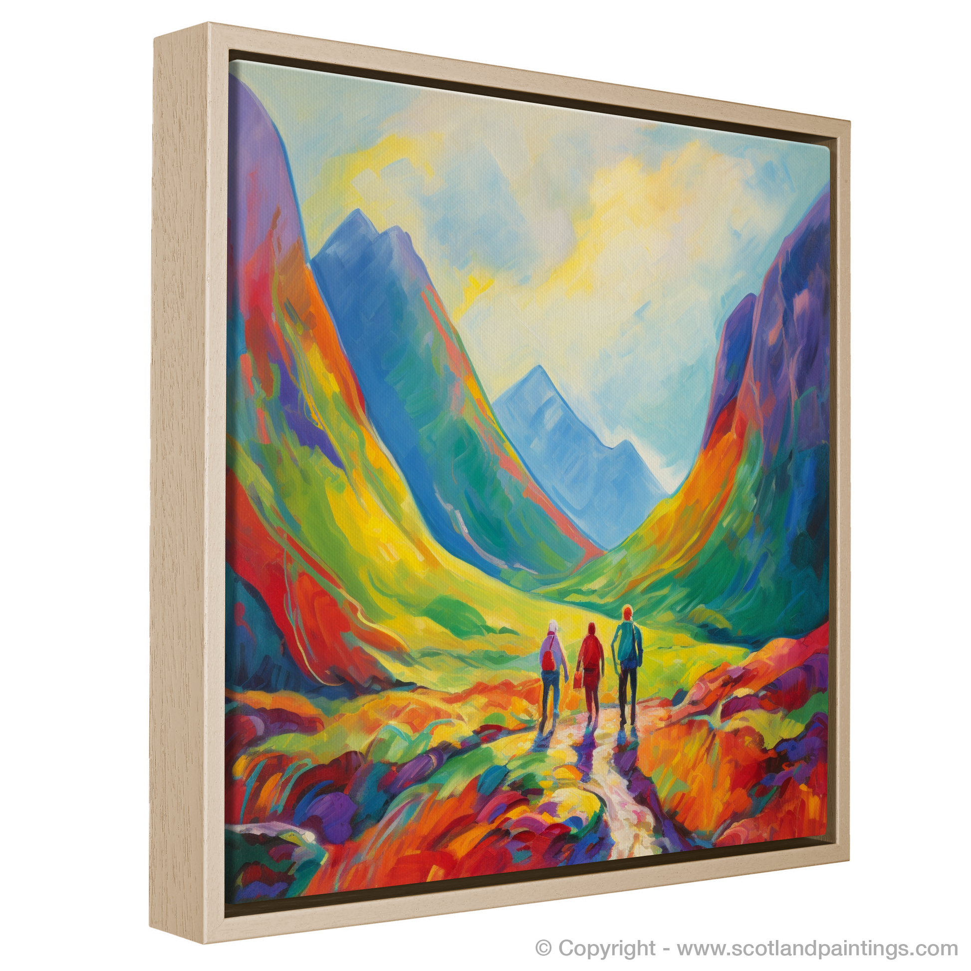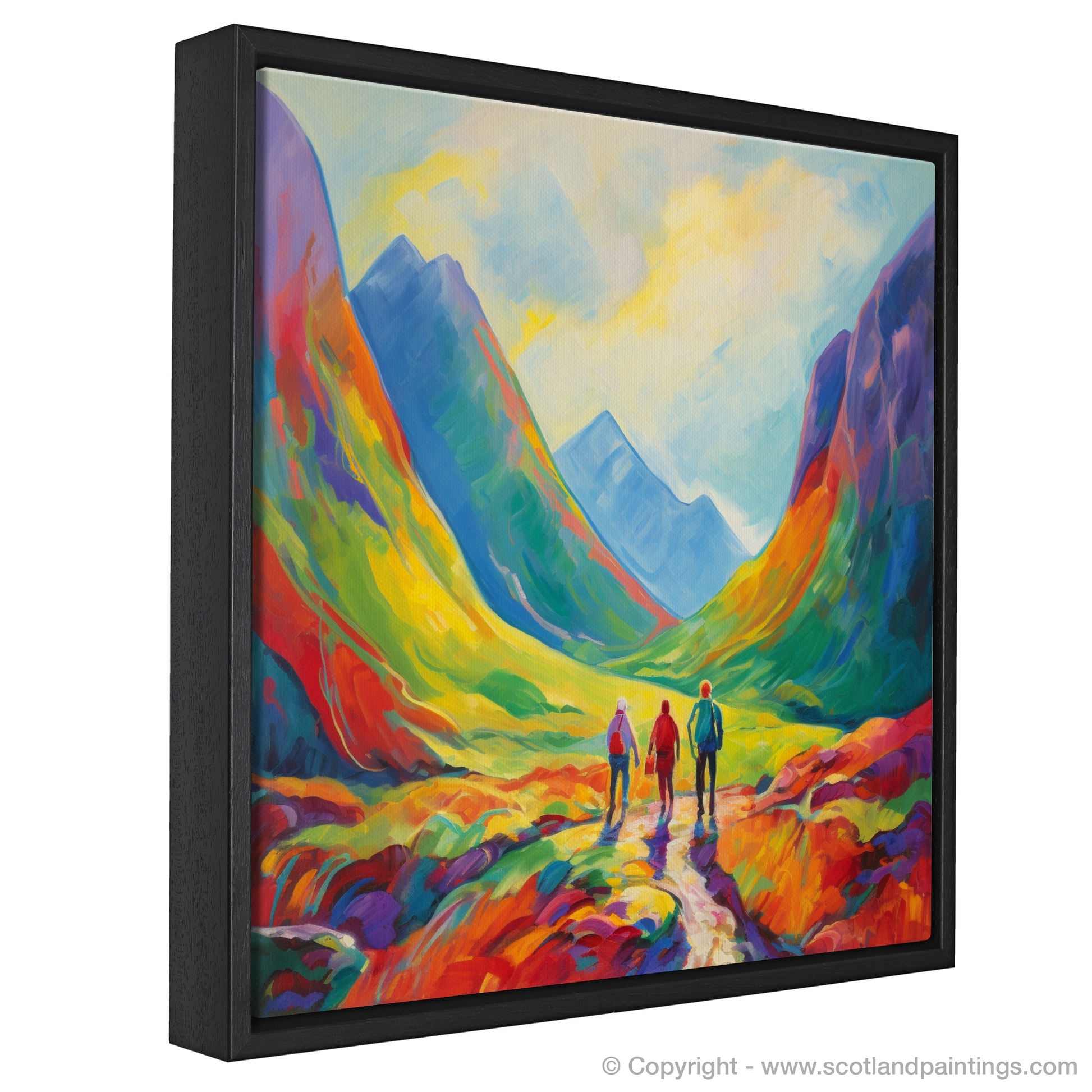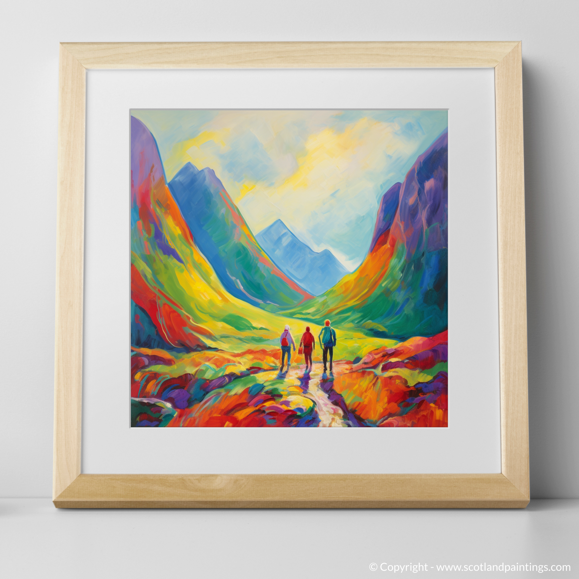 Immerse yourself in the vibrant hues and raw beauty of the Scottish Highlands with this mesmerising print. A symphony of colour unfolds across the canvas, where broad strokes of red, orange, and yellow collide with the cool blues and purples, encapsulating the essence of Glencoe. The composition draws you in with three hikers, rendered as silhouettes, embarking on a journey through this dreamlike landscape. Their figures offer a human connection to the wild and abstracted natural world around them.