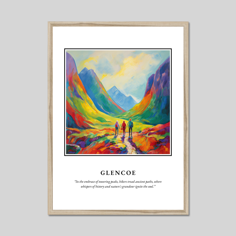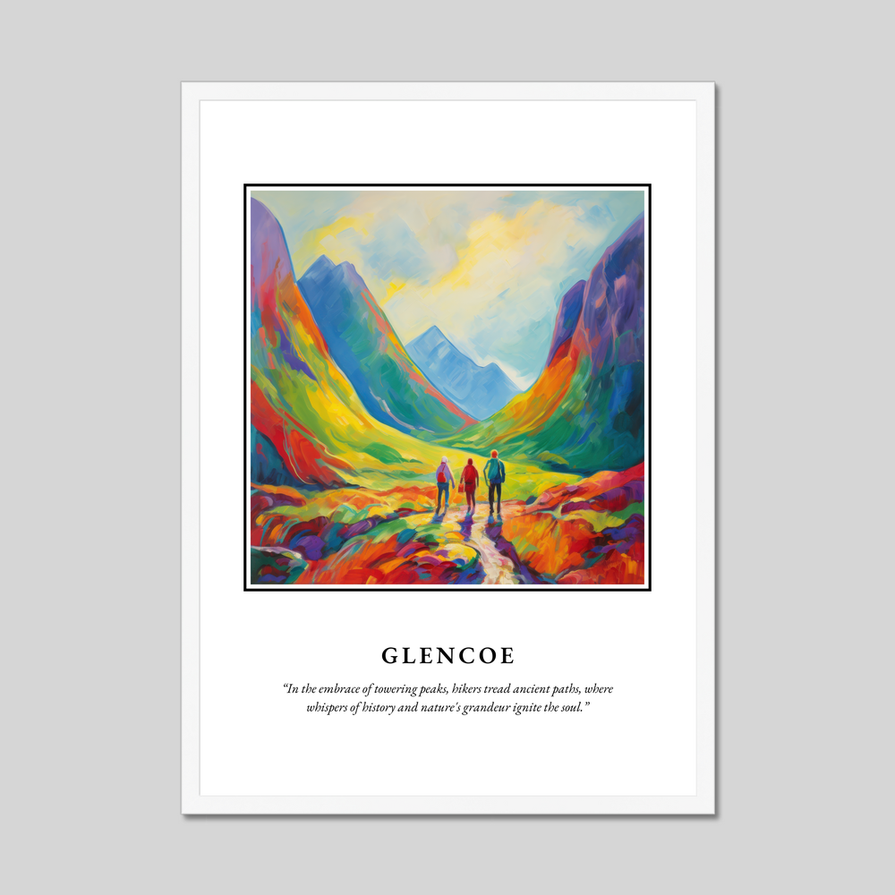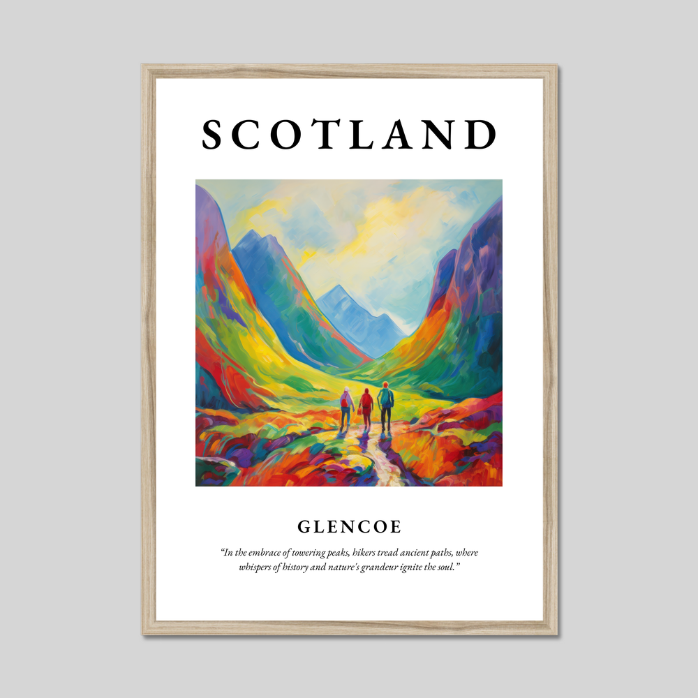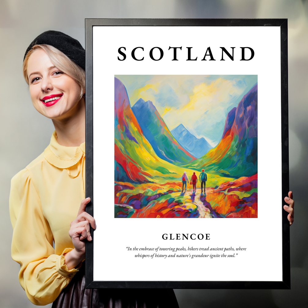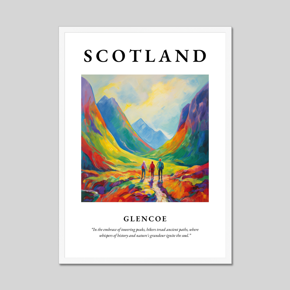 The word “SCOTLAND” commands attention at the top of the poster, setting the stage for the vivid colour field painting of Glencoe beneath. This captivating artwork, which deftly marries vibrant hues and soft textures, captures the dramatic landscape of Glencoe in a way that sparks imagination and nostalgia. Below the painting, the quote, “In the embrace of towering peaks, hikers tread ancient paths, where whispers of history and nature's grandeur ignite the soul,” offers a poetic nod to those who have set foot in this majestic valley.