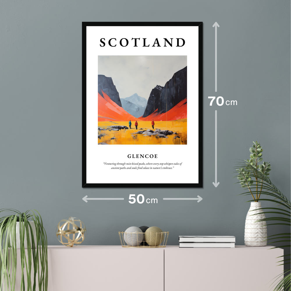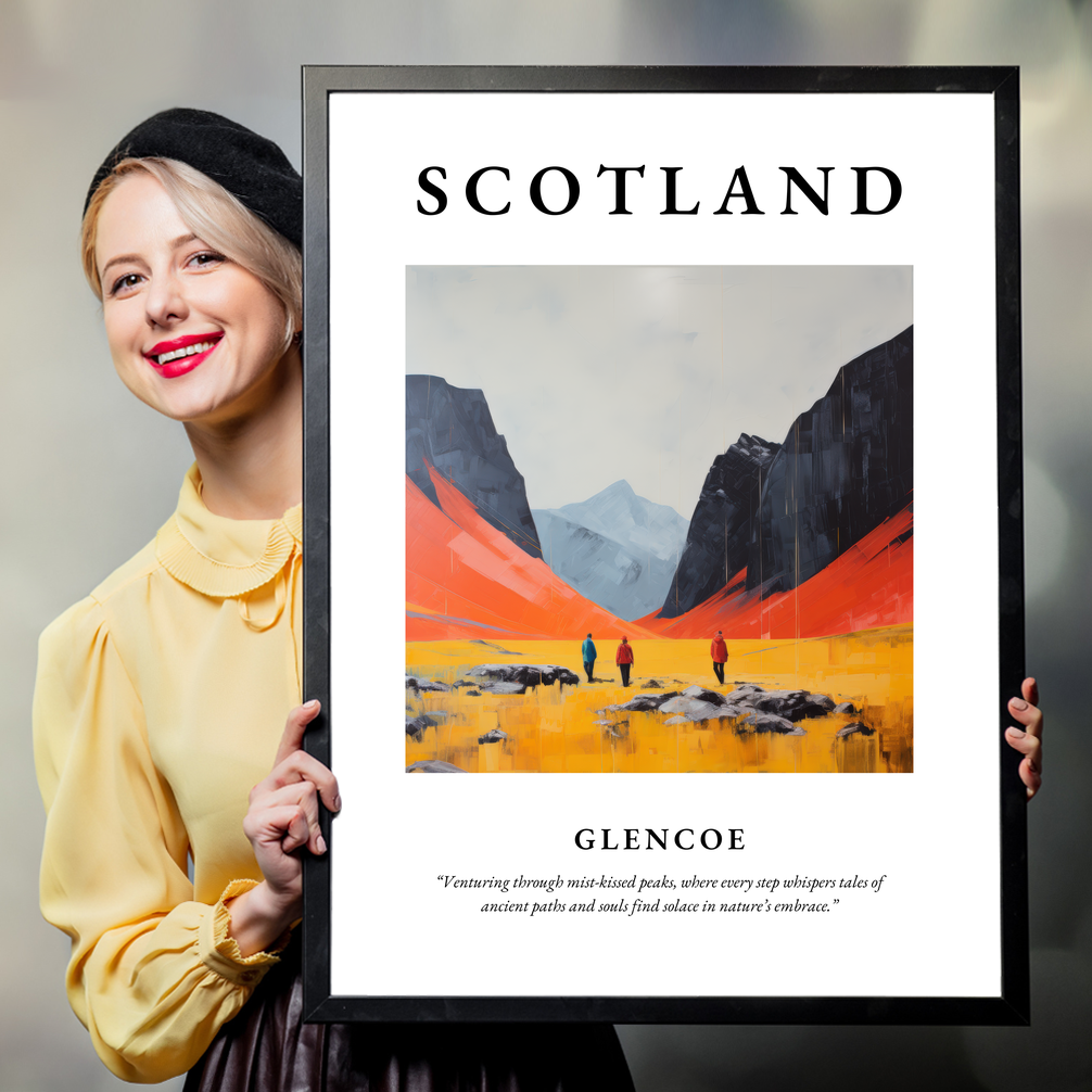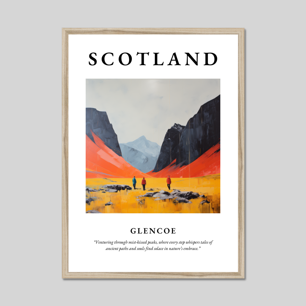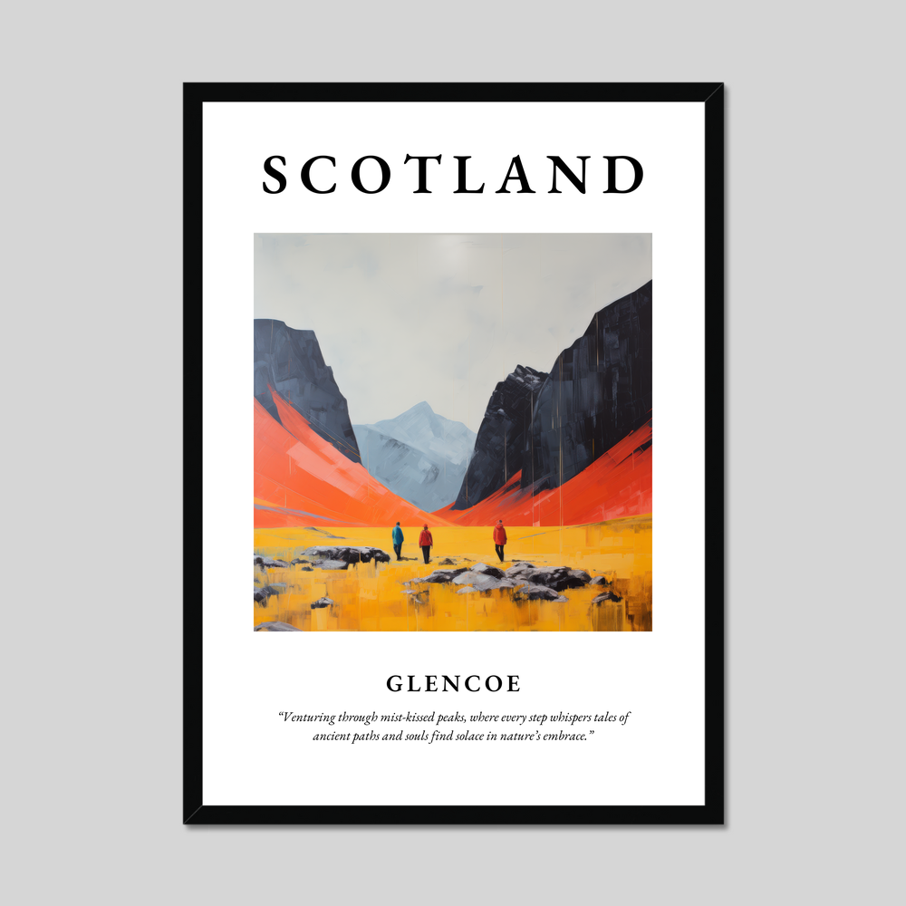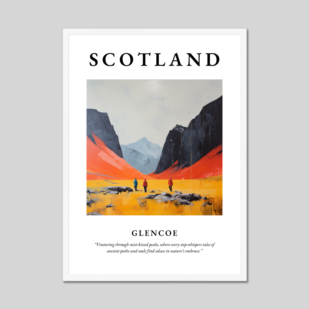 The poster prominently features "SCOTLAND" in bold lettering, guiding your gaze to the minimalist painting of Glencoe. This artwork beautifully balances simplicity with depth, using bold splashes of colour and stark shapes to evoke the dramatic landscapes of one of Scotland’s most cherished natural wonders. Below, the evocative quote, "Venturing through mist-kissed peaks, where every step whispers tales of ancient paths and souls find solace in nature’s embrace," transports you to a world where nature and history intertwine.