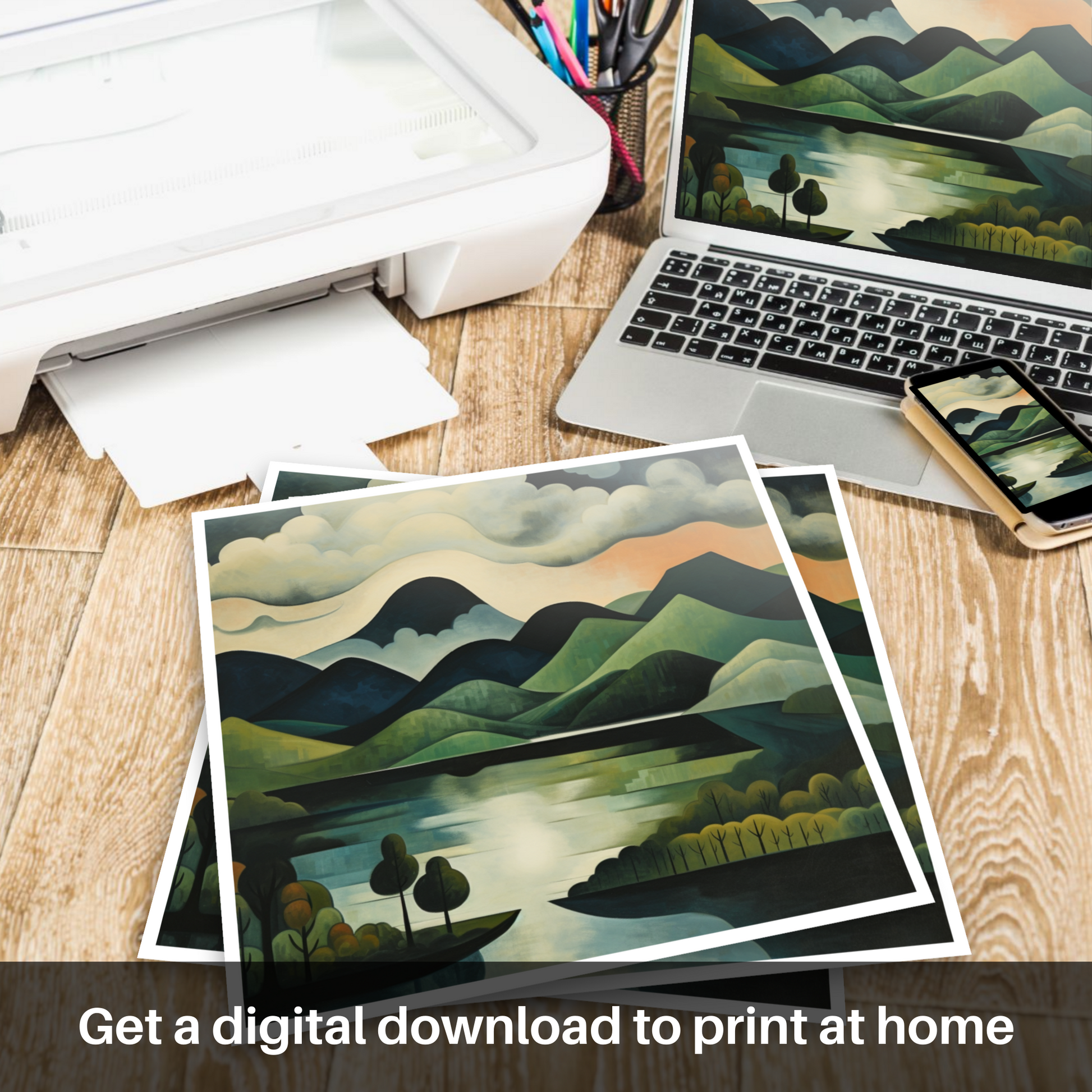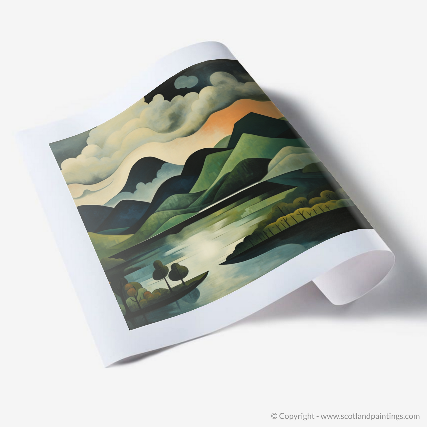 Stripped of superfluous detail, the abstraction captures the essence of Loch Lomond's natural grandeur through geometrical simplification – layering hills roll rhythmically, and their sharp peaks pierce the horizon. The streamlined trees and minimalist boats on the loch's surface offer a sense of scale and remind us of the harmonious relationship between nature and those who wander within it.