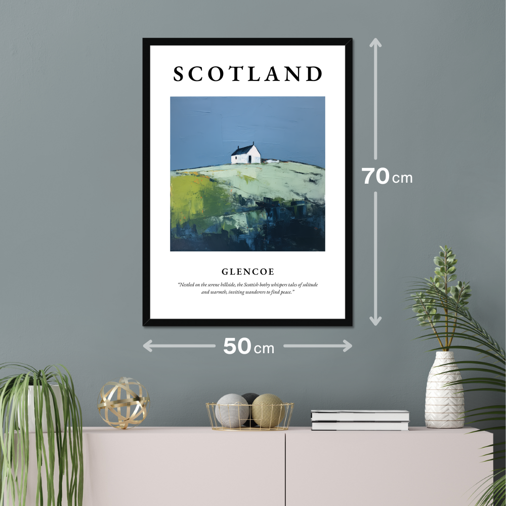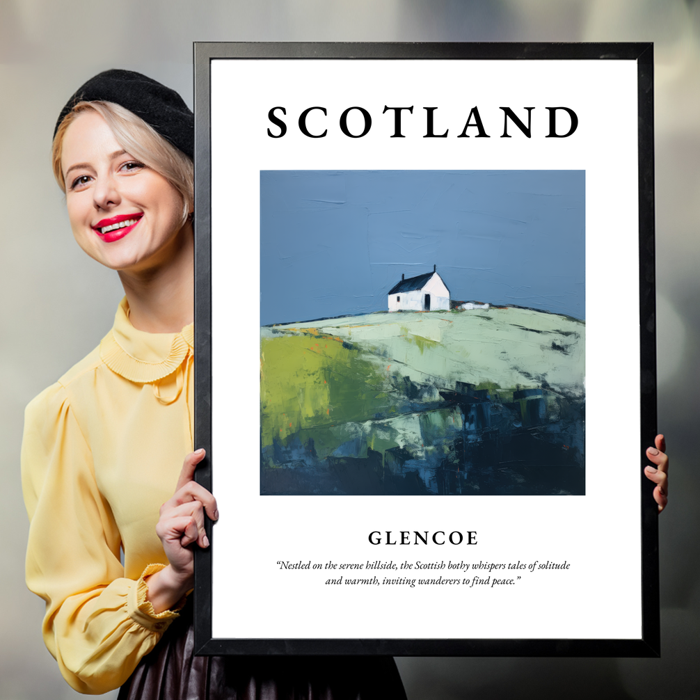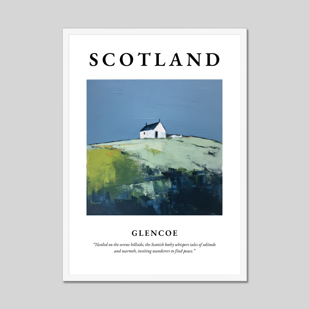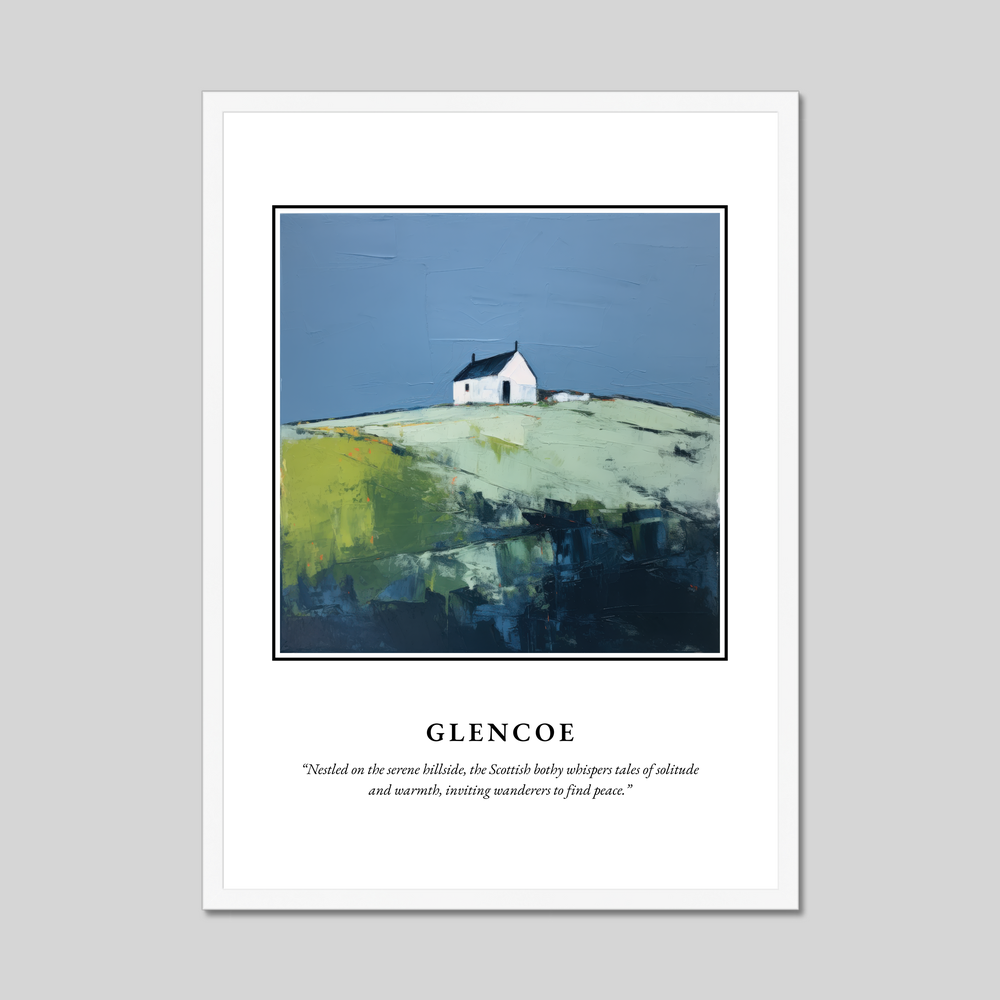 Below the title lies a captivating painting of Glencoe, rendered in a minimalist style that breathes tranquillity into any room. The artwork captures the essence of a Scottish bothy, nestled amid the verdant hillsides, under an expansive, moody sky. This visual echo is beautifully complemented by the quote beneath, “Nestled on the serene hillside, the Scottish bothy whispers tales of solitude and warmth, inviting wanderers to find peace.”