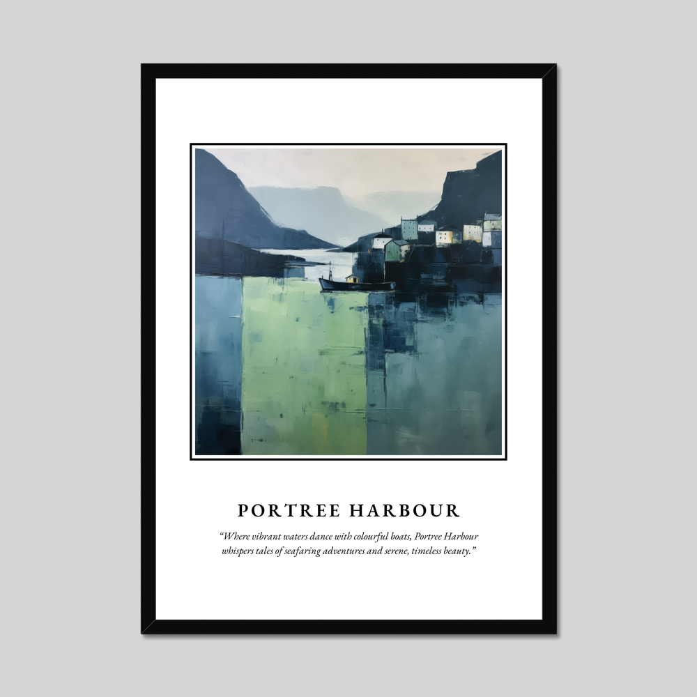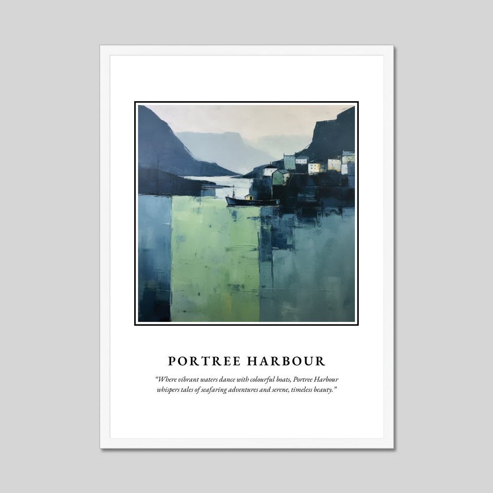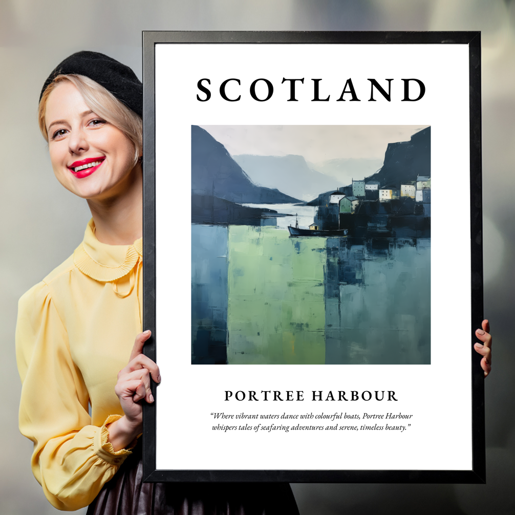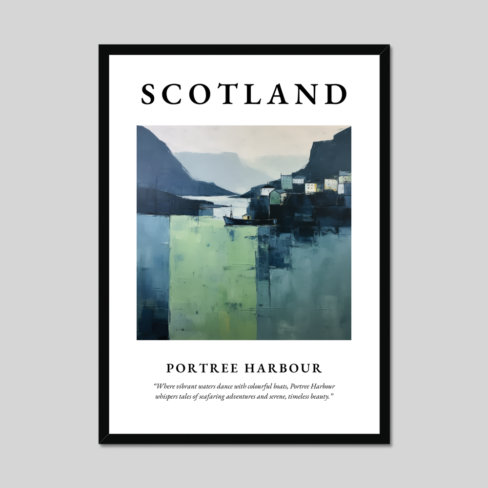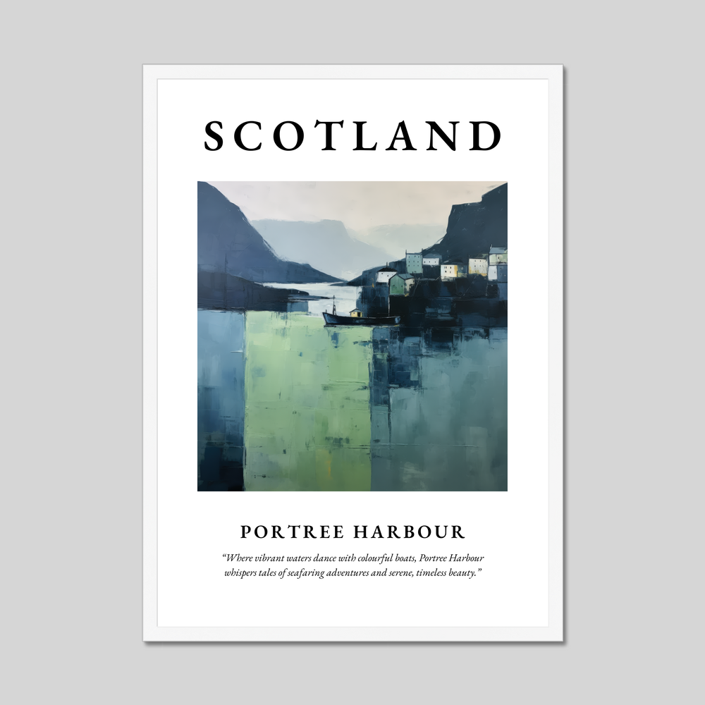 The poster features a minimalist depiction of Portree Harbour, its vibrant waters portrayed with sweeping expanses of fresh greens and deep blues. The stark yet serene composition captures the harbour's quaint cottages and bobbing boats, all simplified into geometric forms that whisper of timeless beauty and maritime tales. The word “SCOTLAND” crowns the scene in bold lettering, beneath which the gentle prose “Where vibrant waters dance with colourful boats, Portree Harbour whispers tales of seafaring adventures and serene, timeless beauty.” further draws you into the harbour's captivating world.
