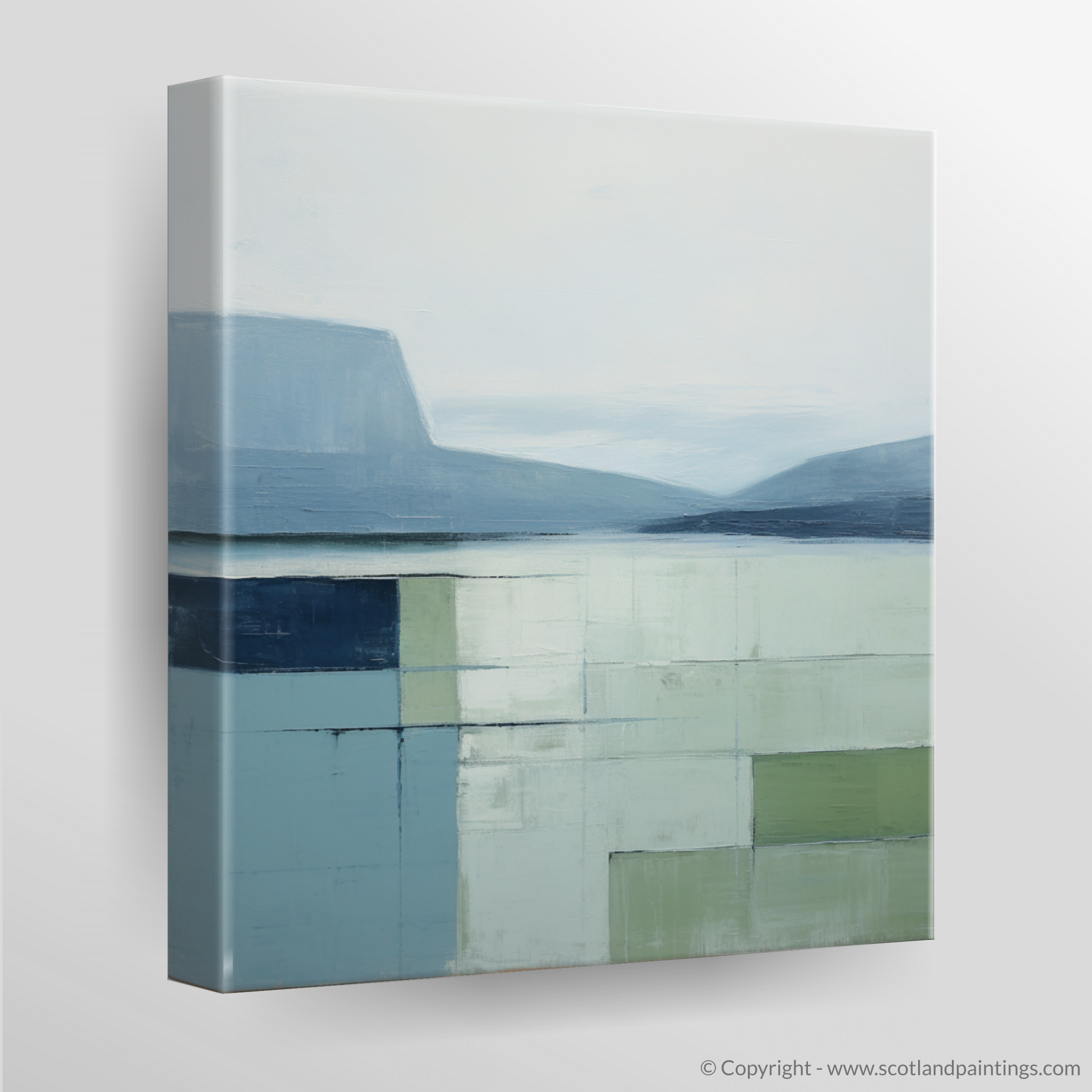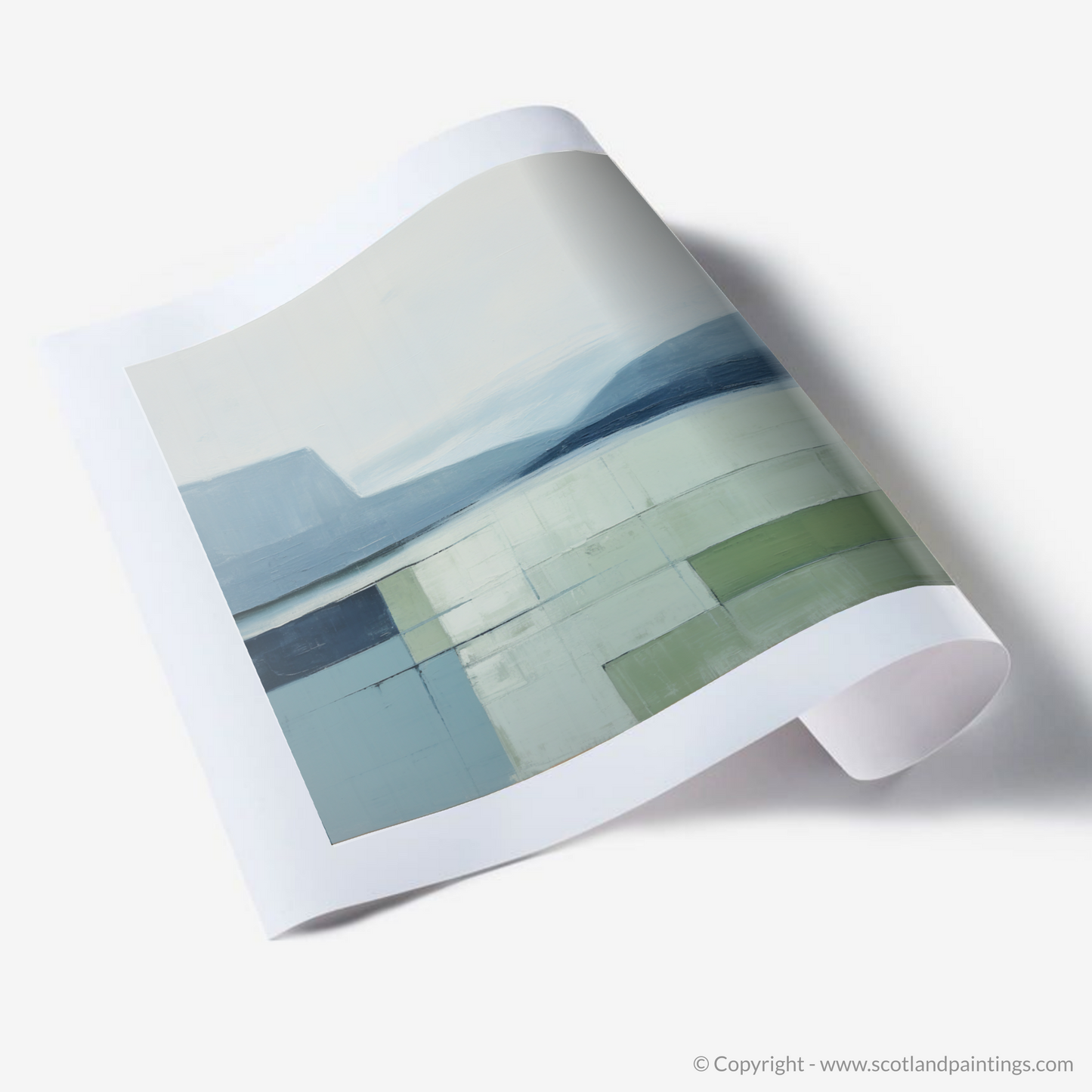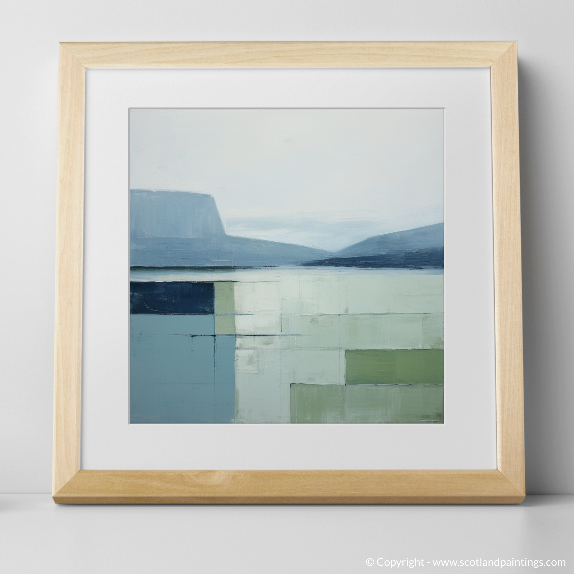 Immerse yourself in the serene beauty of Loch Maree with this exquisite minimalist print. Invoking the calm and tranquil atmosphere of the Scottish Highlands, the artwork presents a harmonious blend of muted tones and subtle textural depths. Cool shades of blue and gentle greys dominate the upper portion, conjuring images of a placid sky softly merging with the distant hills reflected by the still waters. Below, a carefully curated assemblage of pale greens and washed blues captures the essence of the loch's surface, abstracted into a geometric quilt of colour blocks that suggest a serene, mirrored expanse.