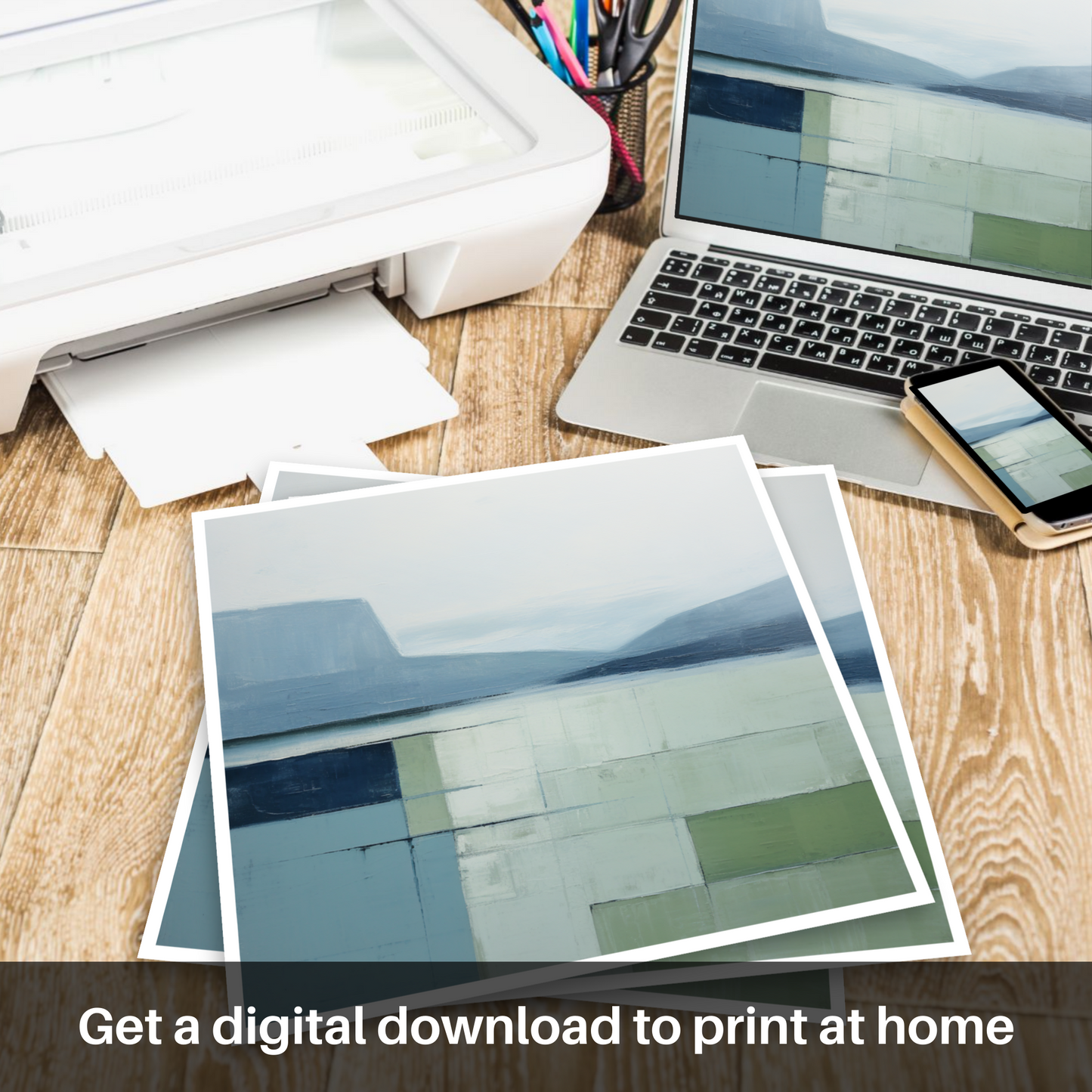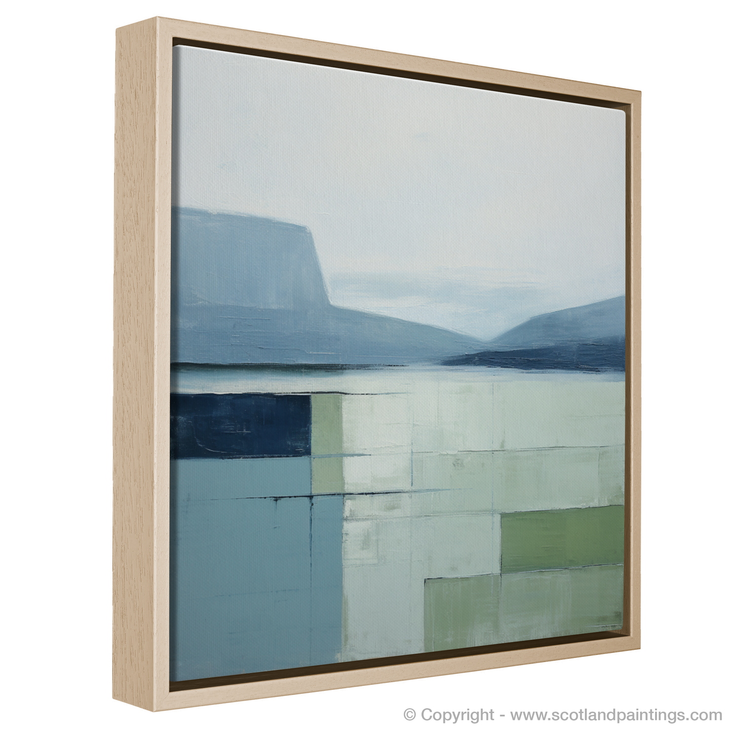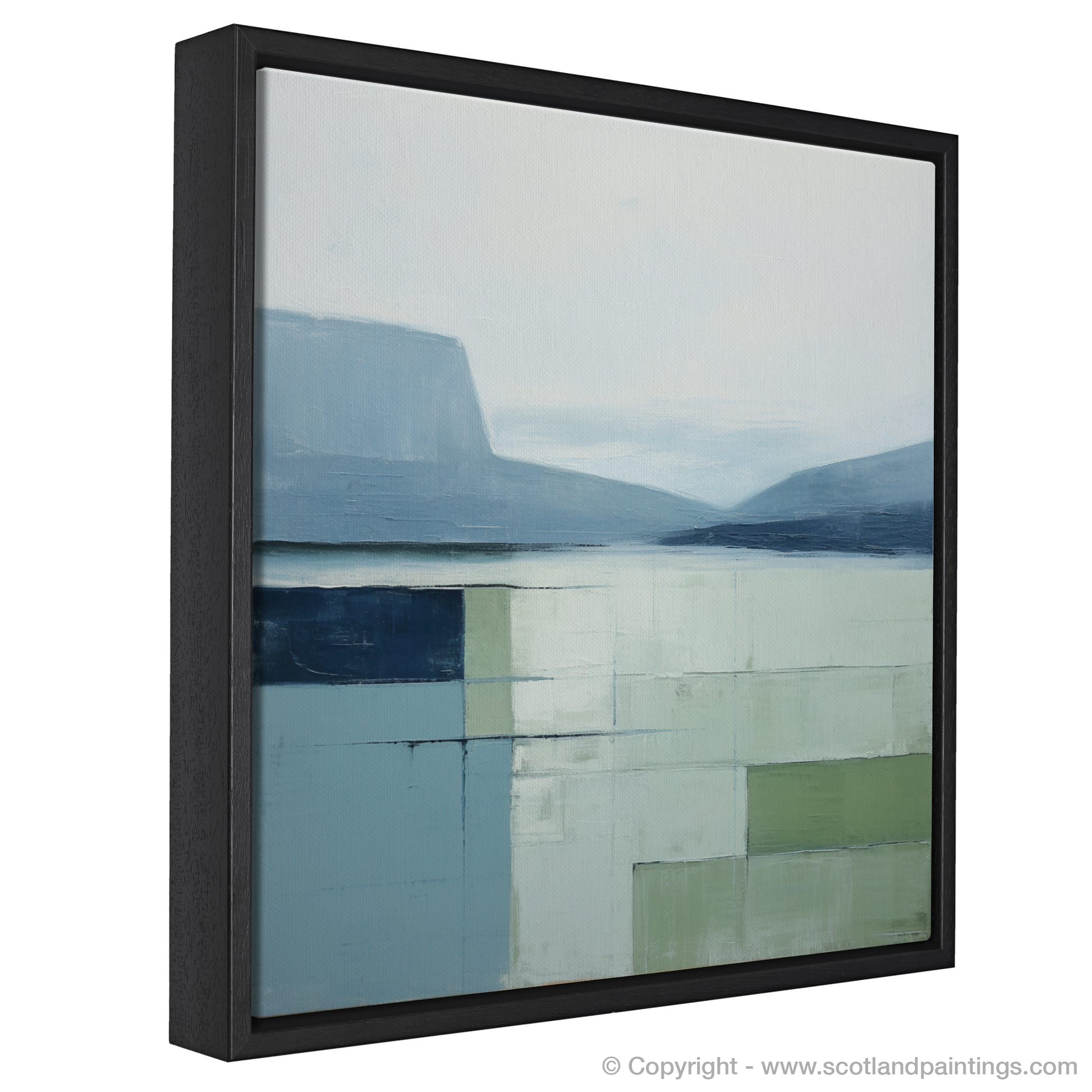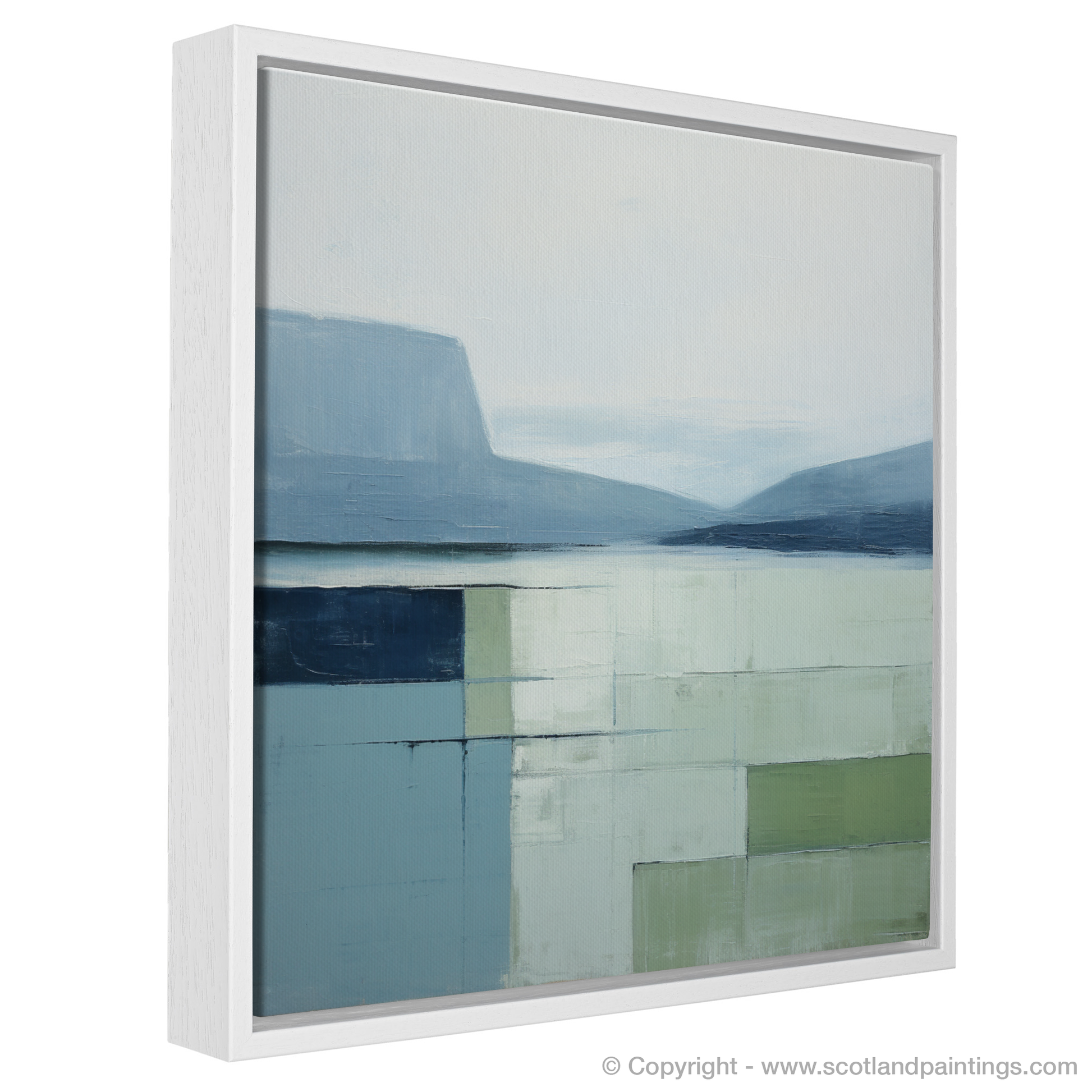 Immerse yourself in the serene beauty of Loch Maree with this exquisite minimalist print. Invoking the calm and tranquil atmosphere of the Scottish Highlands, the artwork presents a harmonious blend of muted tones and subtle textural depths. Cool shades of blue and gentle greys dominate the upper portion, conjuring images of a placid sky softly merging with the distant hills reflected by the still waters. Below, a carefully curated assemblage of pale greens and washed blues captures the essence of the loch's surface, abstracted into a geometric quilt of colour blocks that suggest a serene, mirrored expanse.