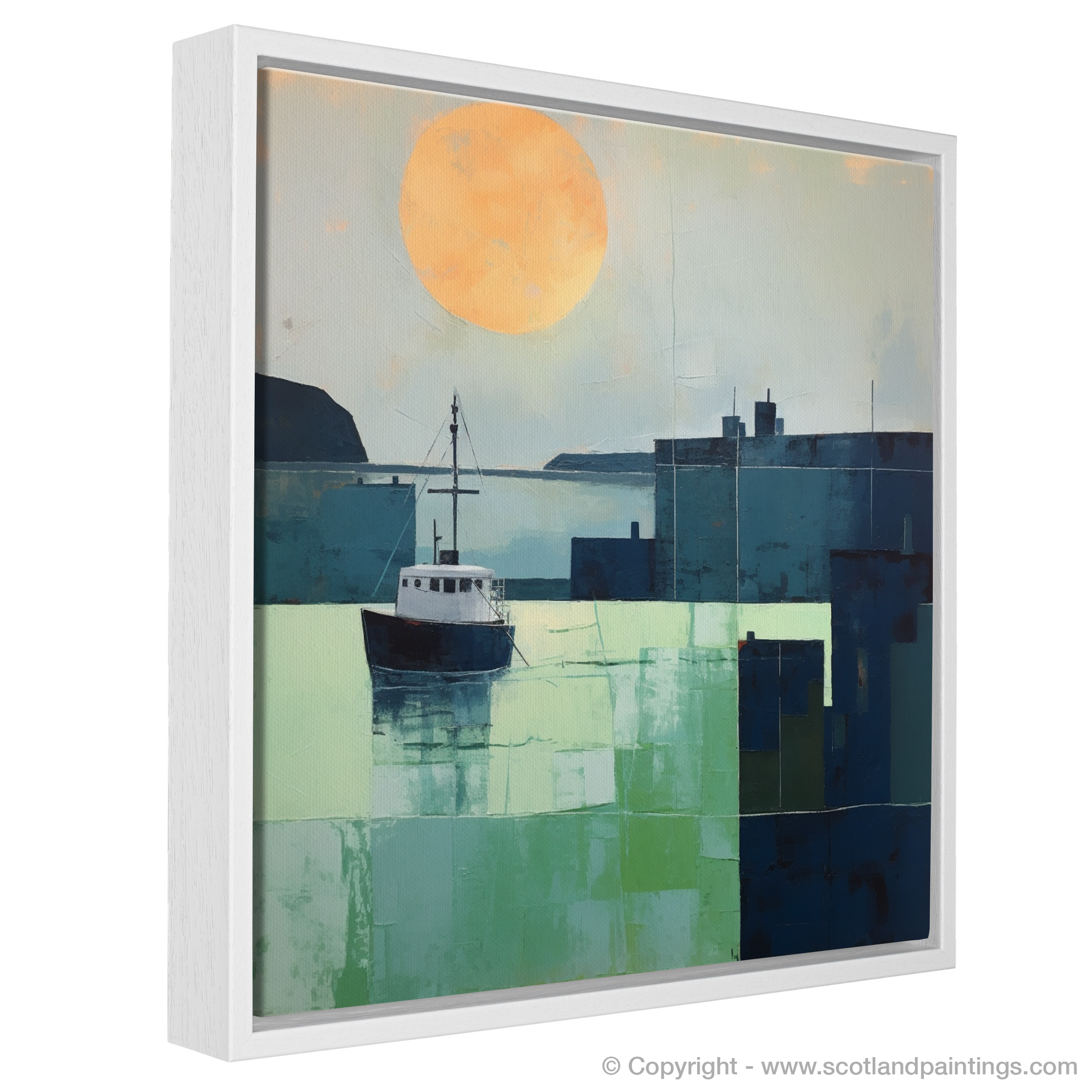 Stark, clean lines define the silhouetted shapes of the distant headlands and the sturdy structures surrounding the harbour. A solitary moored boat, rendered with precise, understated detailing, floats peacefully, evoking the stillness of the scene. An air of solitude prevails, inviting one's gaze to linger and explore the nuanced interplay between light and shadow, colour and form.