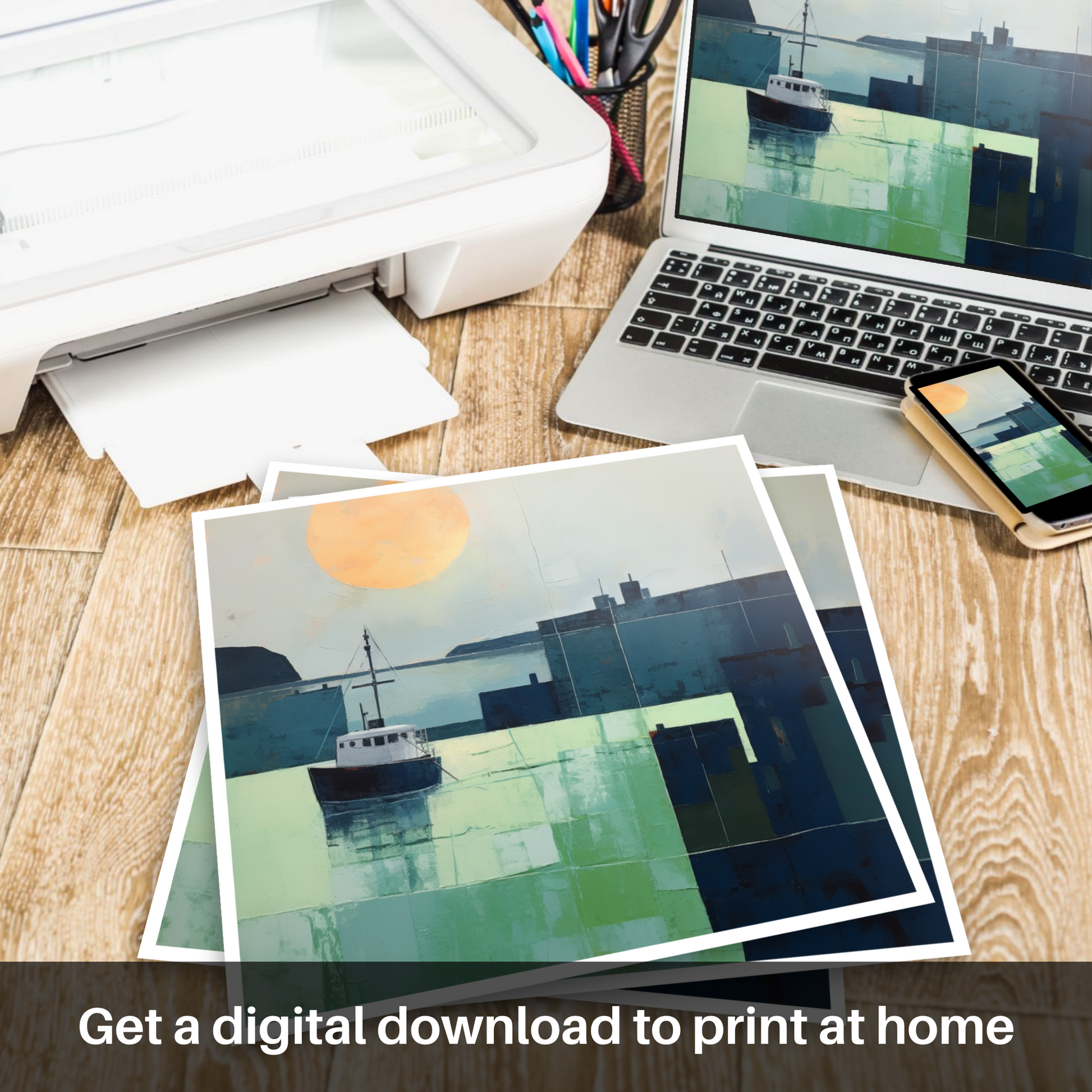 A glowing orb of warm, mellow orange, the setting sun takes centre stage against a dusky sky, its reflection a shimmering path across the quiet water. Below, the cool greens and blues of the harbour waters are abstracted into a geometric mosaic, interspersed with gentle ripples that suggest a gentle evening breeze.