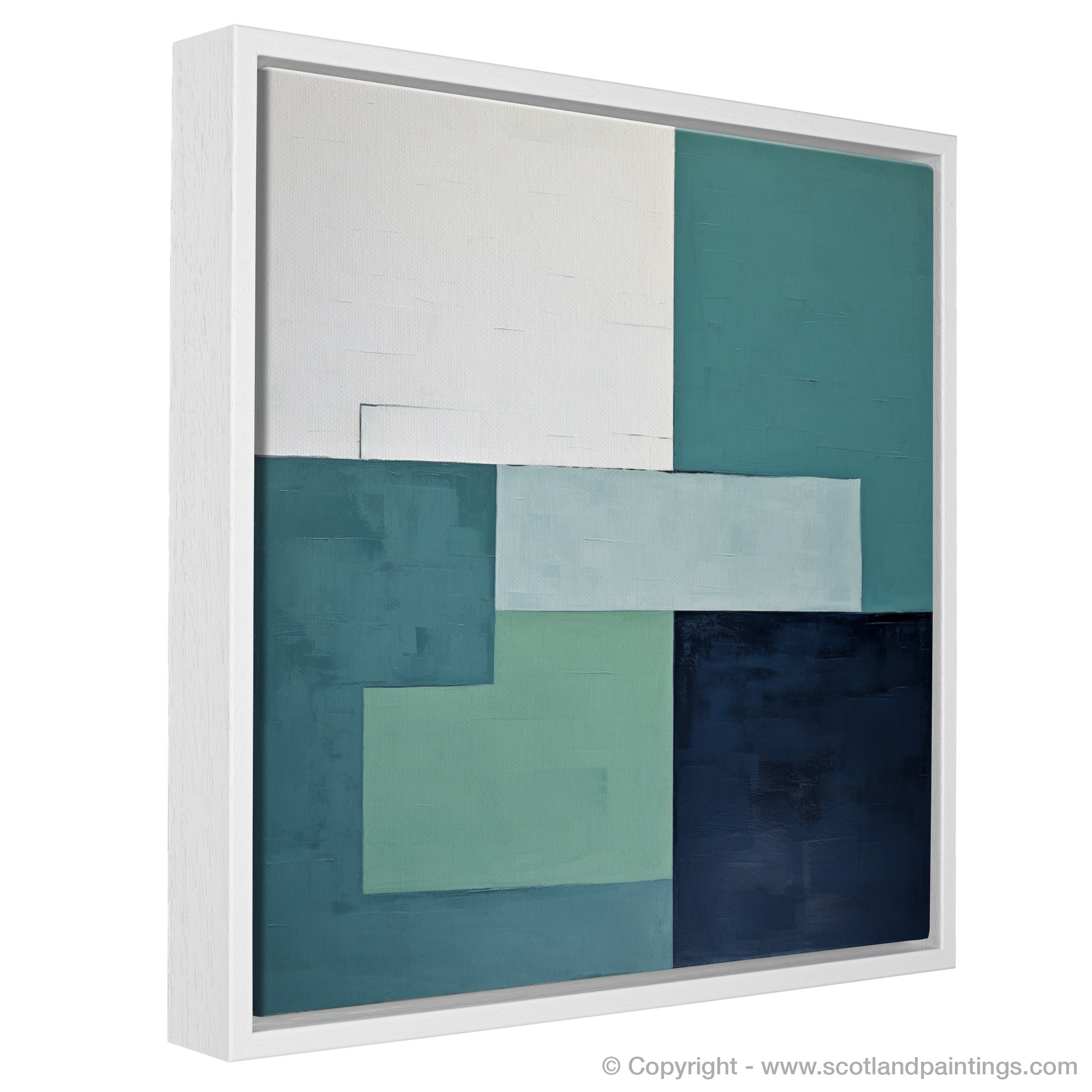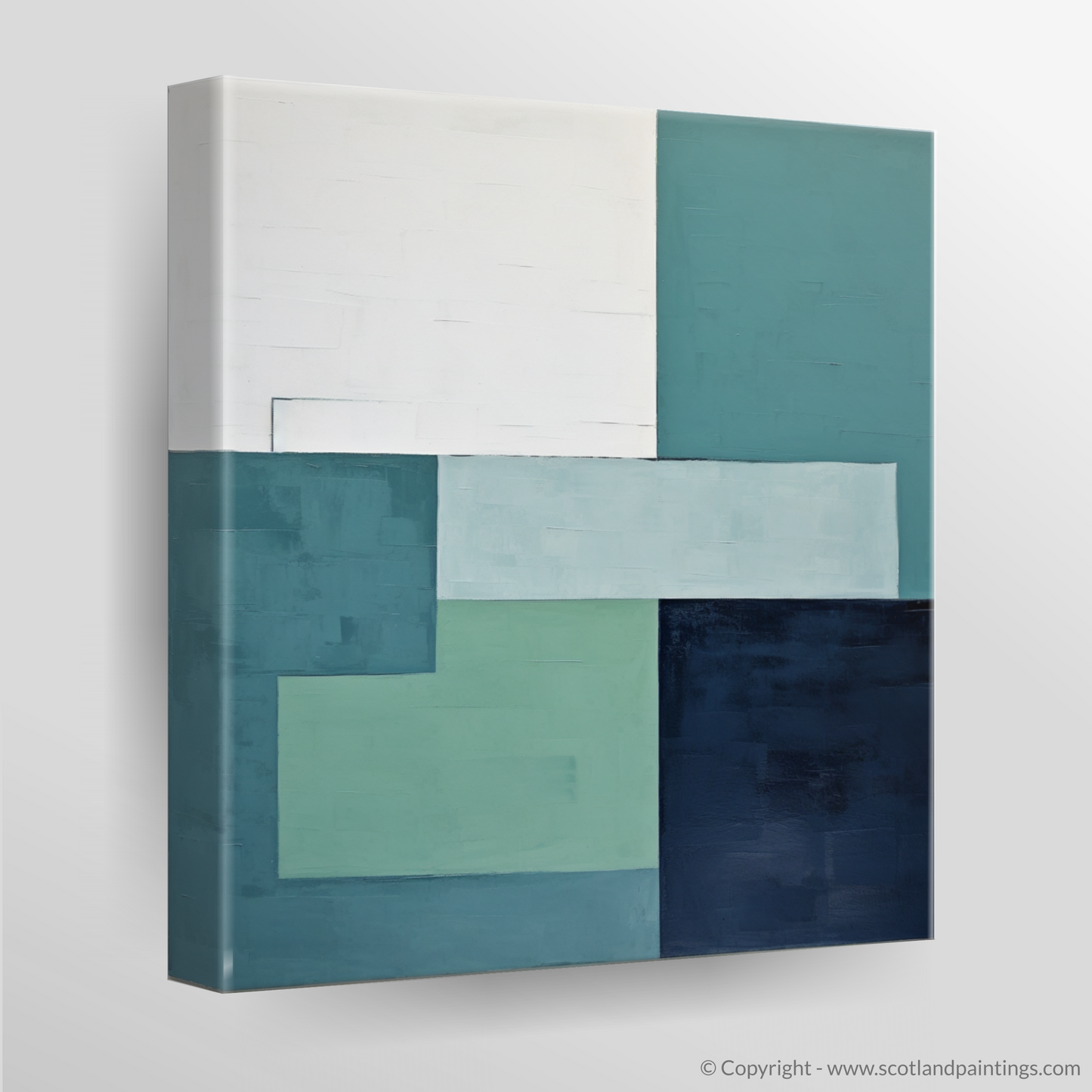 The composition’s stark geometric shapes recall the island’s coastal cliffs and horizons, while the subtle textures suggest the fleeting interplay of light and shadow over the land. A delicate gradient transitions from profound marine blues at the base, where the essence of the deep, cold ocean is brought to the fore, ascending through to soft, airy whites which evoke the crispness of the Northern light.