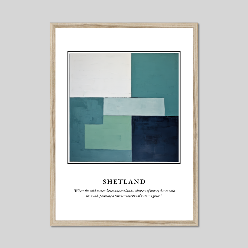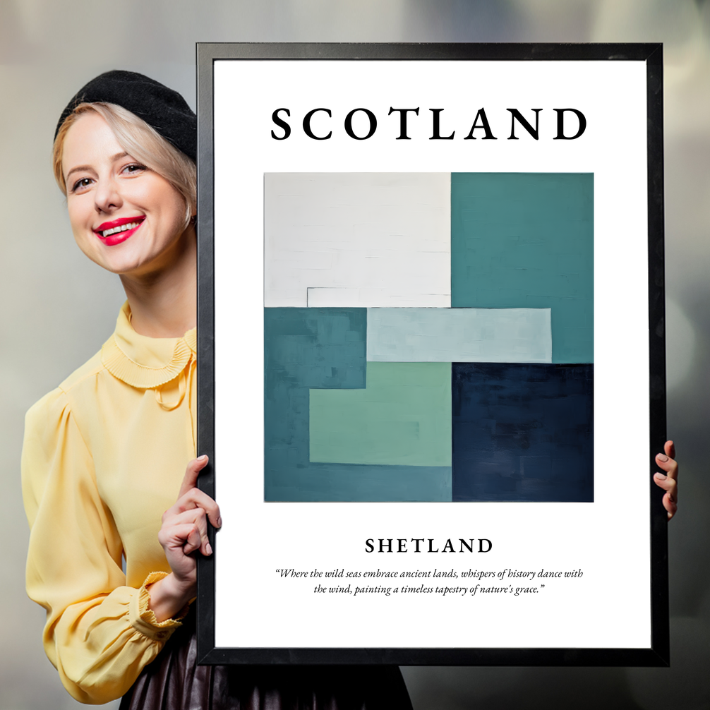 The word “SCOTLAND” stands proudly at the top in bold lettering, inviting admiration and curiosity. Beneath, a minimalist painting of Shetland captivates the viewer. The composition, with its harmonious blend of abstract forms and subtle hues, evokes the tranquil yet wild essence of this remarkable landscape. The complementary quote below speaks to the poetic nature of Shetland: “Where the wild seas embrace ancient lands, whispers of history dance with the wind, painting a timeless tapestry of nature's grace.”