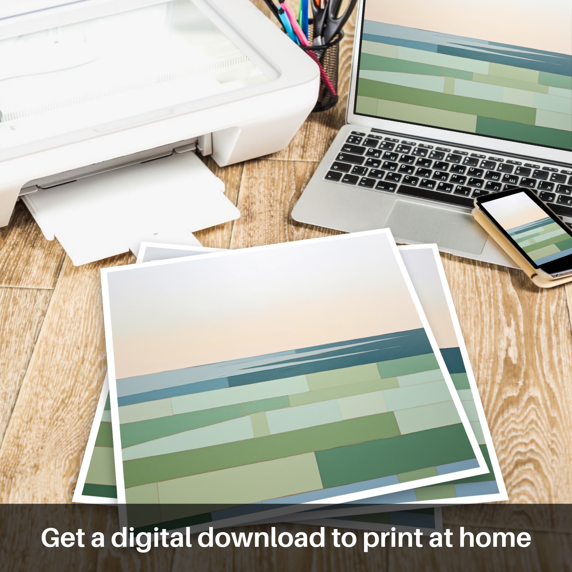 The artwork’s clean lines and block colours exemplify the minimalist approach, conjuring a sense of calm and space. This visual meditation strips the landscape to its bare essentials, allowing each carefully chosen shade to whisper its own narrative of the waters' edge, where the land gently meets the sea.