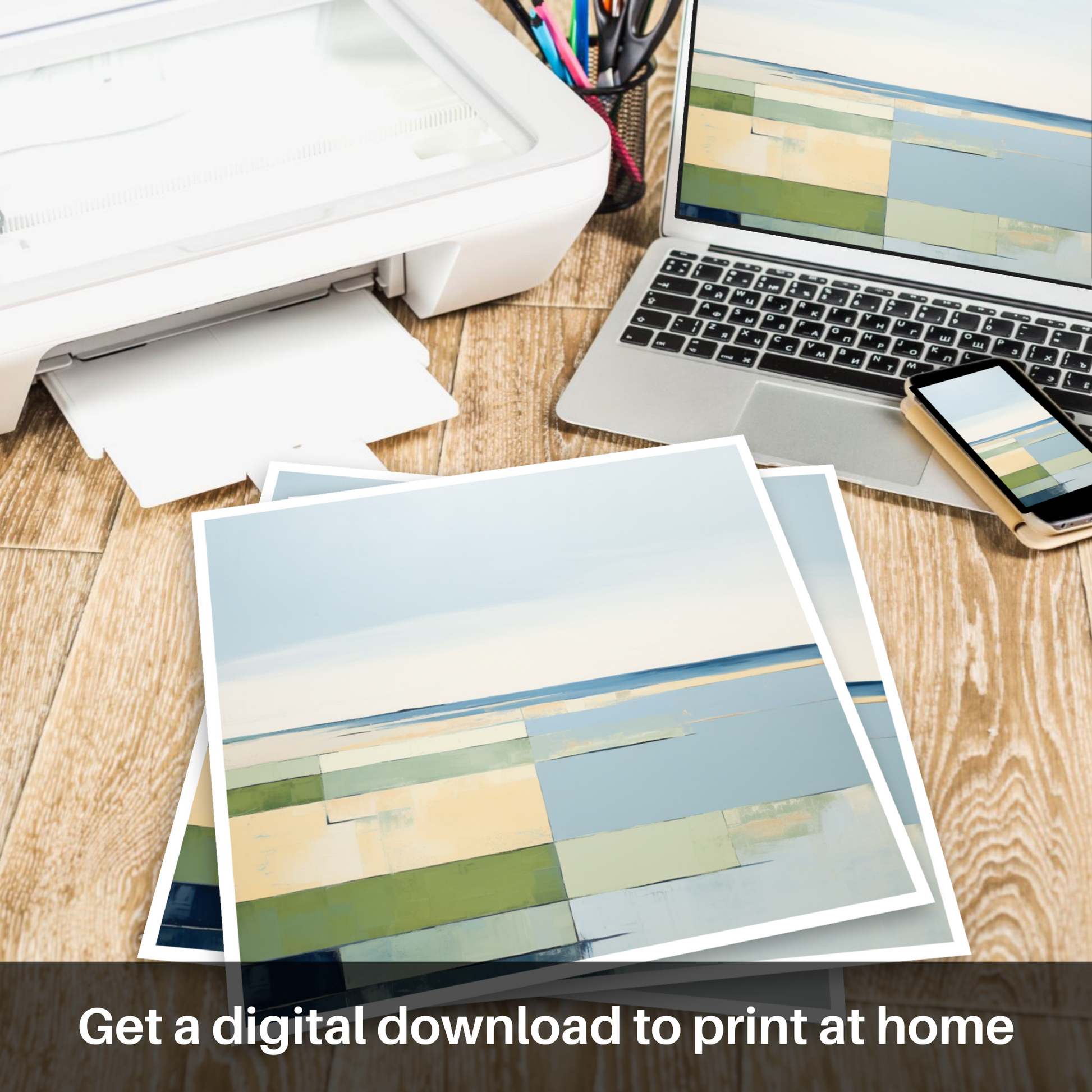 The artwork is composed of a symphony of soft pastel hues that range from calming blues and gentle greens to warm beige tones, embodying the natural palette of the coastal seascape at a time when the light casts its most ethereal quality over the landscape. This artistic rendition abstracts the familiar into a celebration of colour, form, and the sheer simplicity of the visual elements at play.