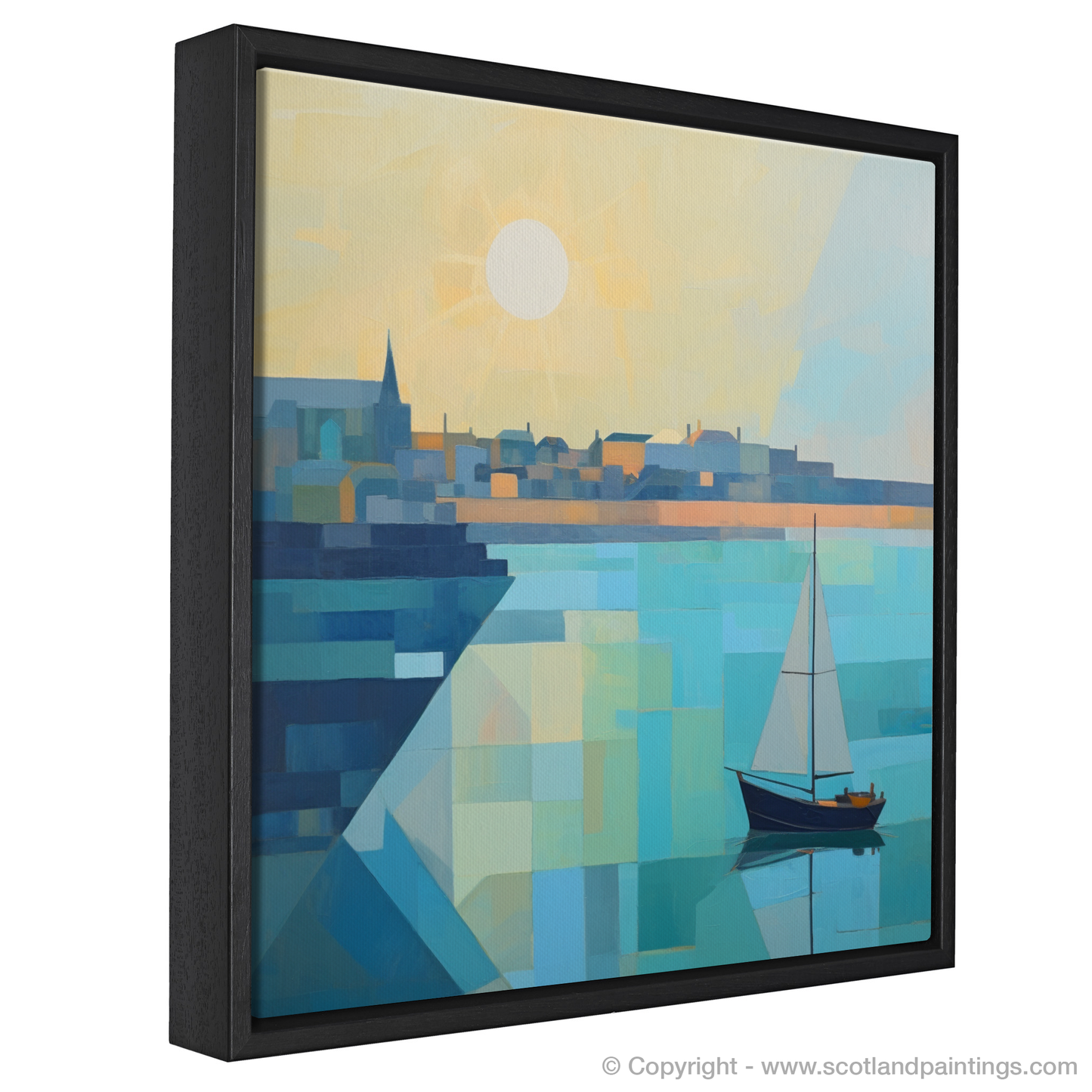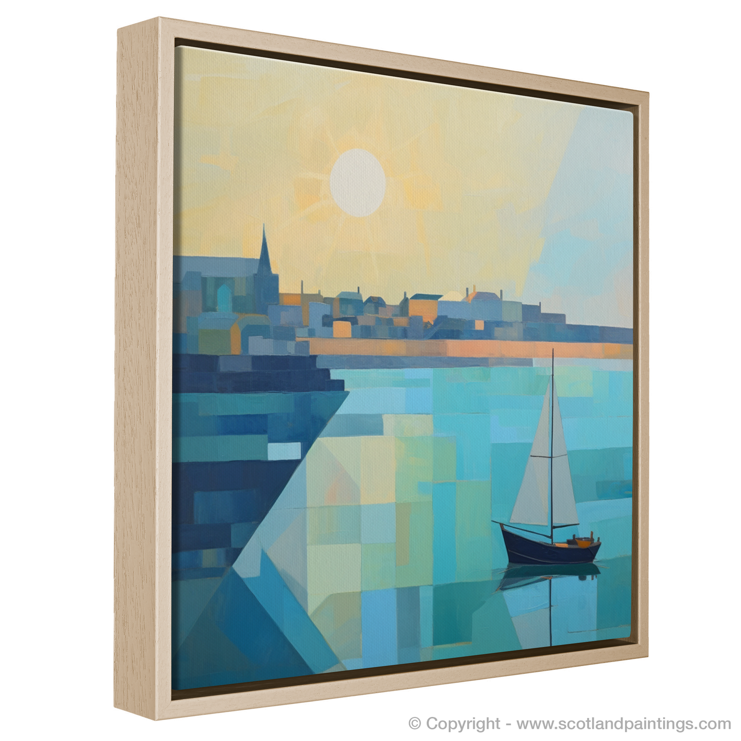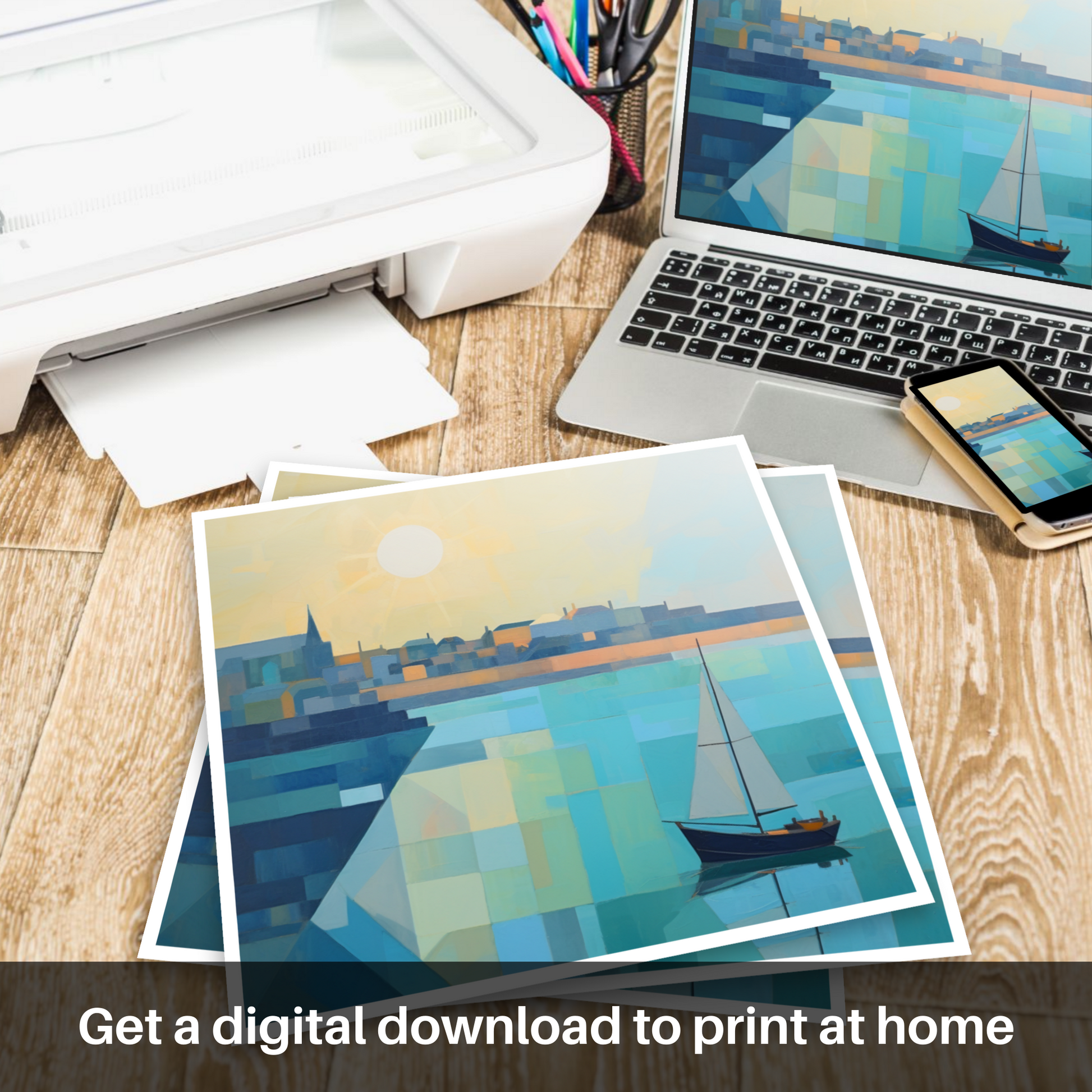 Behind, a simplified skyline presents the quaint architecture of seaside dwellings and historic structures, distilled into geometric shapes that please the eye with their understated complexity. The buildings bask in the sun's fading embrace, their edges softened and colours muted, encapsulating the timelessness of the coastal haven.