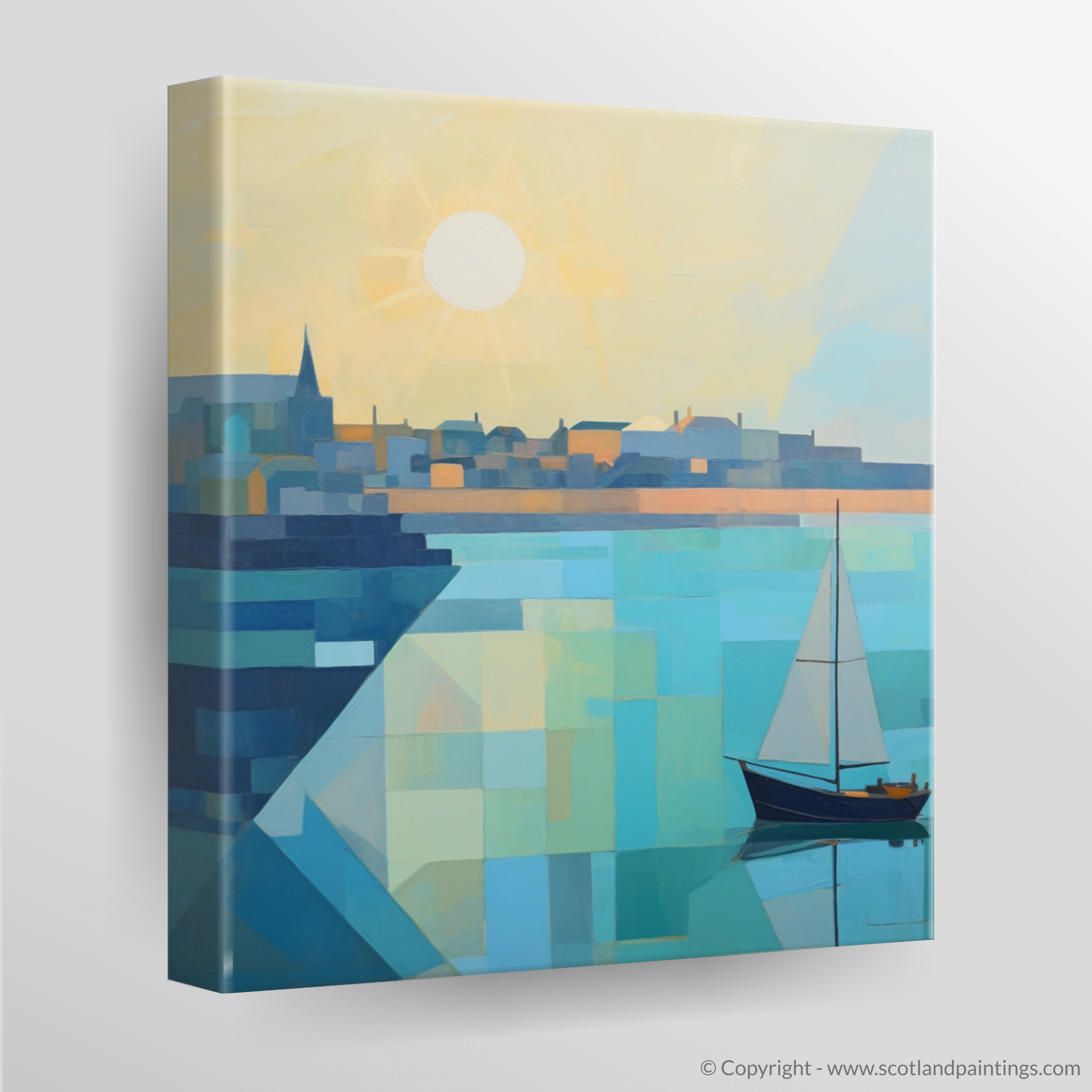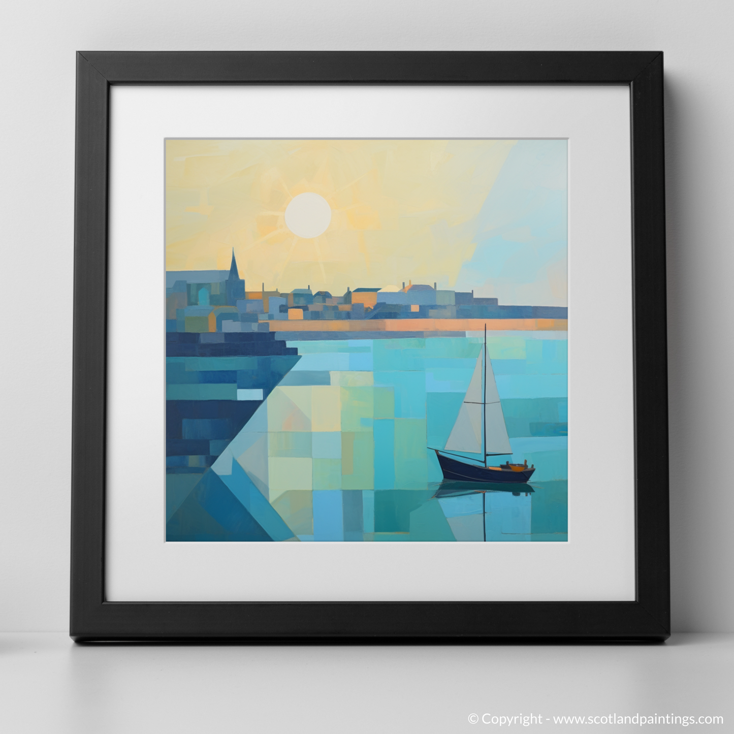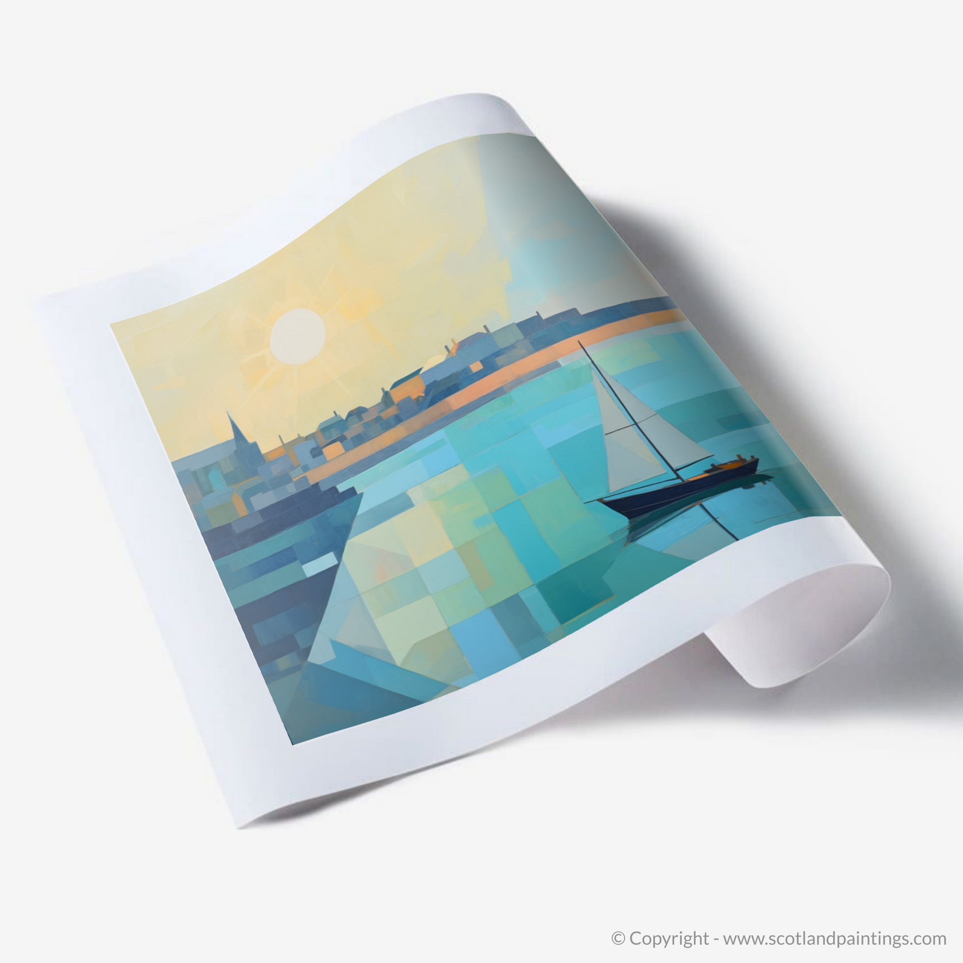 As the sun dips towards the horizon, its glow casts a palette of warm golds and cool blues over the tranquil scene of Dunbar Harbour. This minimalistic interpretation captures the essence of golden hour, where the interplay of light and shadow brings a calm serenity to the bustling harbour life.
