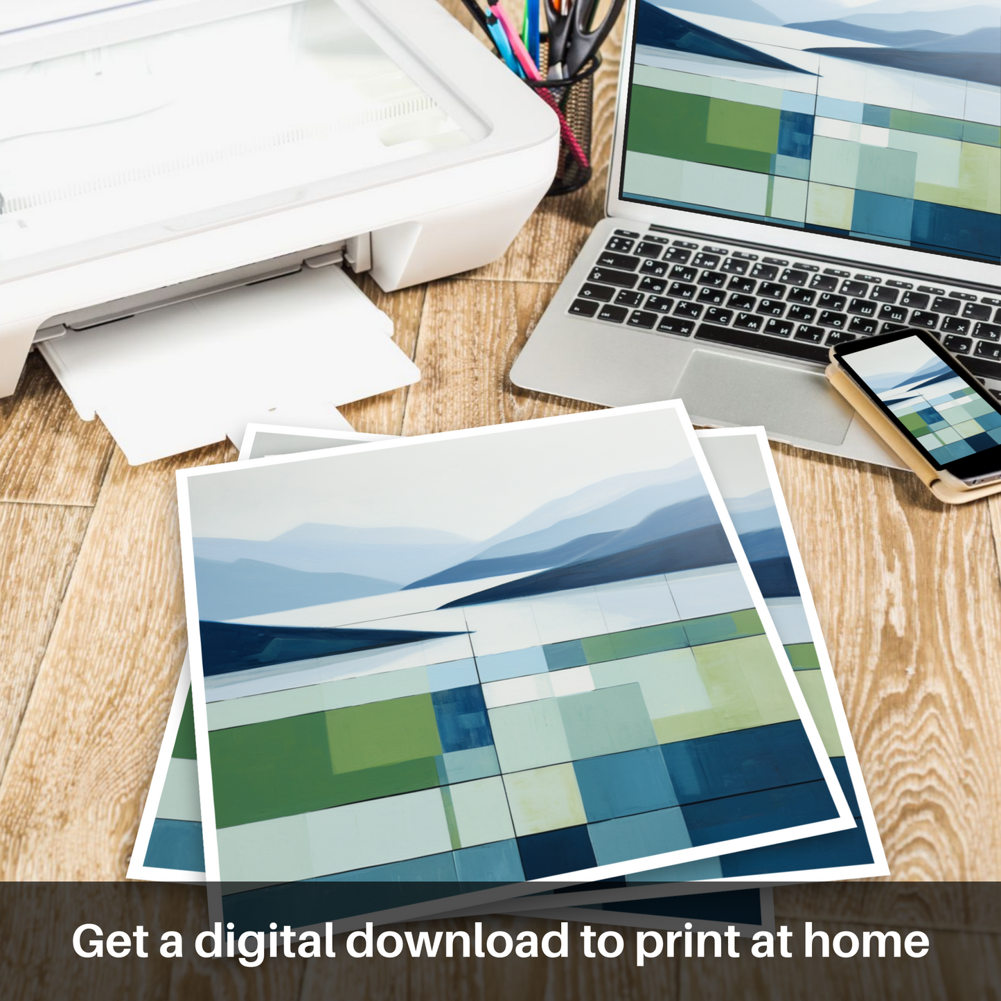A striking contrast is found as the gaze moves downward, to a tapestry of greens and blues that suggest the vigorous life of summer flora and the reflective dance of light on water. Blocks of colour, ranging from deep navy to soft sage, sit confidently next to one another, each segment a brushstroke of minimalist expression. This deliberate interplay of colour and form encapsulates the print's modern sensibility, making it a focal point of sophisticated simplicity.