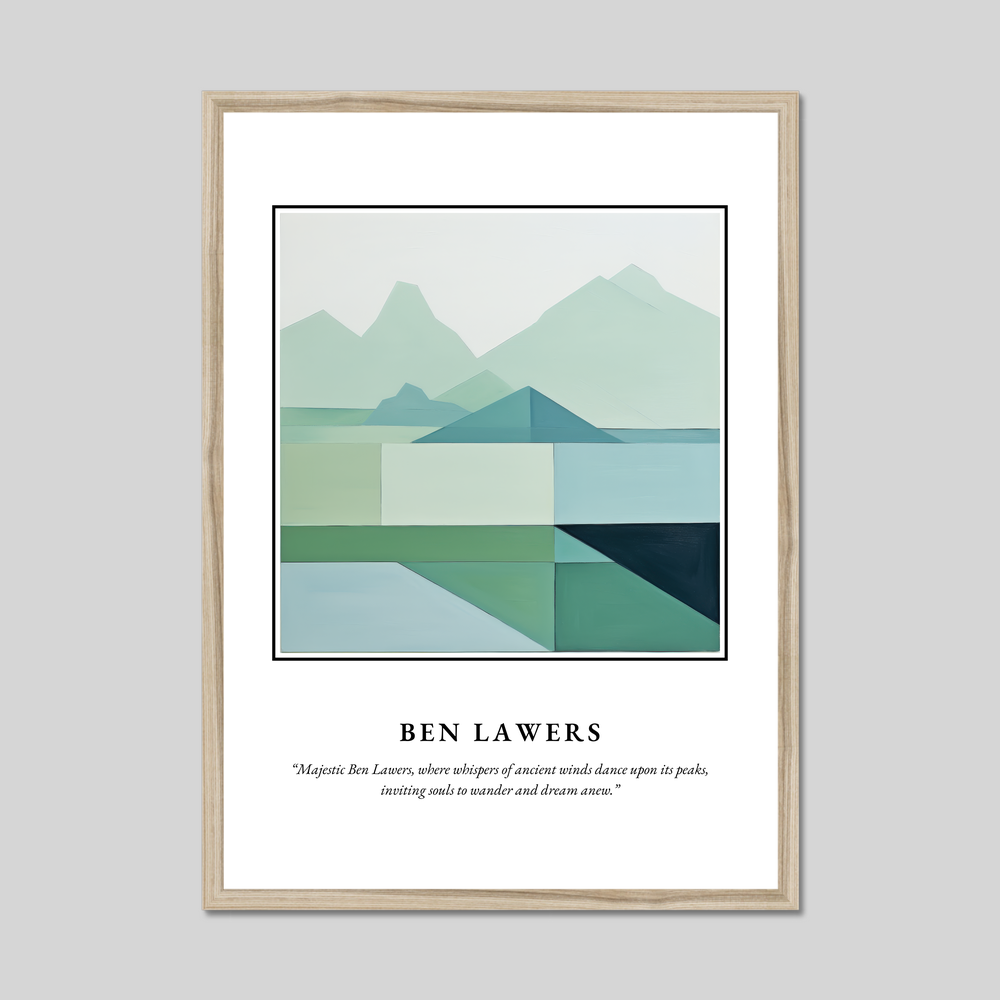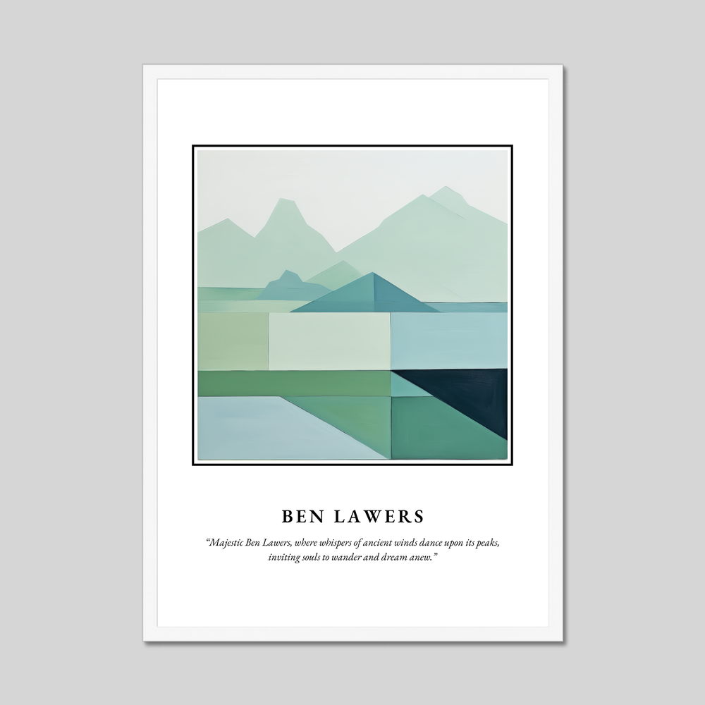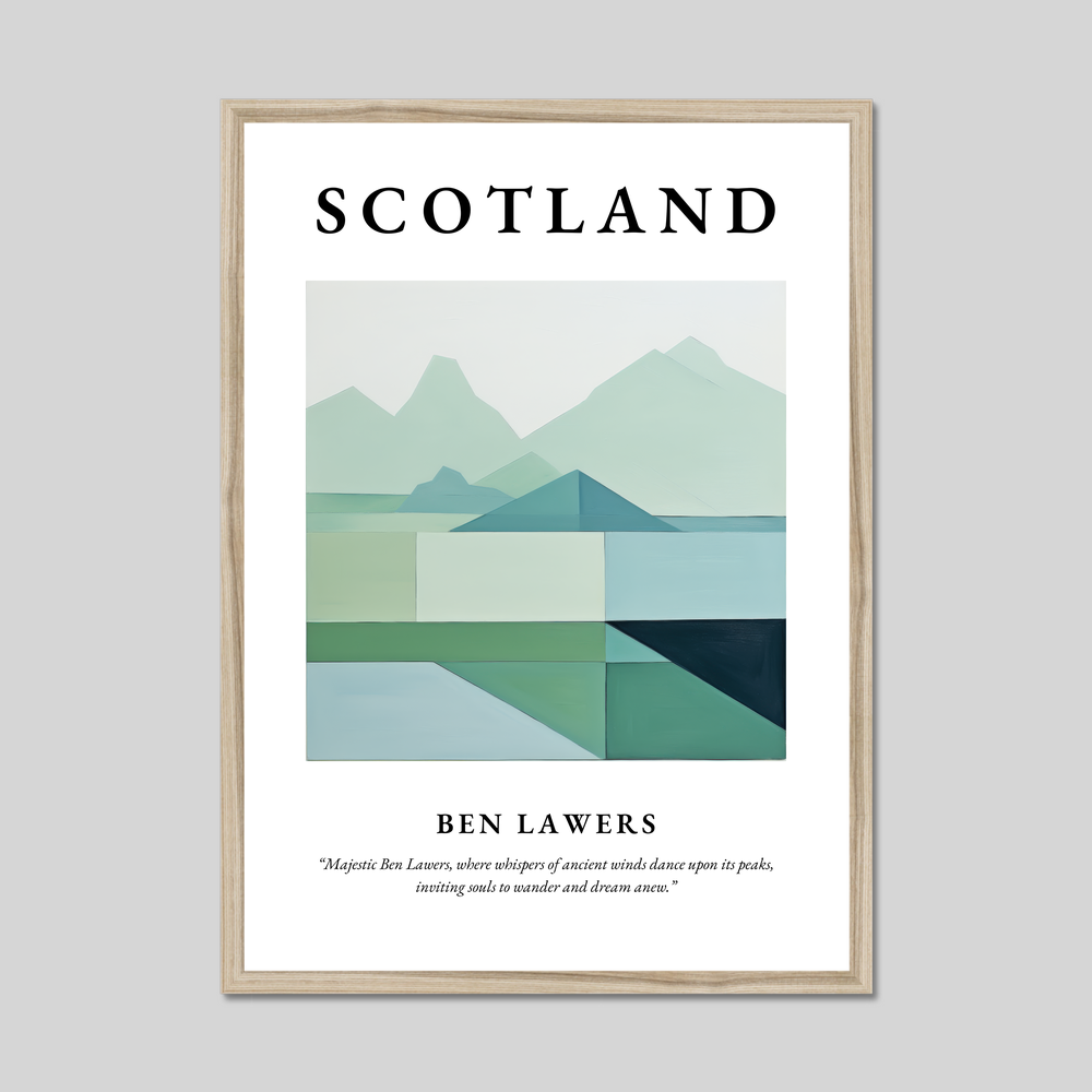 The poster features the word “SCOTLAND” in bold lettering, leading your eye down to the elegant depiction of Ben Lawers. The minimalist artwork intricately balances form and colour, evoking the serene yet formidable presence of this Scottish peak. Beneath the painting, the quote “Majestic Ben Lawers, where whispers of ancient winds dance upon its peaks, inviting souls to wander and dream anew" invites reflection and adds an air of poetic mystery.