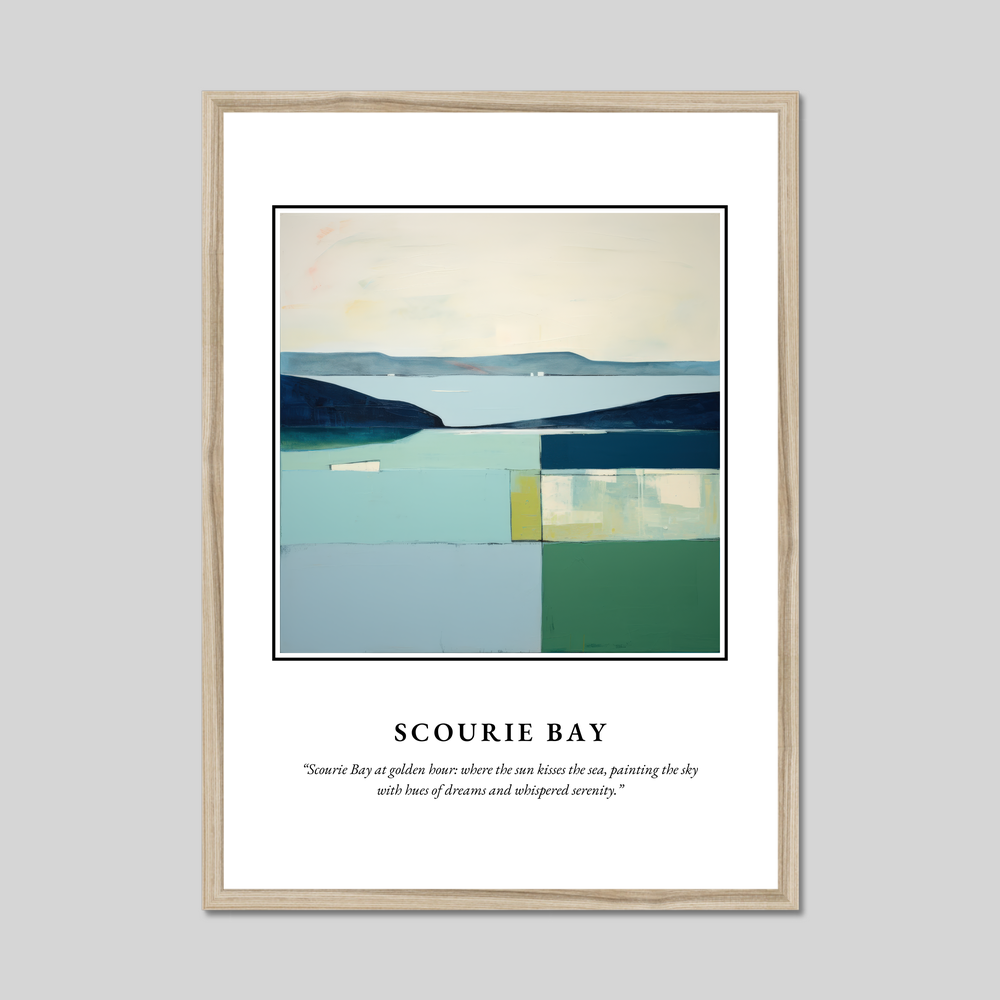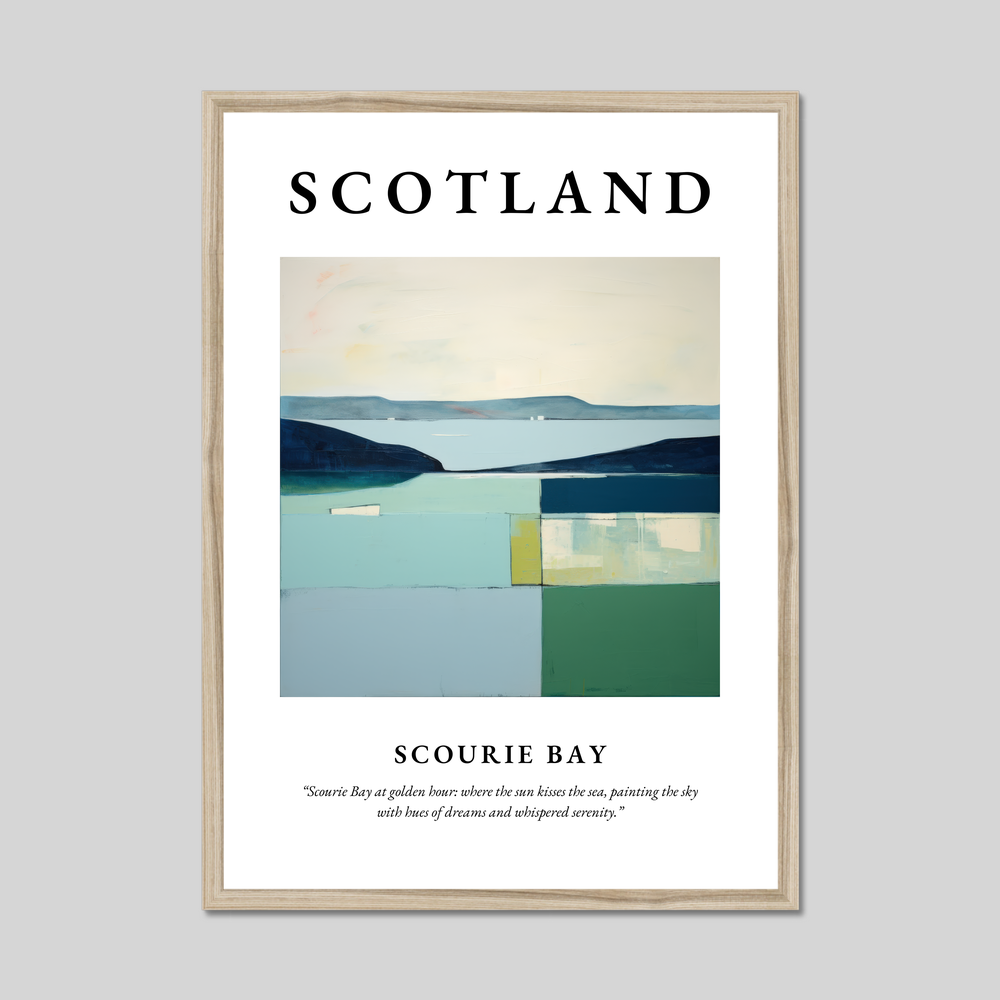 Beneath the painting, the quote “Scourie Bay at golden hour: where the sun kisses the sea, painting the sky with hues of dreams and whispered serenity.” adds a poetic touch that perfectly complements the visual imagery. Choose from a sophisticated black, versatile white, or warm natural wood-effect frame to best suit your space and style.