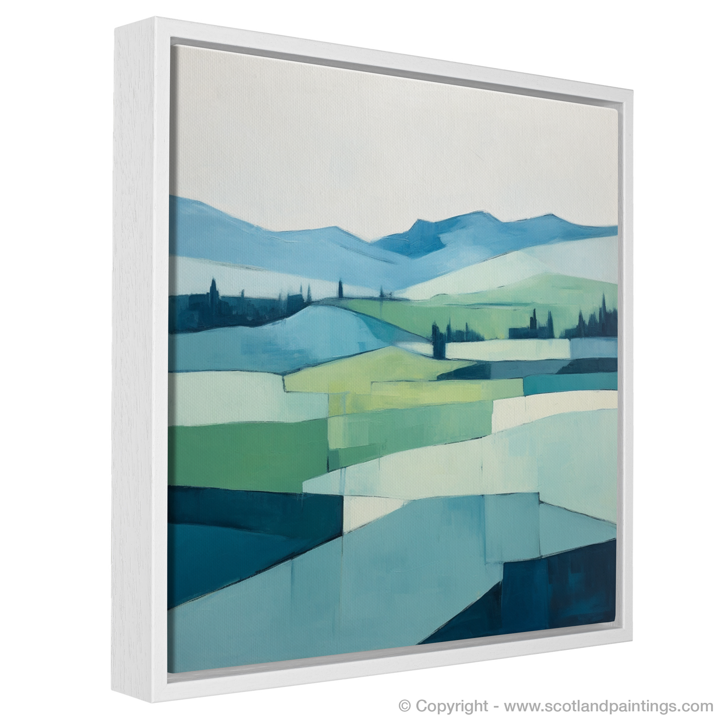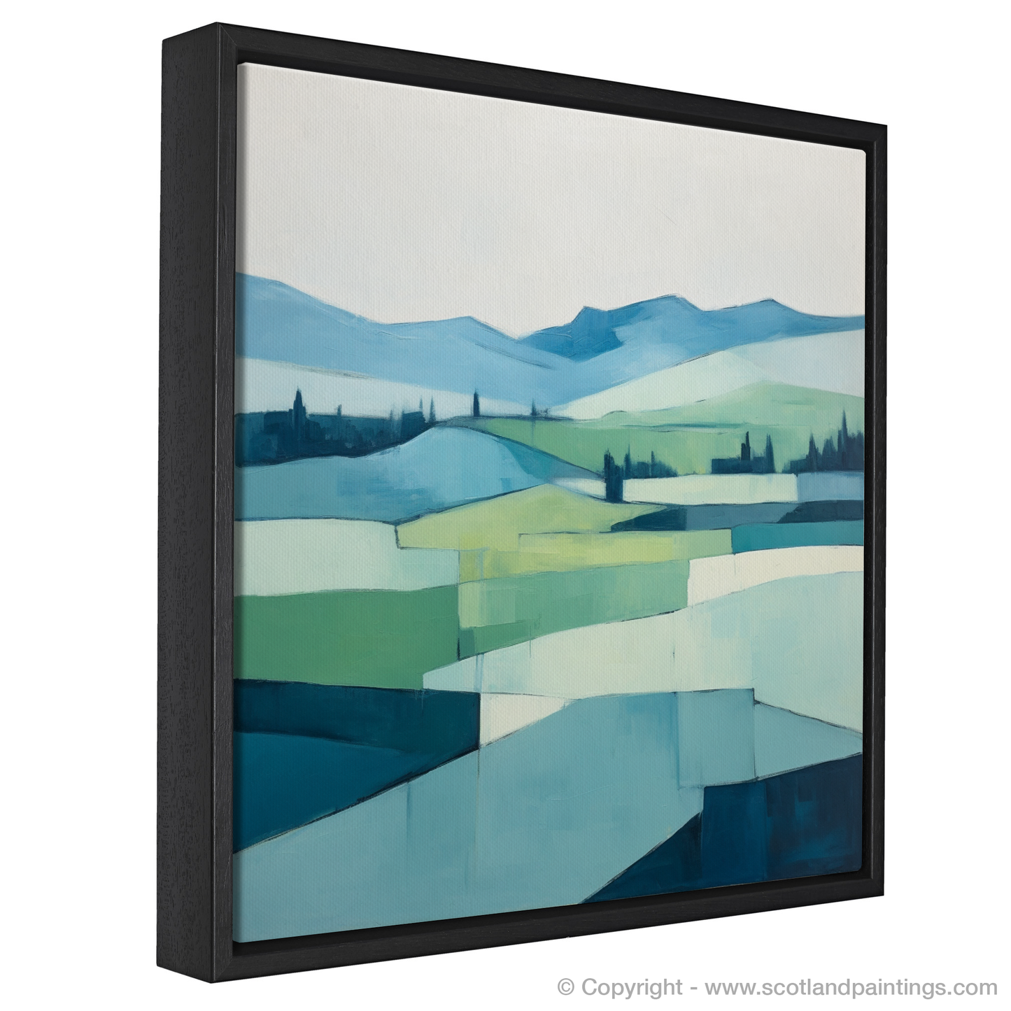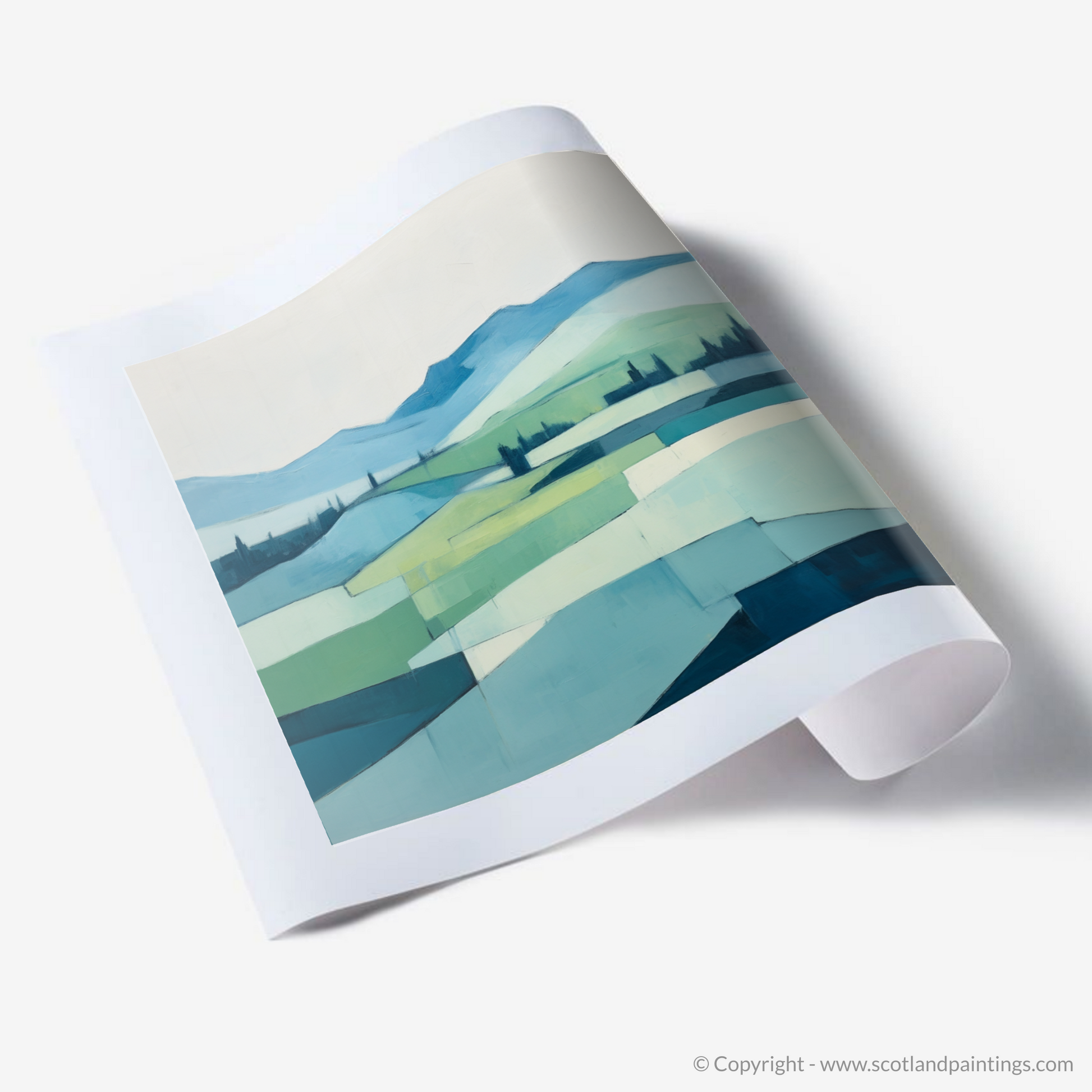 The sweeping, undulating hills are reduced to elegant geometric shapes, teasing the line between abstraction and the soft mimicry of nature's own designs. The lush valleys and rolling peaks are communicated through a sublime palette of cool blues and gentle greens, evoking the fresh, crisp air typical of the Scottish highlands' summer months. Each block of colour is bordered by subtle but confident lines, inviting the eye on a purposeful journey across the tapestry of simplified forms.