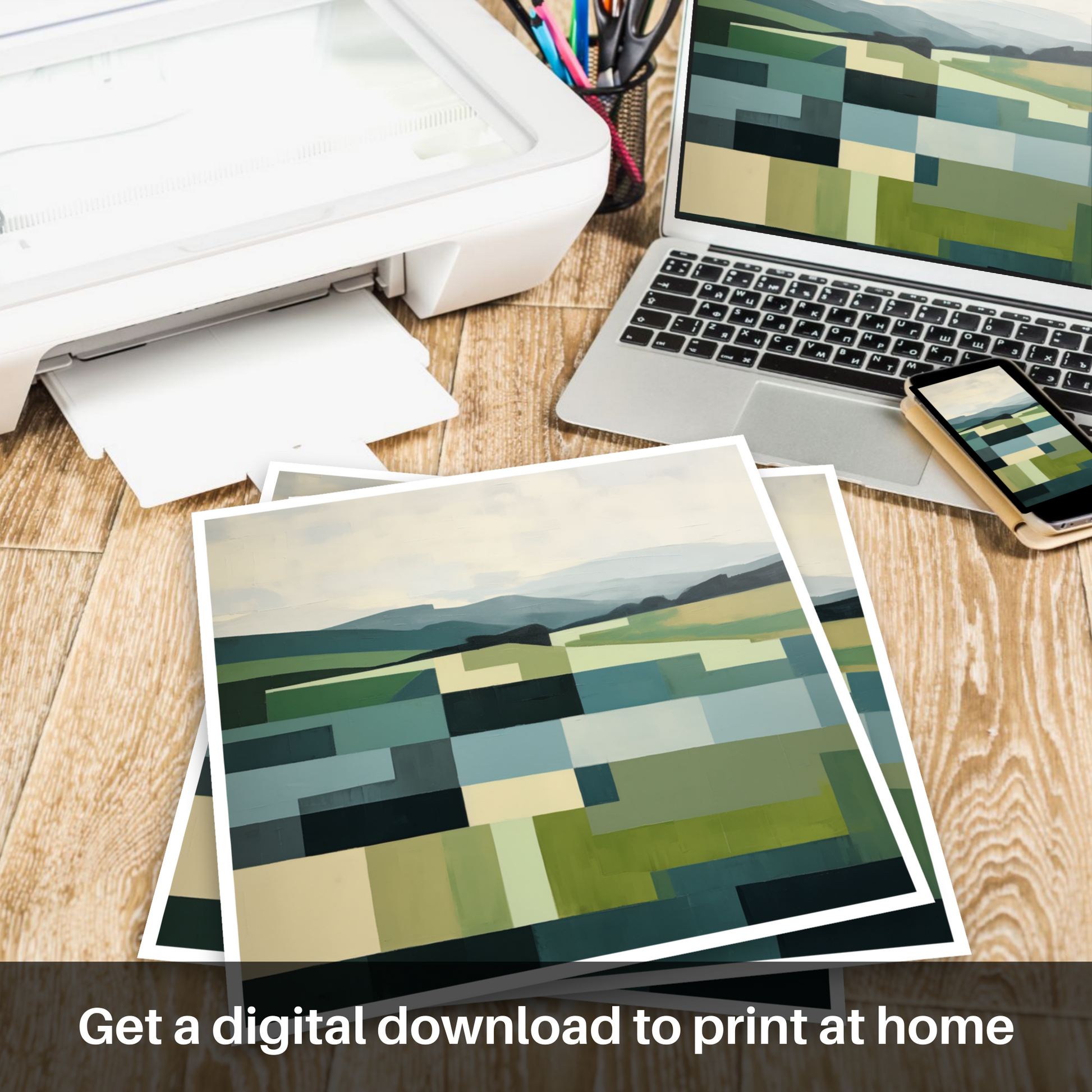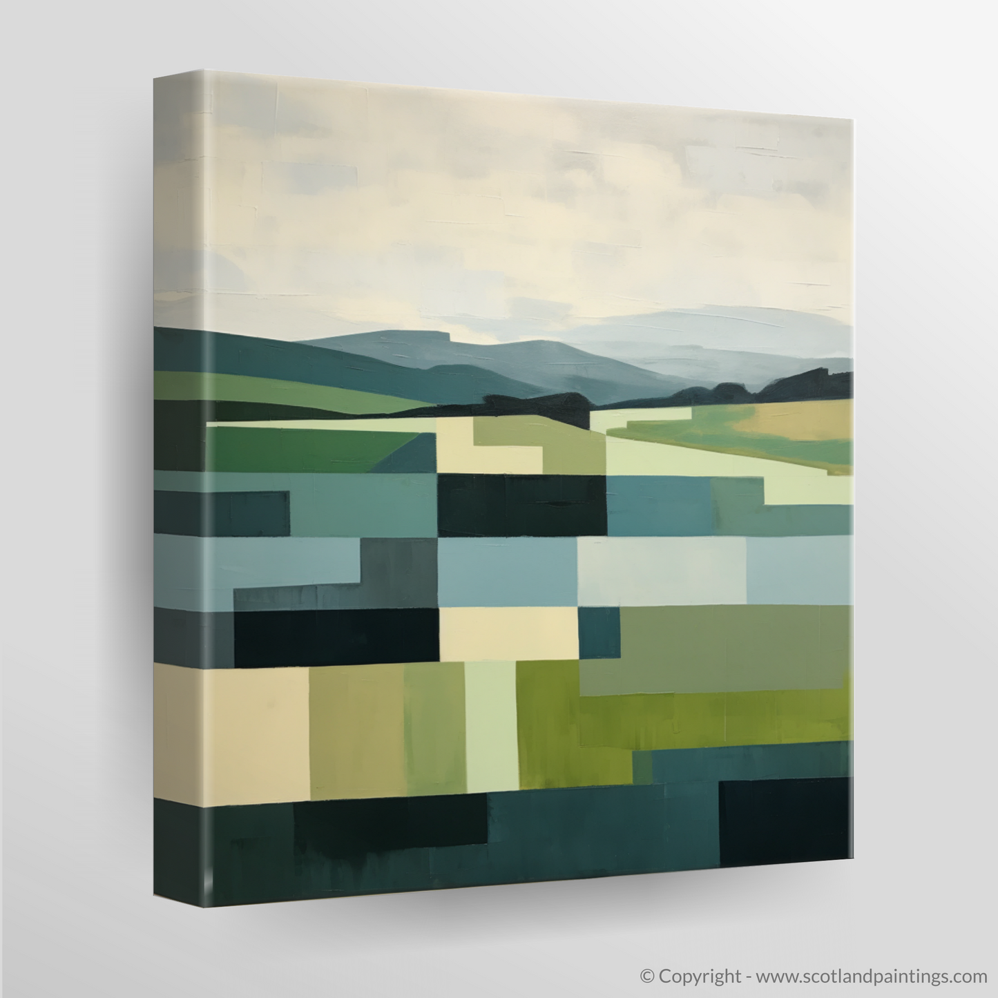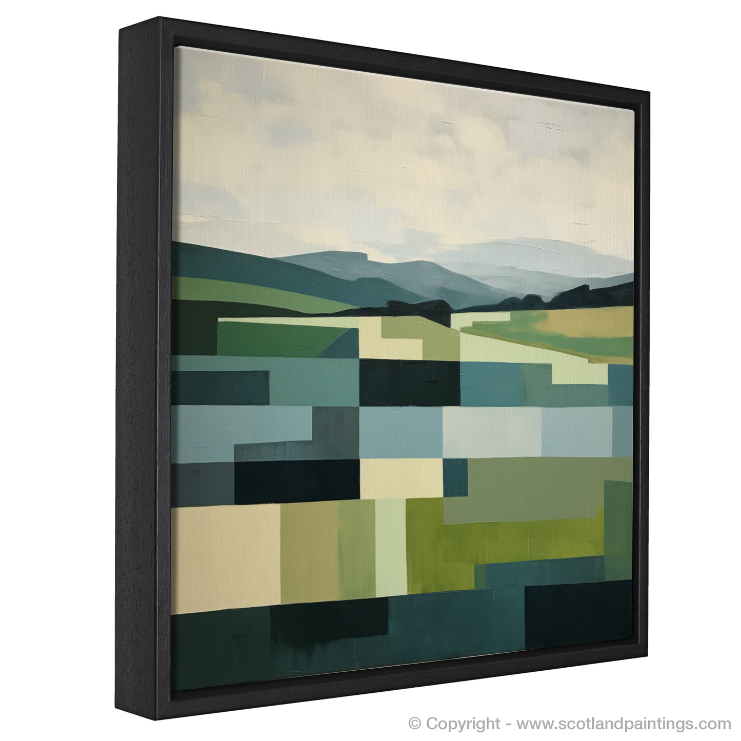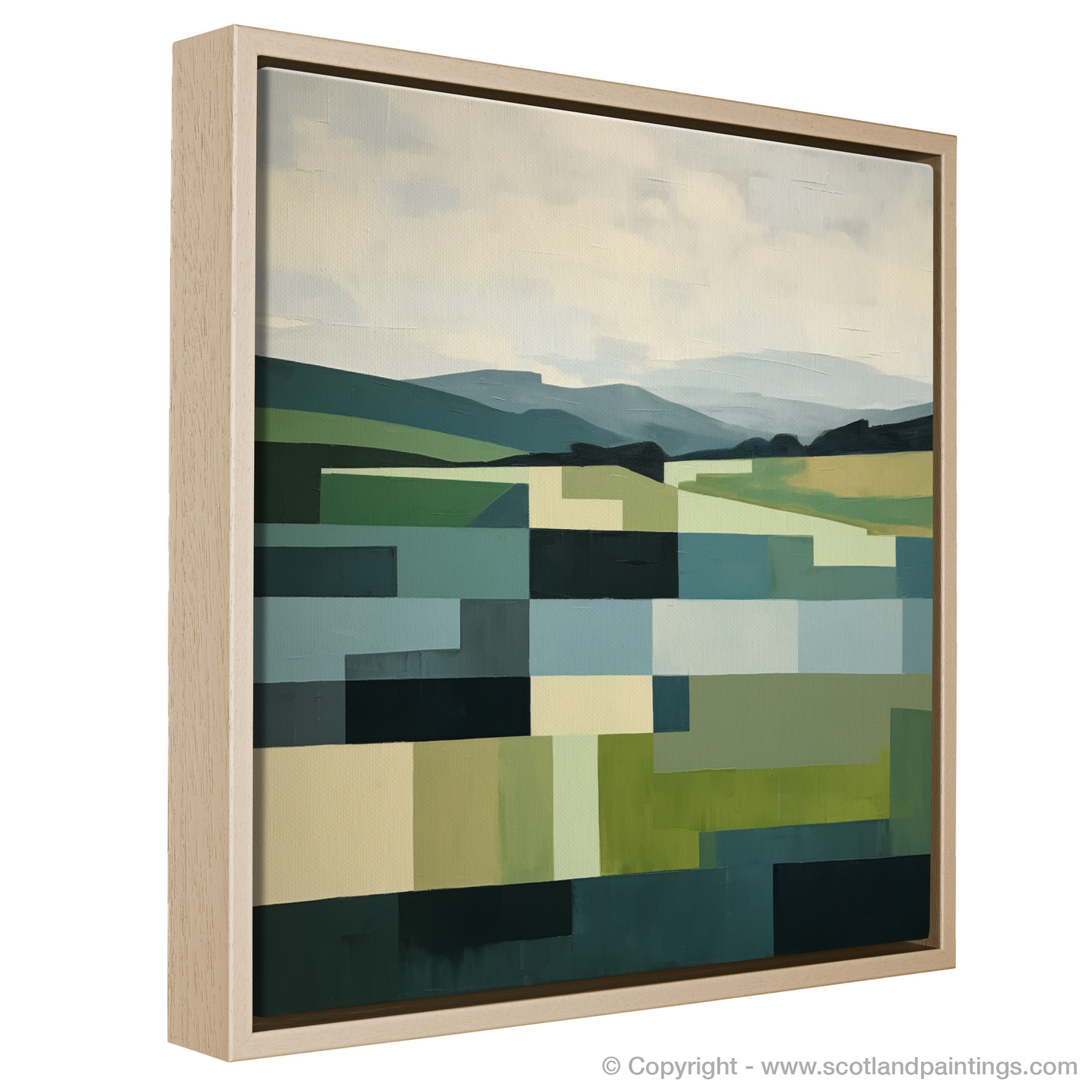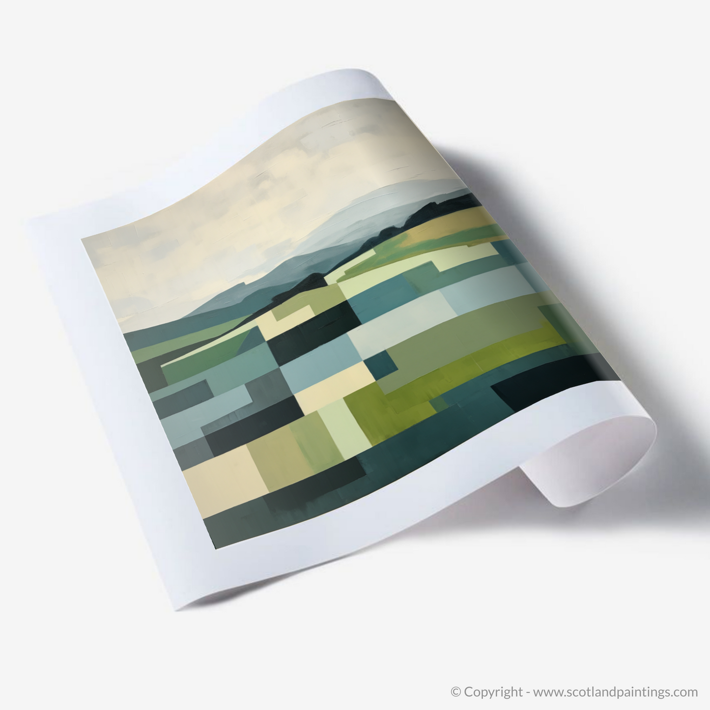 The print is a harmony of geometric shapes, artfully combined to represent the natural undulations of the terrain. A verdant patchwork unfolds across the canvas, with each block of colour carefully selected to mirror the lush greens of the summer foliage and the softer hues of the distant sky, imbued with the gentle glow of seasonal warmth. Strips of light and dark blues cut through the piece, suggesting the calm flow of rivers or the expansive reach of a Scottish summer's sky.