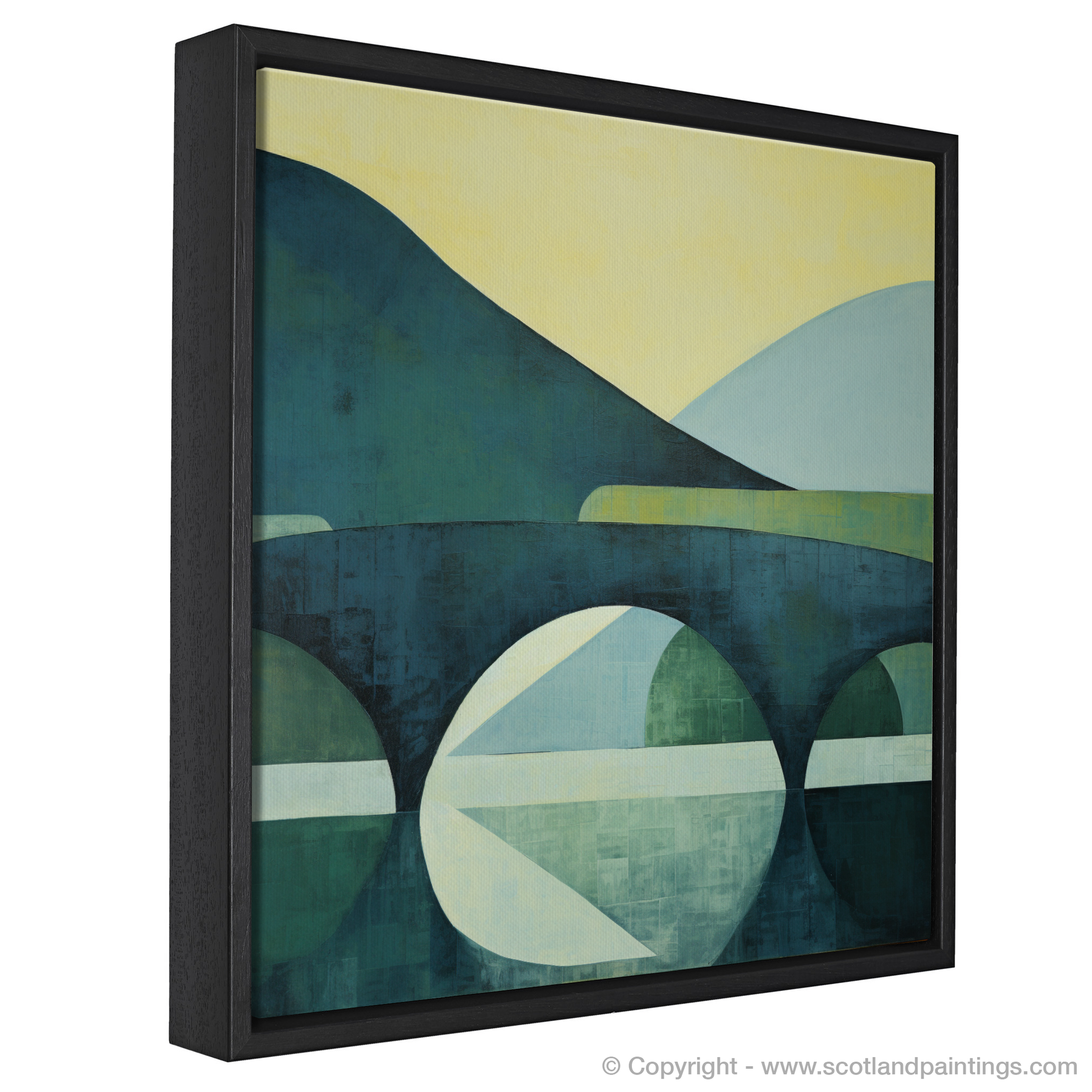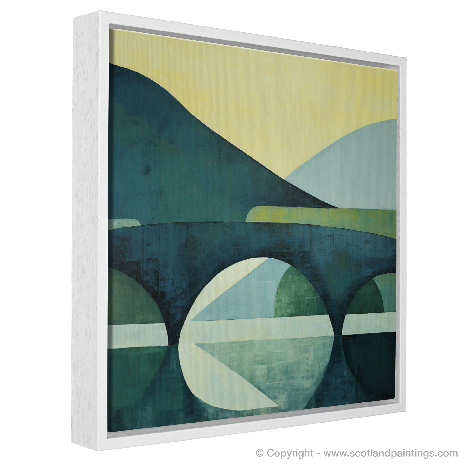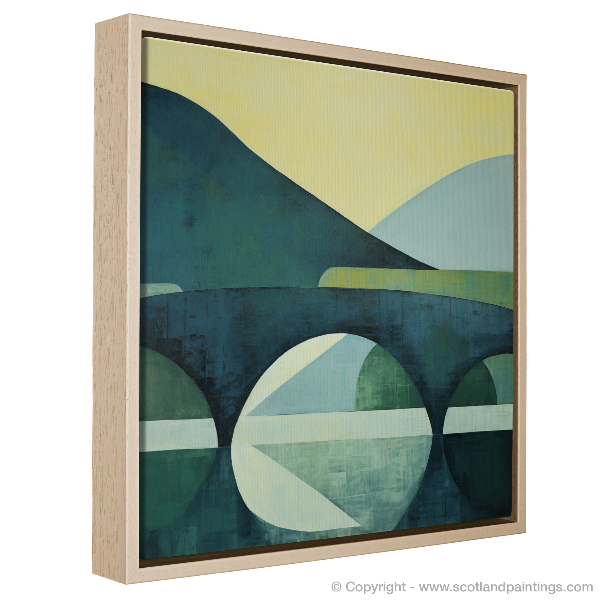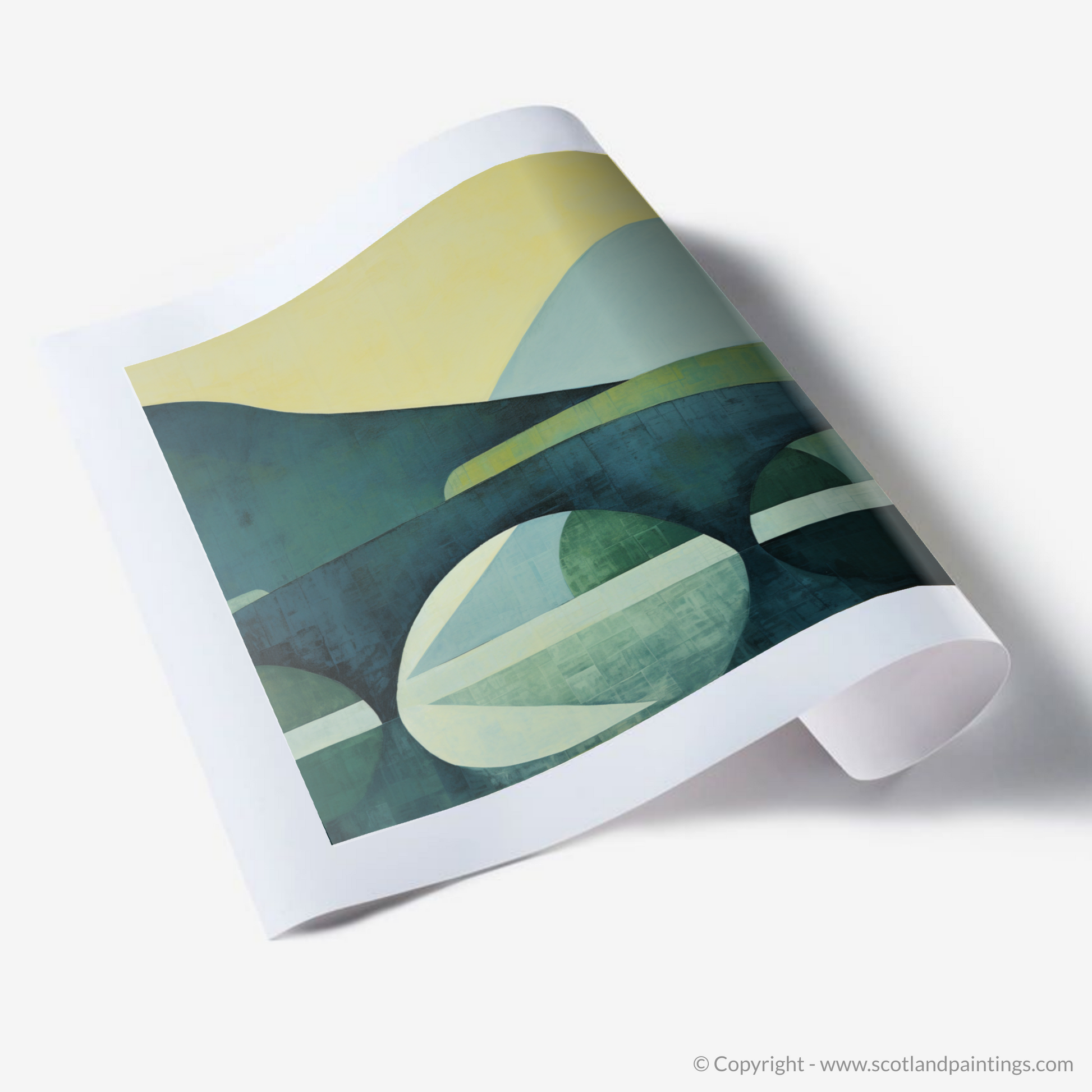 Immerse yourself in the serene elegance of our minimalist interpretation of a rustic bridge at twilight in the atmospheric expanse of Glencoe. This evocative print captures the tranquil essence of the landscape through the harmonious interplay of geometric shapes and a soothing palette. The artwork features graceful arches of the bridge, rendered in deep shades of blue, harmonising with the pale green and subtle greys of the waters below. Above, the gentle curves of the hills roll softly into the background, culminating in a pale blue mountain under a subdued, mellow yellow sky.