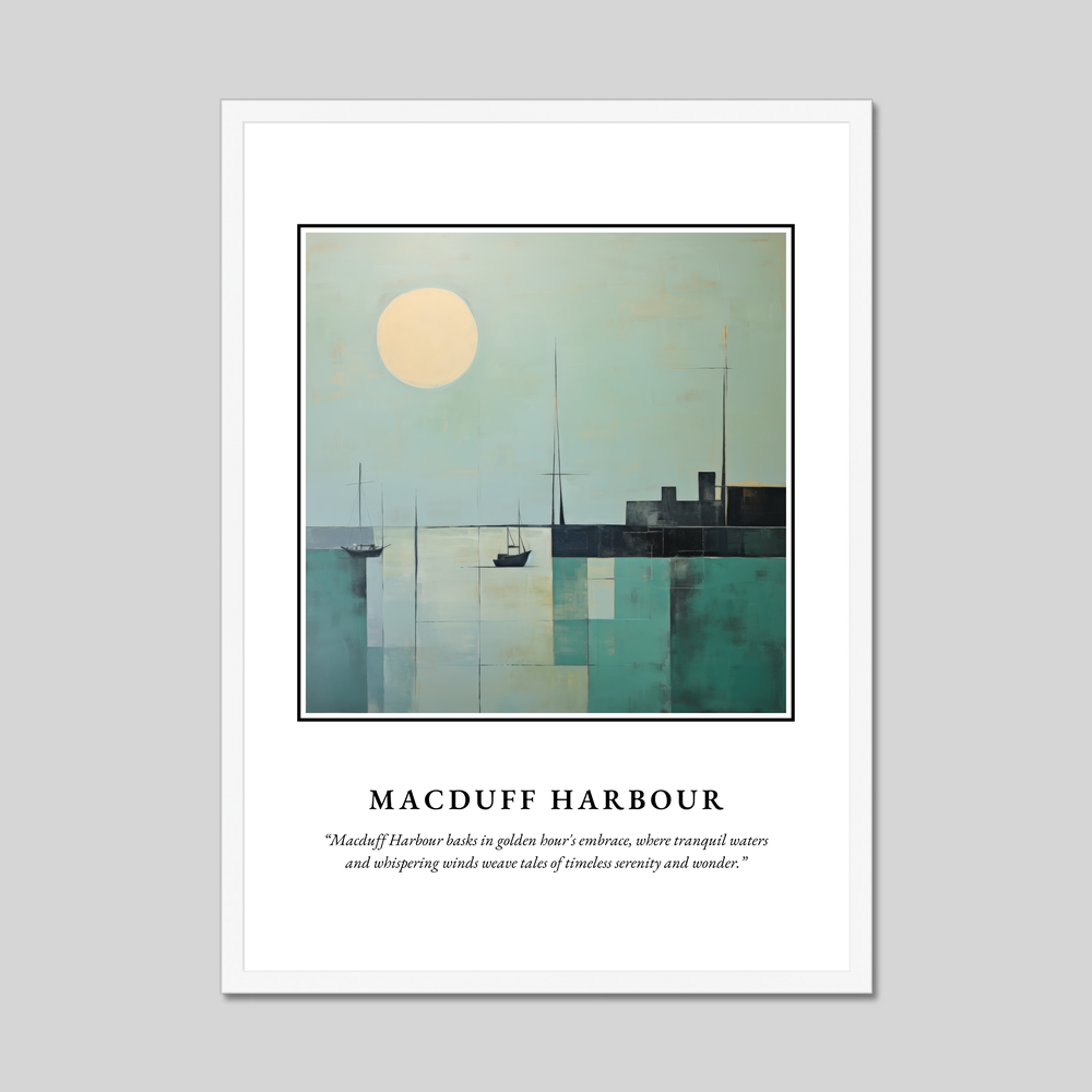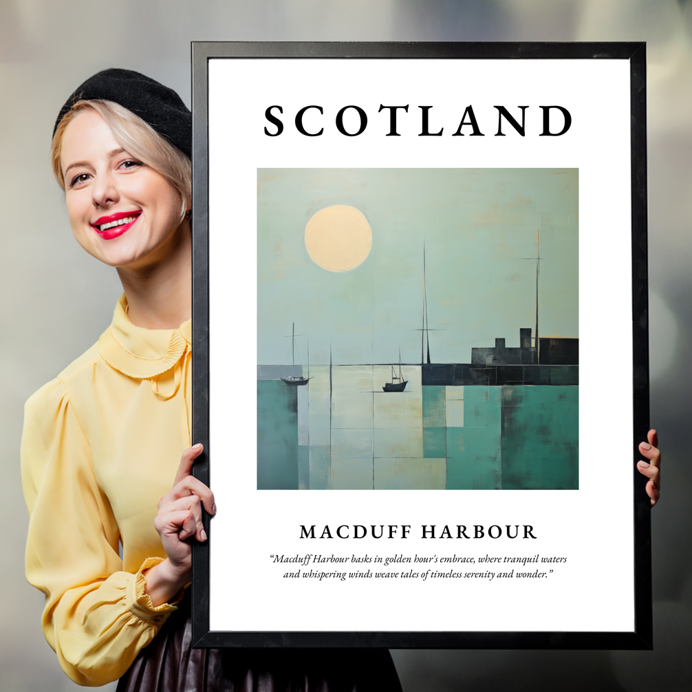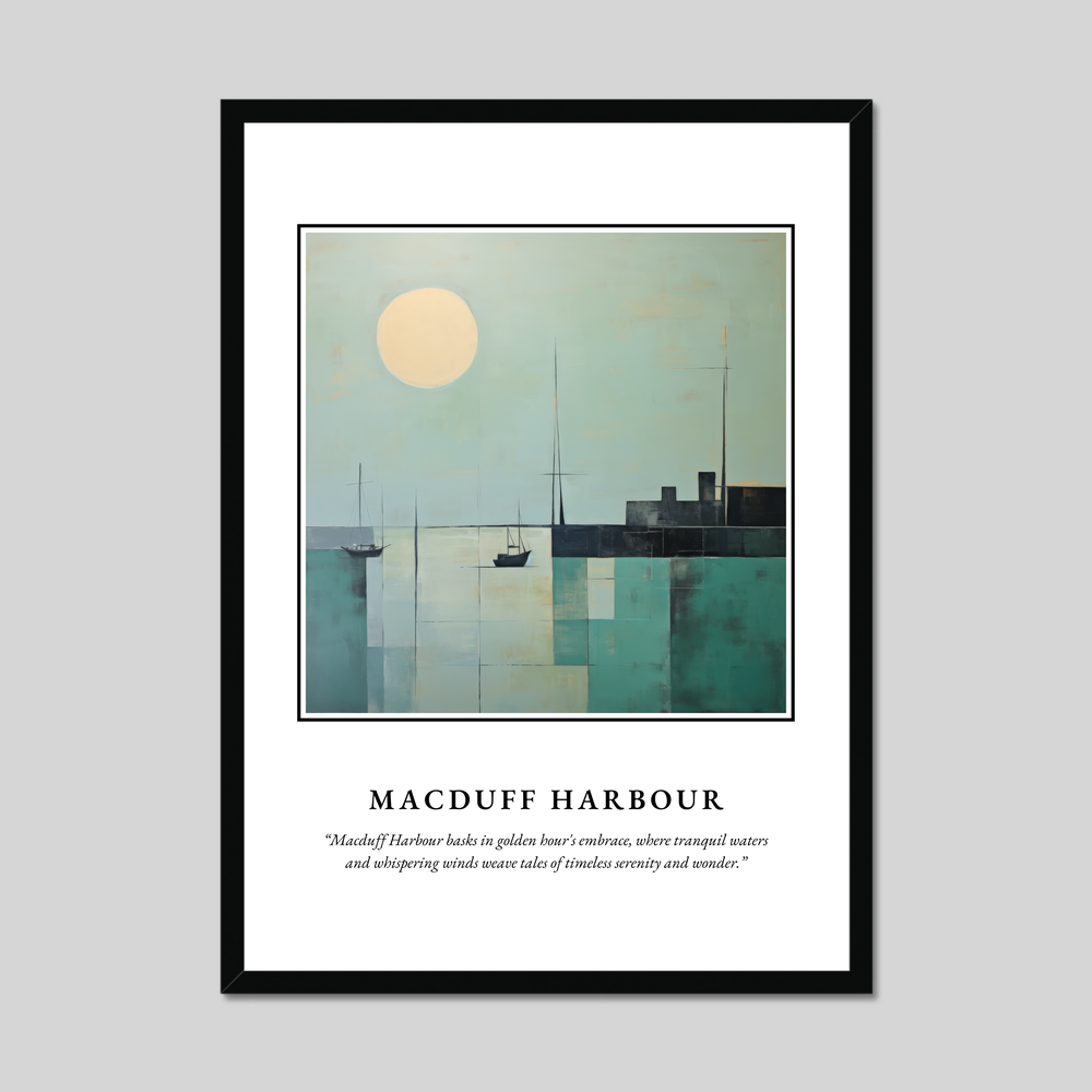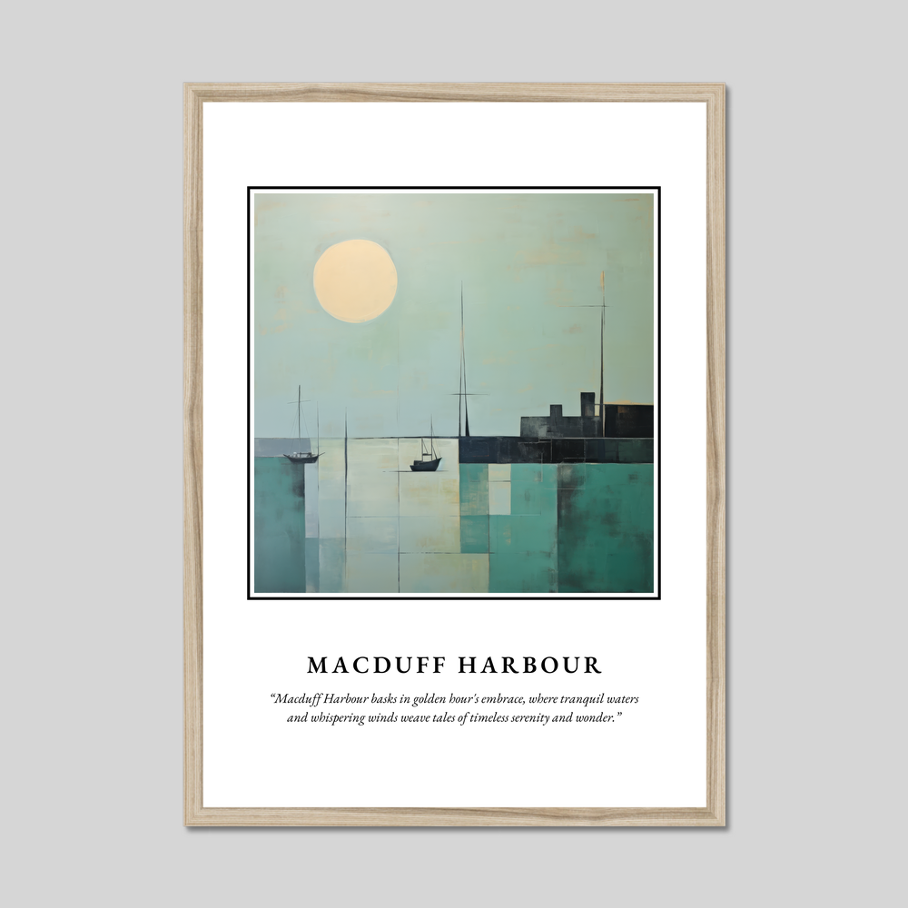 Beneath the painting, the quote “Macduff Harbour basks in golden hour's embrace, where tranquil waters and whispering winds weave tales of timeless serenity and wonder” further enriches the visual narrative, inviting viewers to both imagine and remember their own experiences or connections to this enchanting locale.