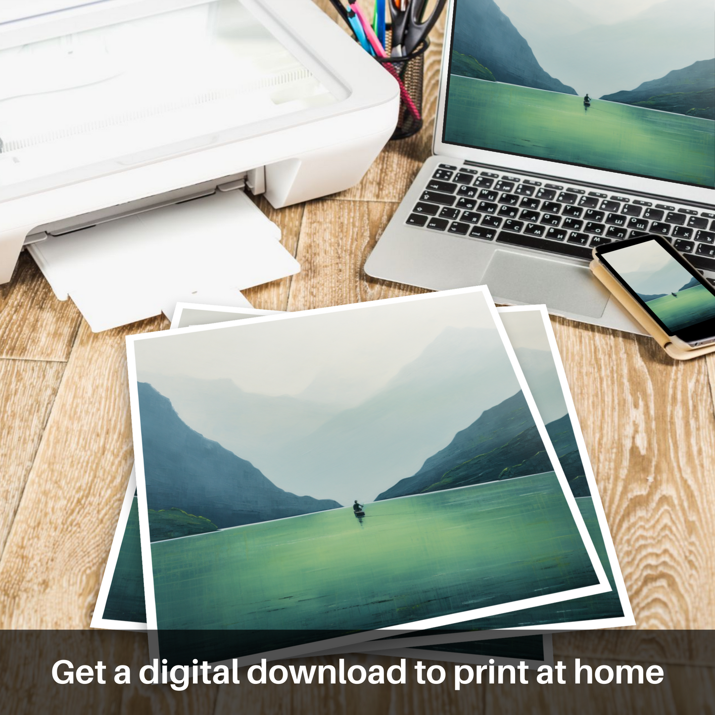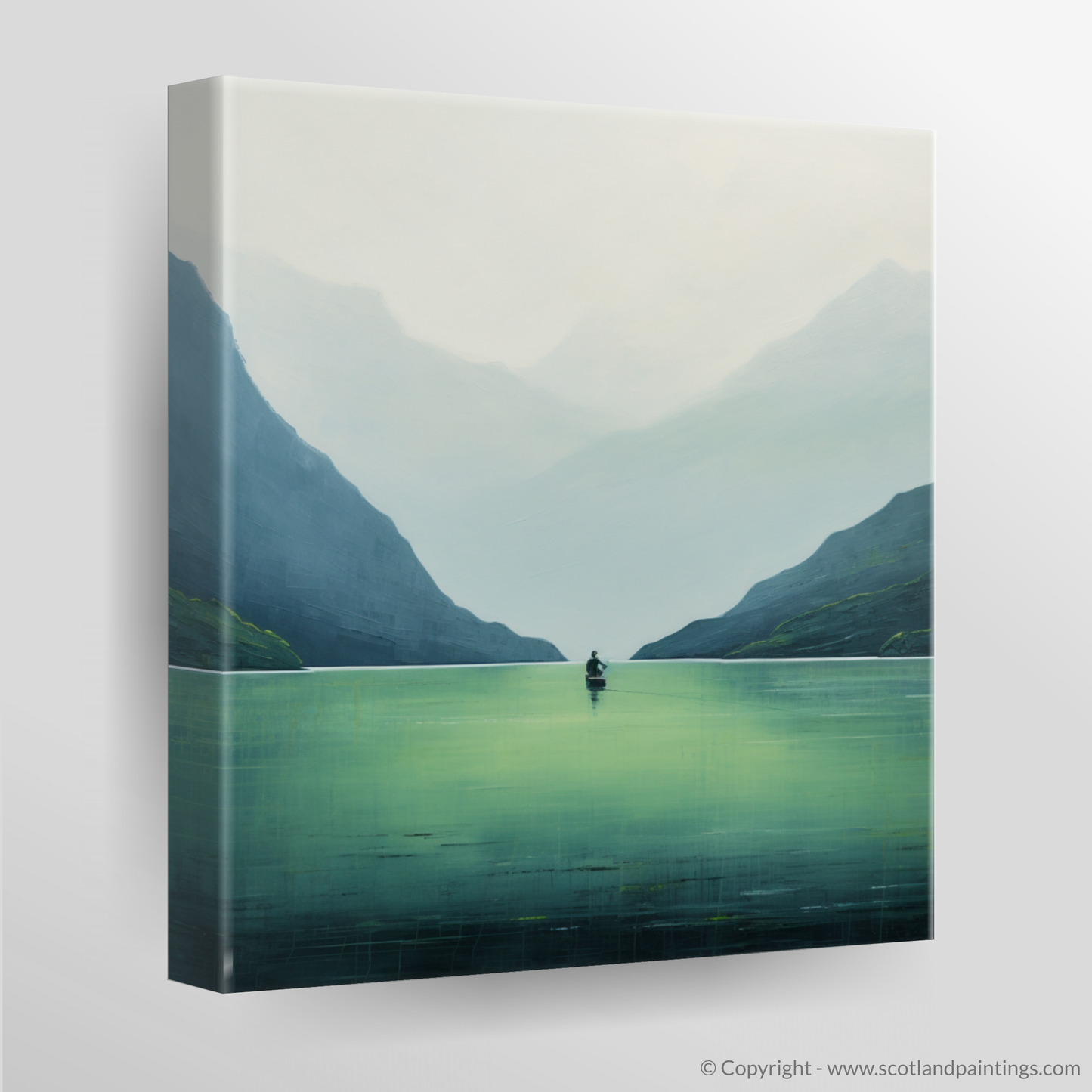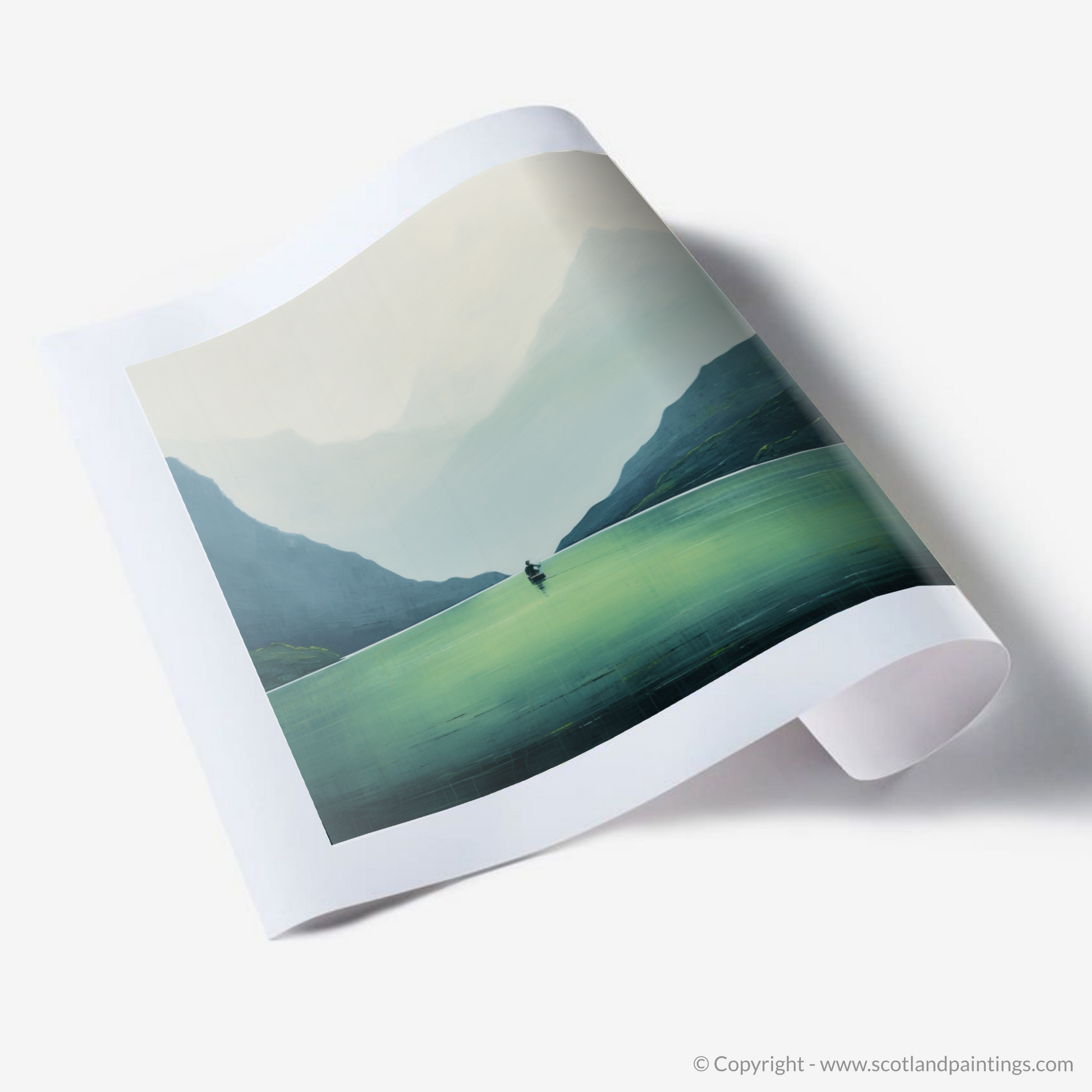 Majestic mountains etched on the horizon embrace the loch, their forms enveloped in a gradient of ethereal blues and greens, suggesting both depth and mystery. The precision of the mountains' silhouettes against the softening sky exemplifies the minimalist approach, where less speaks more. A gentle mist clings to their slopes, enhancing the artwork's dreamlike quality.