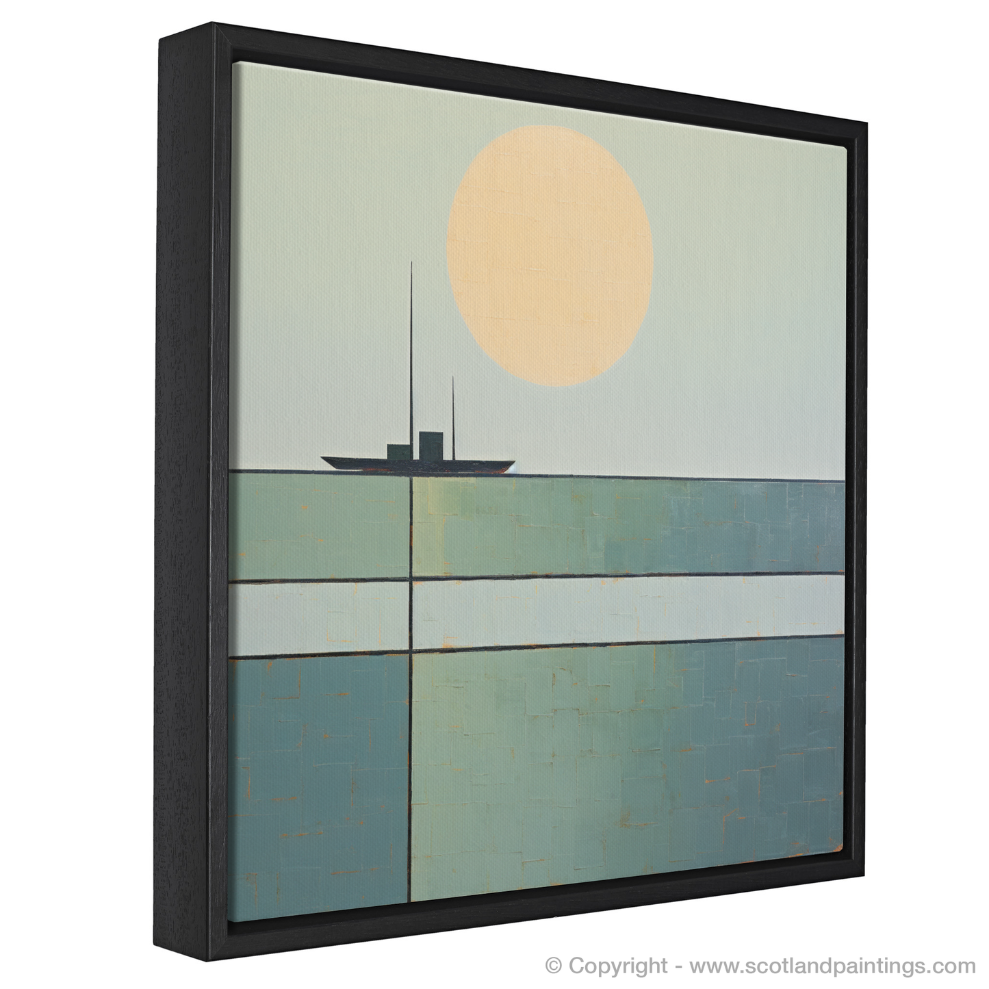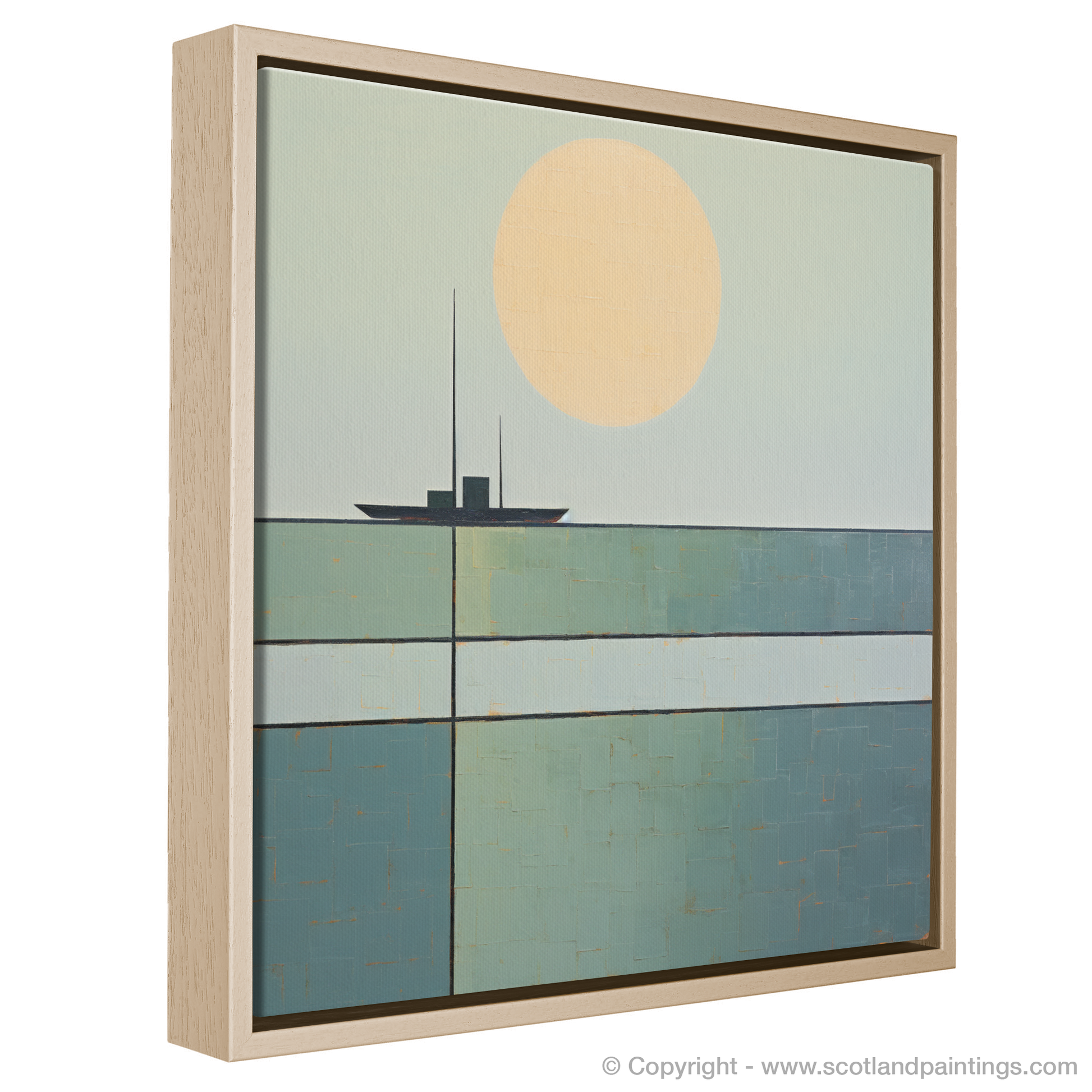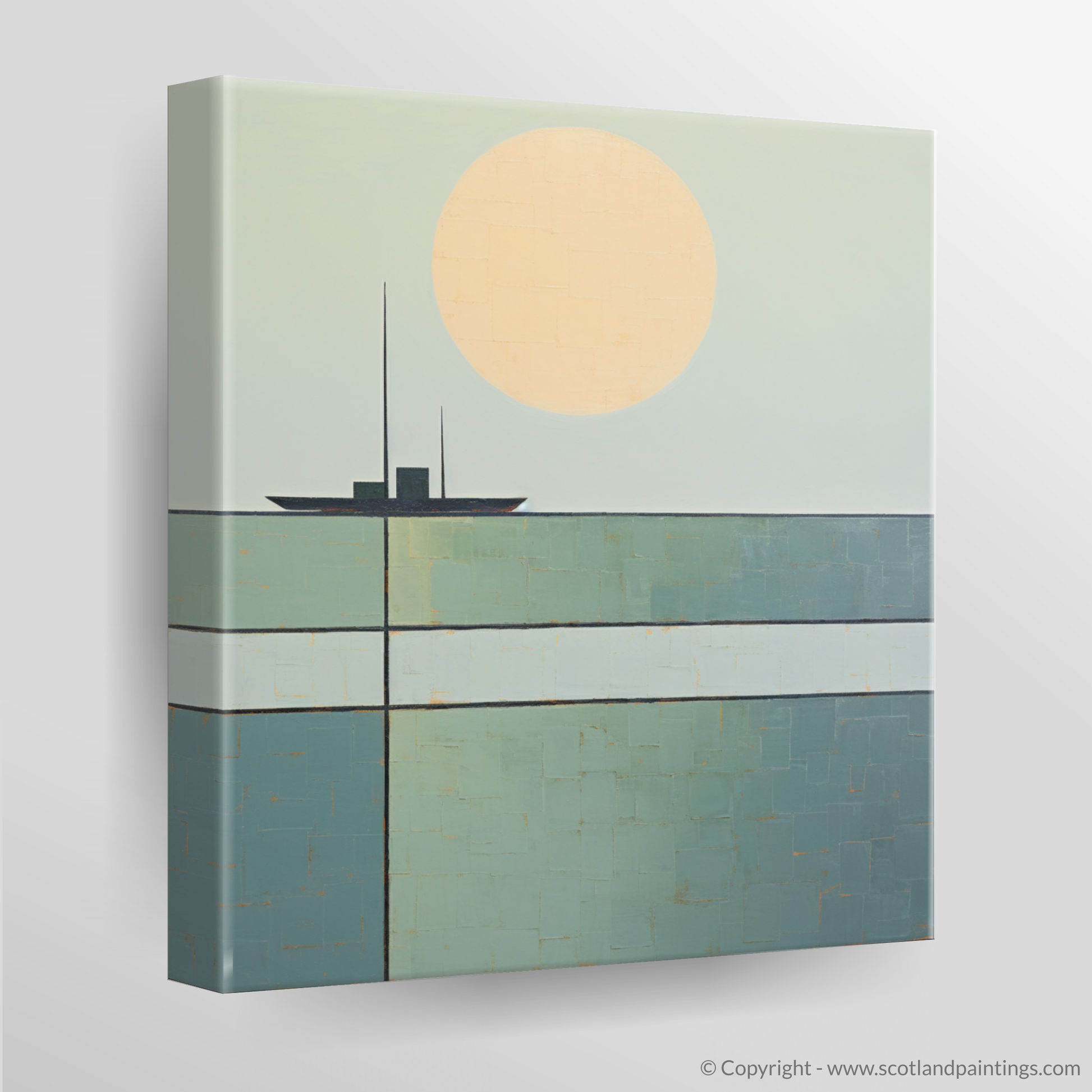 The sea itself is rendered in a layered spectrum of cool blues and greens, with each horizontal stratum suggesting the quiet lapping of waves. The artist has deftly used subtle shifts in tone and texture to evoke the fluidity of water, giving an illusion of depth and movement without compromising the minimalist aesthetic.