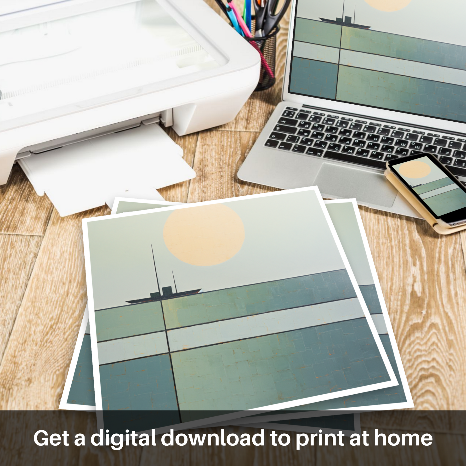 At the centre of this piece lies a solitary sailboat, its silhouette a study in graceful lines and understated detail against the soft tapestry of the sea. The boat is poised on the horizon, where the sea gently kisses the sky, instilling a sense of balance and poise that is the soul of the artwork.