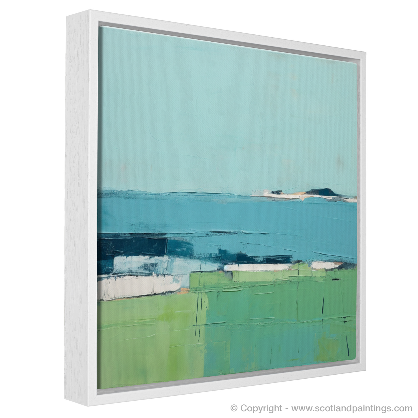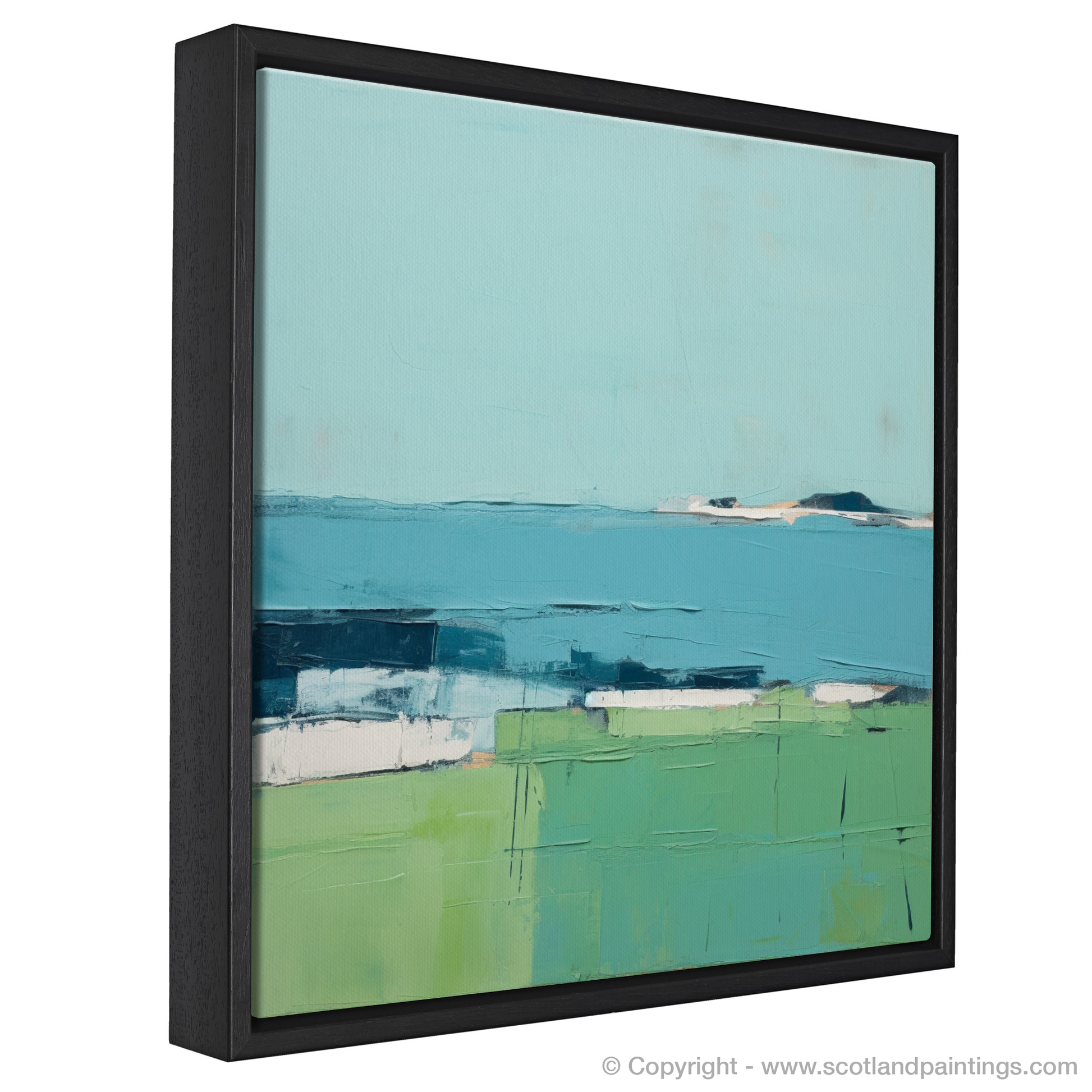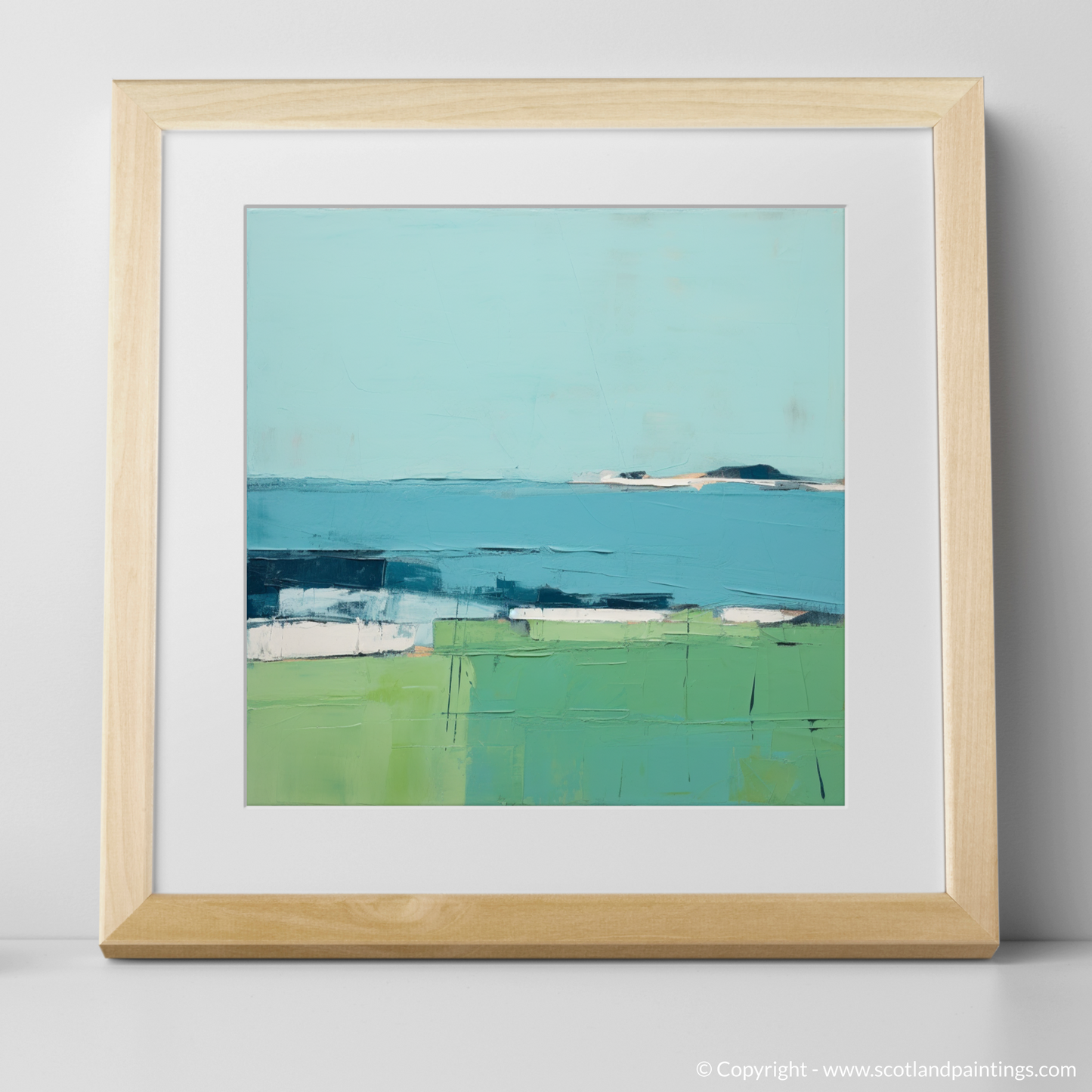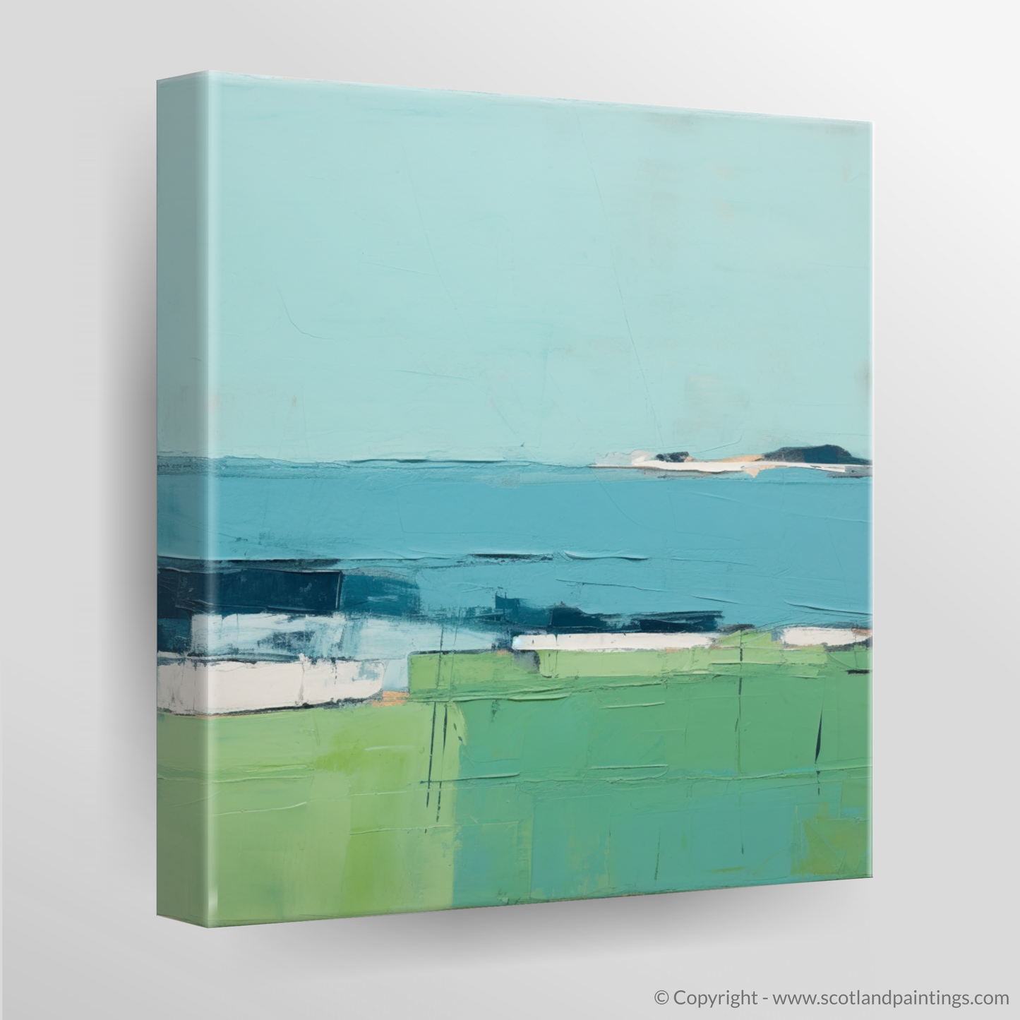 The piece features a palette dominated by soothing azure and verdant hues, mimicking the interplay between sky, sea, and land. Blocks of colour are arranged in a way that captures the stark beauty of the island's scenery, while subtle textures and variations within each segment suggest the complexity of the natural world.