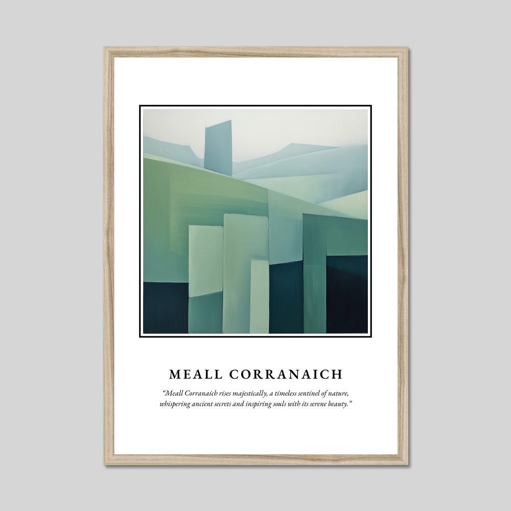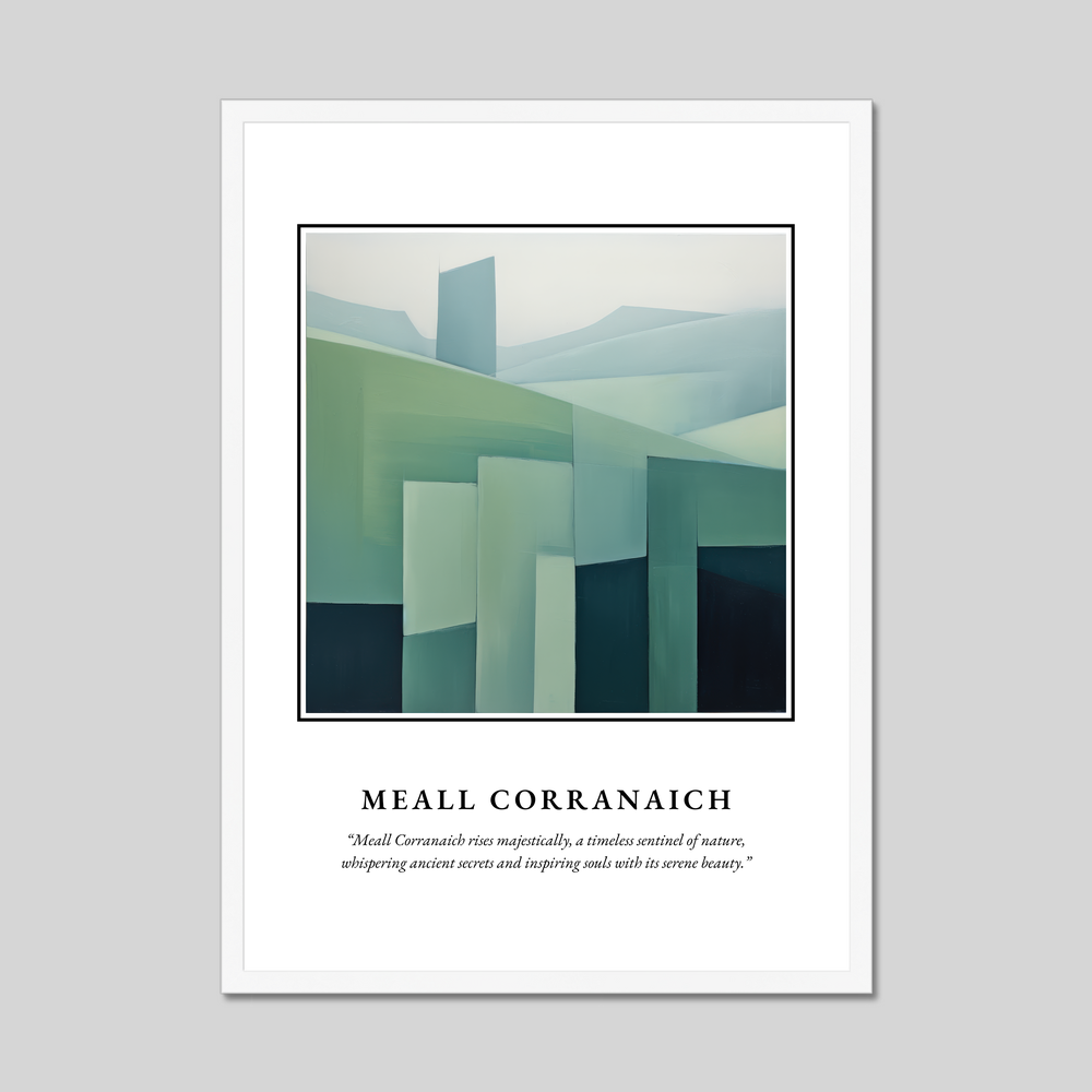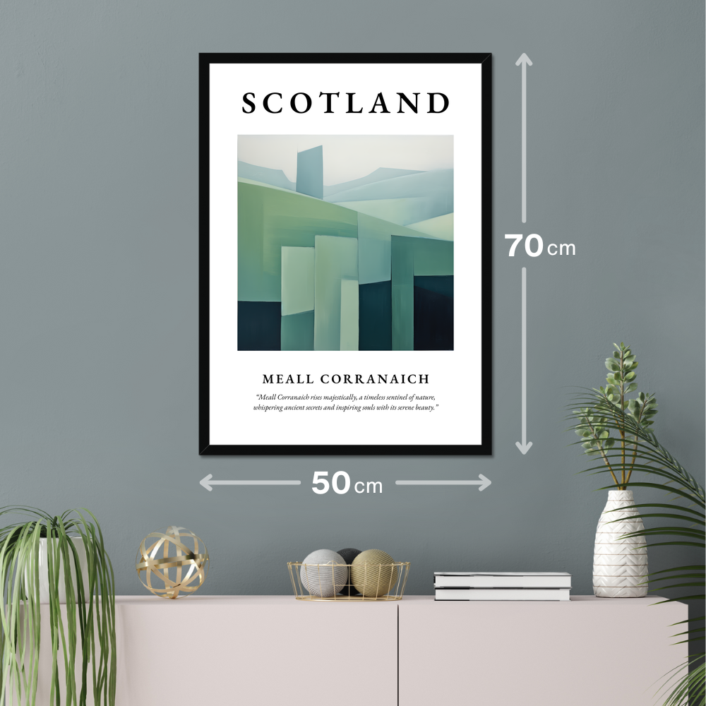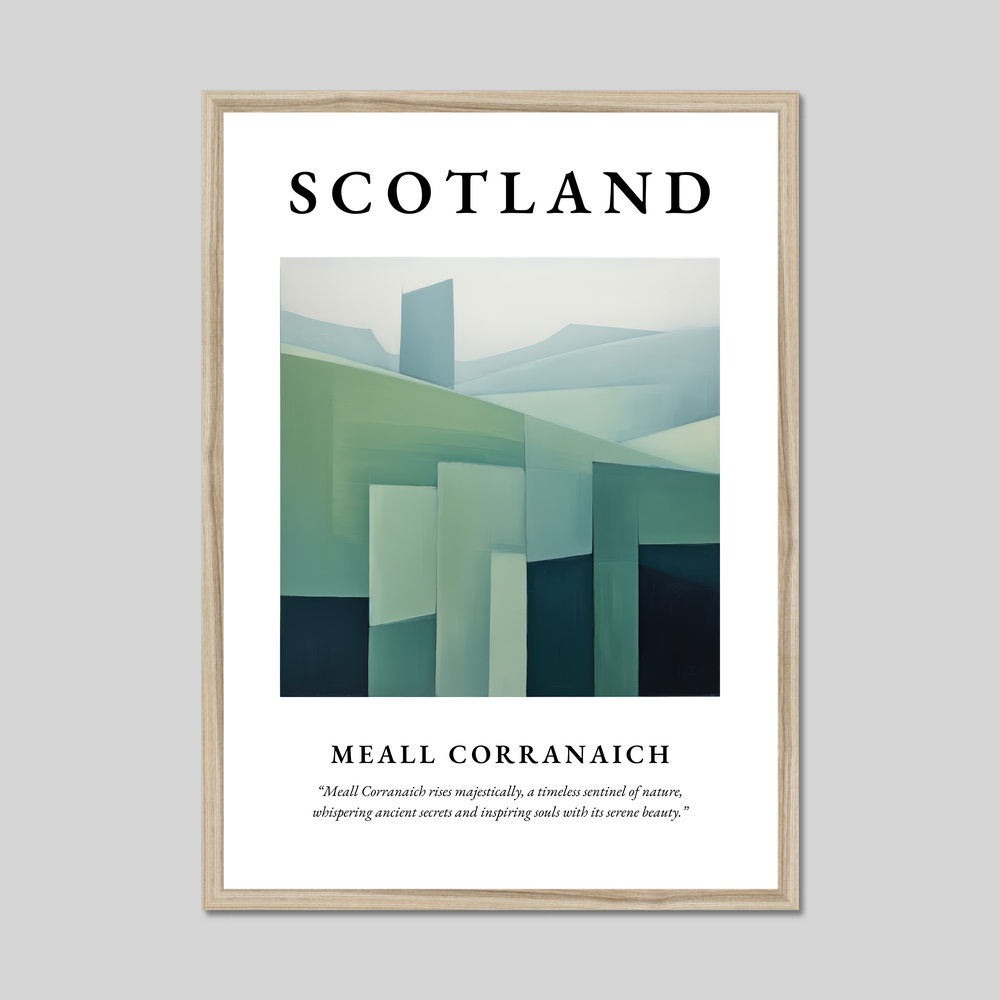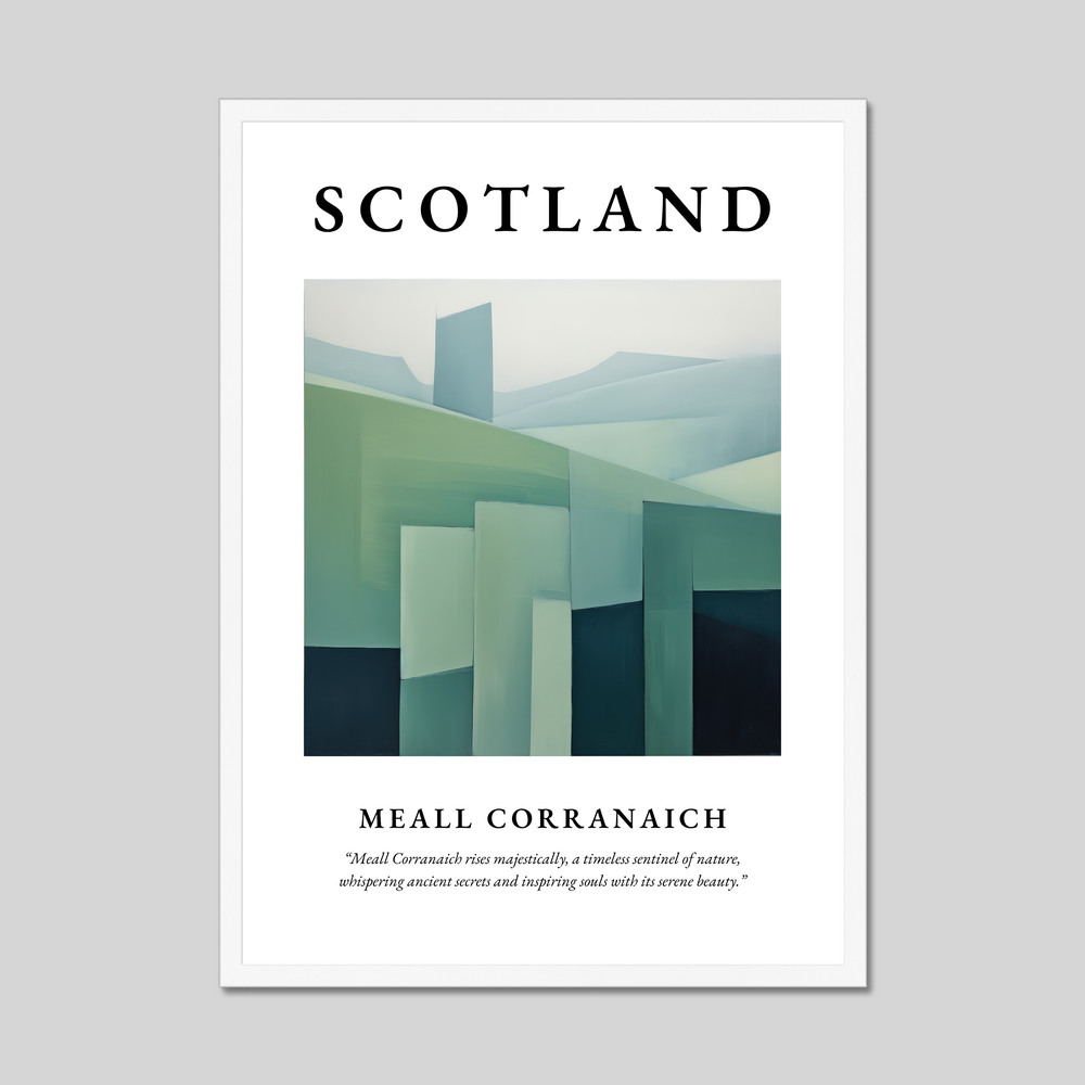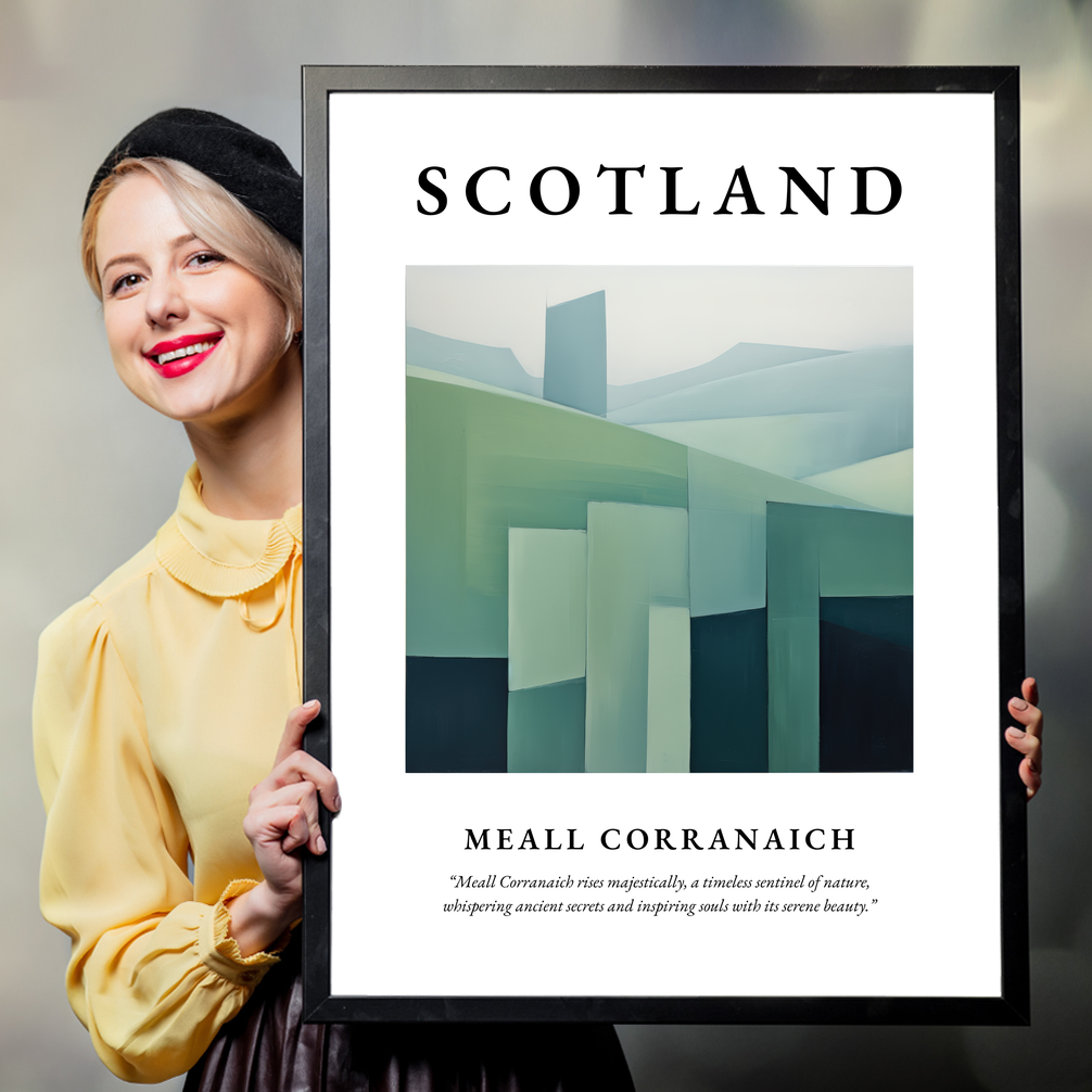 The poster features "SCOTLAND" in bold lettering at the top, instantly capturing the viewer's attention. Below, a minimalist painting of Meall Corranaich beautifully captures the mountain's serene and timeless aura. The use of subtle hues and clean lines brings a modern twist to a classic landscape, making it an ideal addition for art enthusiasts who embrace the minimalism style. Beneath the painting, the evocative quote, “Meall Corranaich rises majestically, a timeless sentinel of nature, whispering ancient secrets and inspiring souls with its serene beauty,” serves as a poetic tribute to this majestic peak.