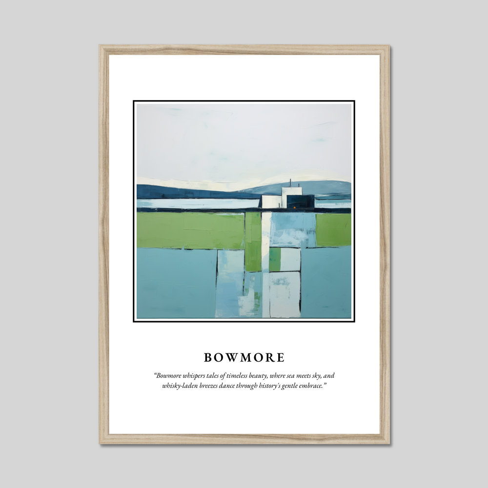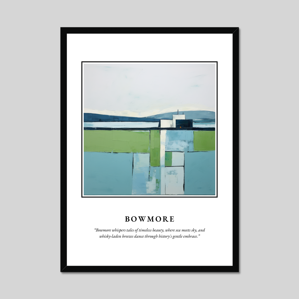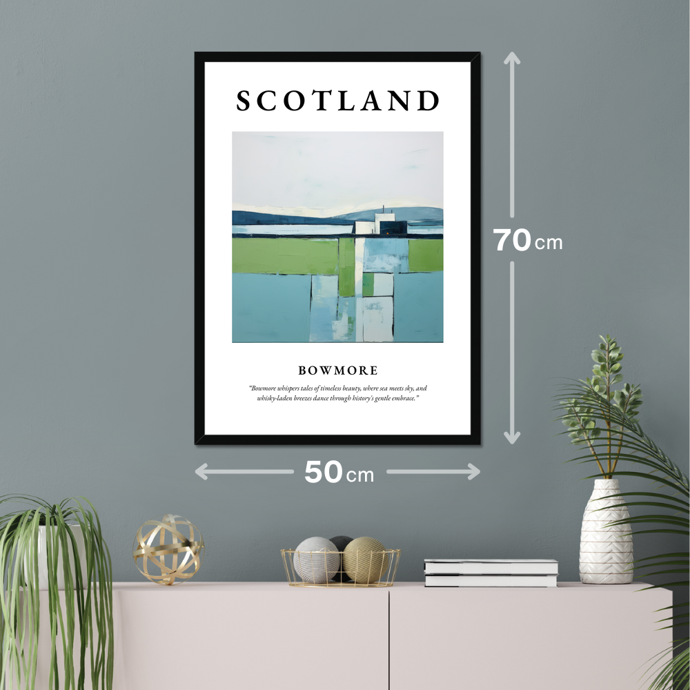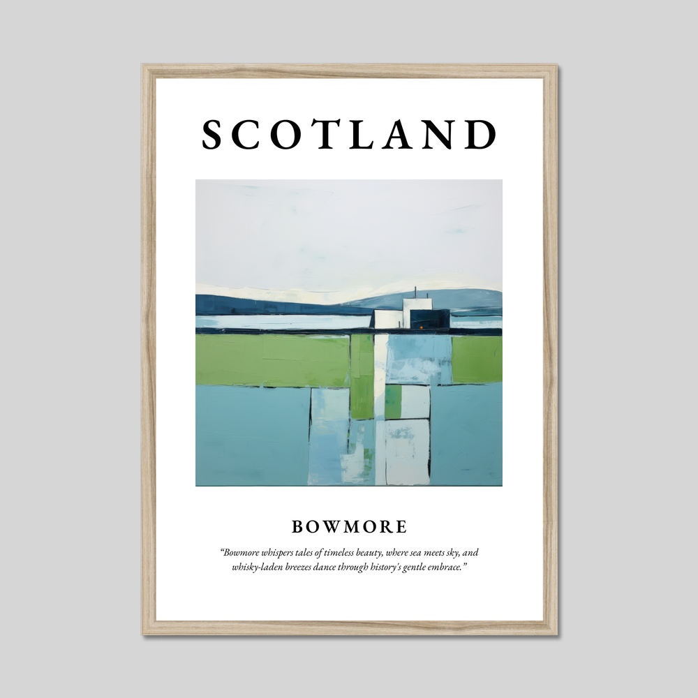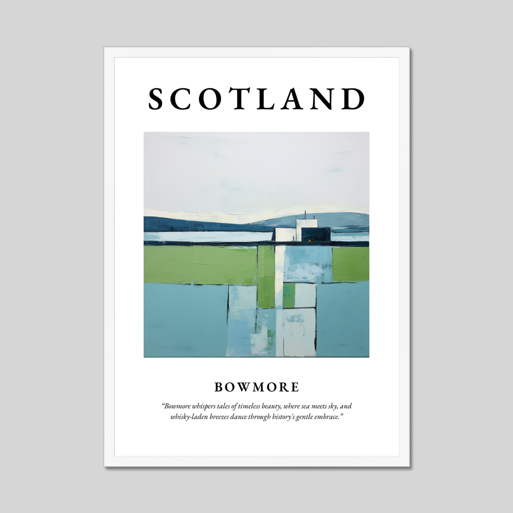 Available in three stunning frame options—black, white, or natural wood-effect—the poster effortlessly complements any interior decor. The bold lettering of “SCOTLAND” commands attention, while the minimalist painting below captures the tranquil essence of Bowmore, a place where the landscape whispers tales of timeless beauty. The soft interplay of greens and blues, coupled with sharp, clean lines, evokes a sense of both calmness and clarity. Below the painting, a charming quote stirs the imagination: “Bowmore whispers tales of timeless beauty, where sea meets sky, and whisky-laden breezes dance through history's gentle embrace.”