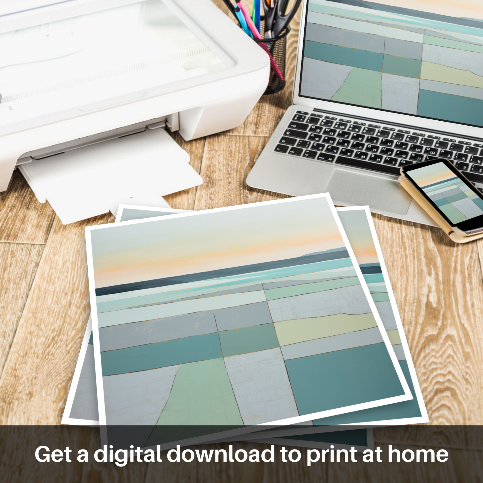 The composition, with its uncluttered aesthetic, is soothing to the eyes, broken down into a geometric abstraction that brings a sense of order and peace. Each coloured block suggests an element of the landscape: the smooth azure of the water, the muted olive of the shore, and the celestial gradient in the sky. Subtle textures within these blocks provide a tactile dimension, hinting at the natural details of sand and surf without overwhelming the senses.