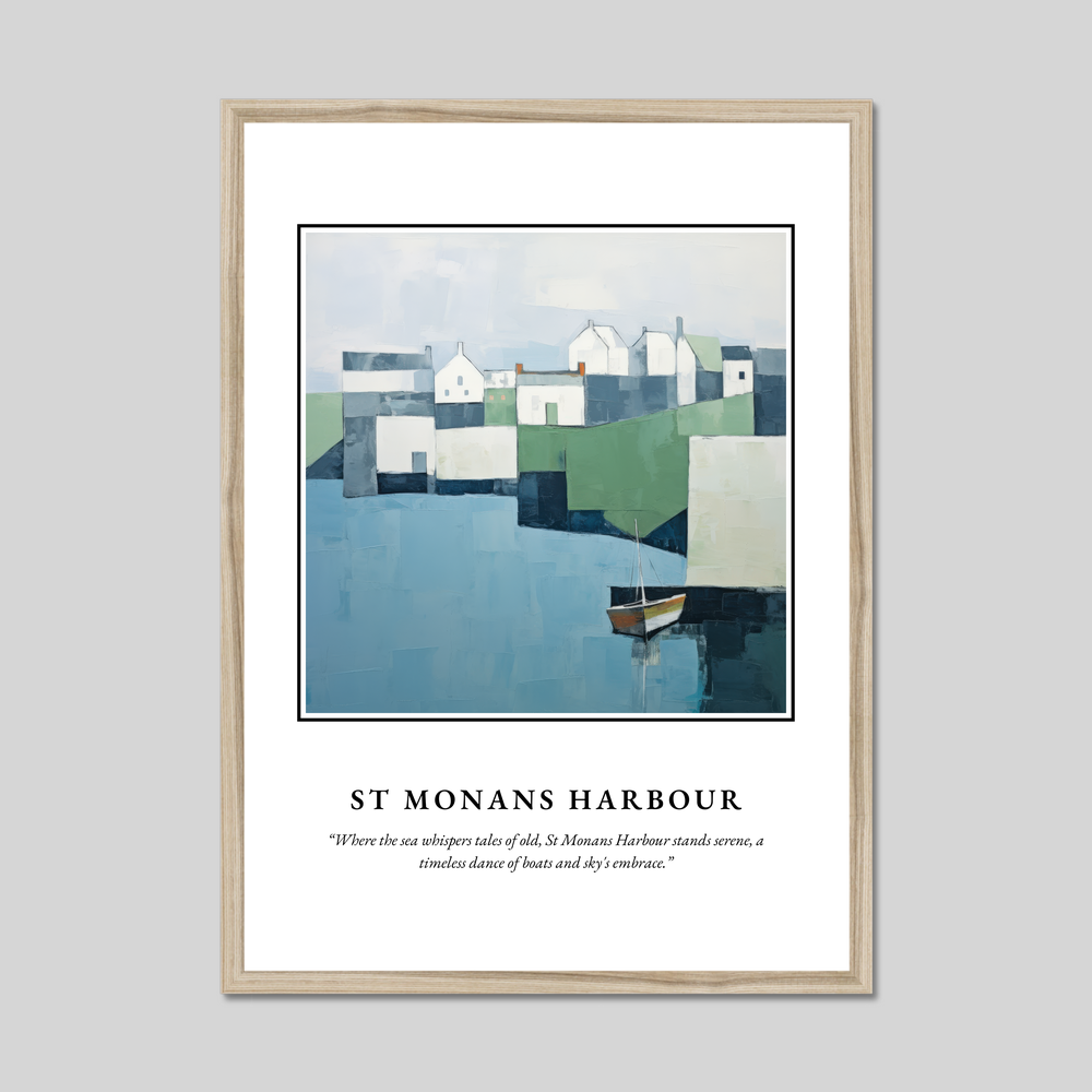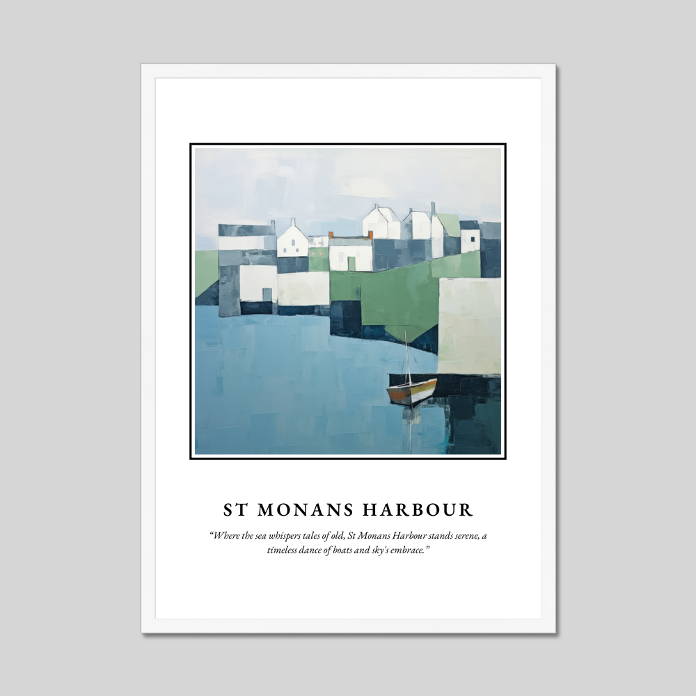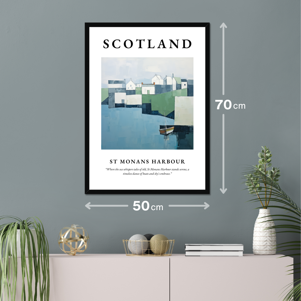 Accompanying the painting is a poetic quote: “Where the sea whispers tales of old, St Monans Harbour stands serene, a timeless dance of boats and sky's embrace.” This narrative breathes life into the art, inviting those with fond memories of Scotland or an appreciation for minimalist beauty to immerse themselves in the ambiance of the harbour. Large enough to command a significant wall area, this piece provides an affordable yet impactful way to transform your home or office.