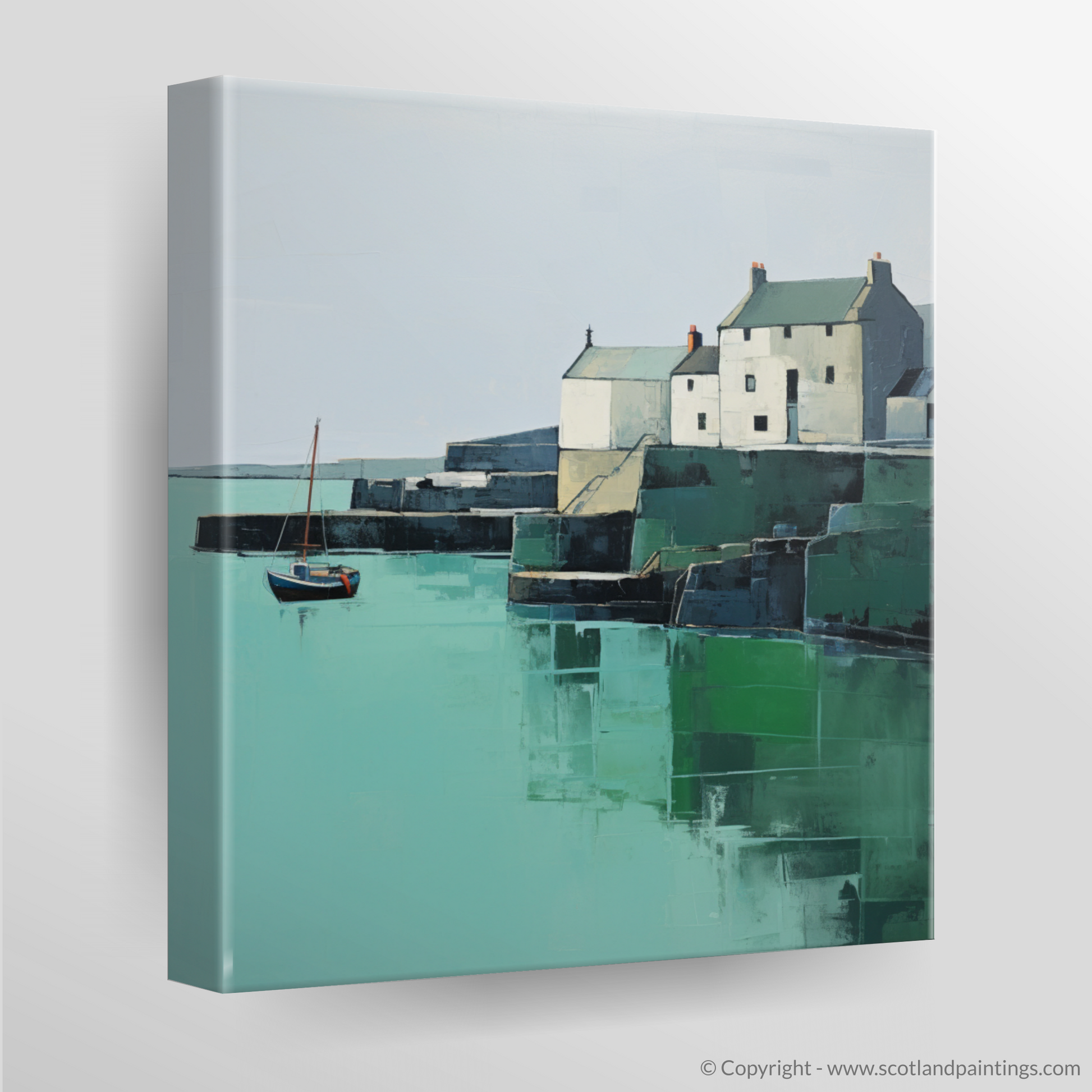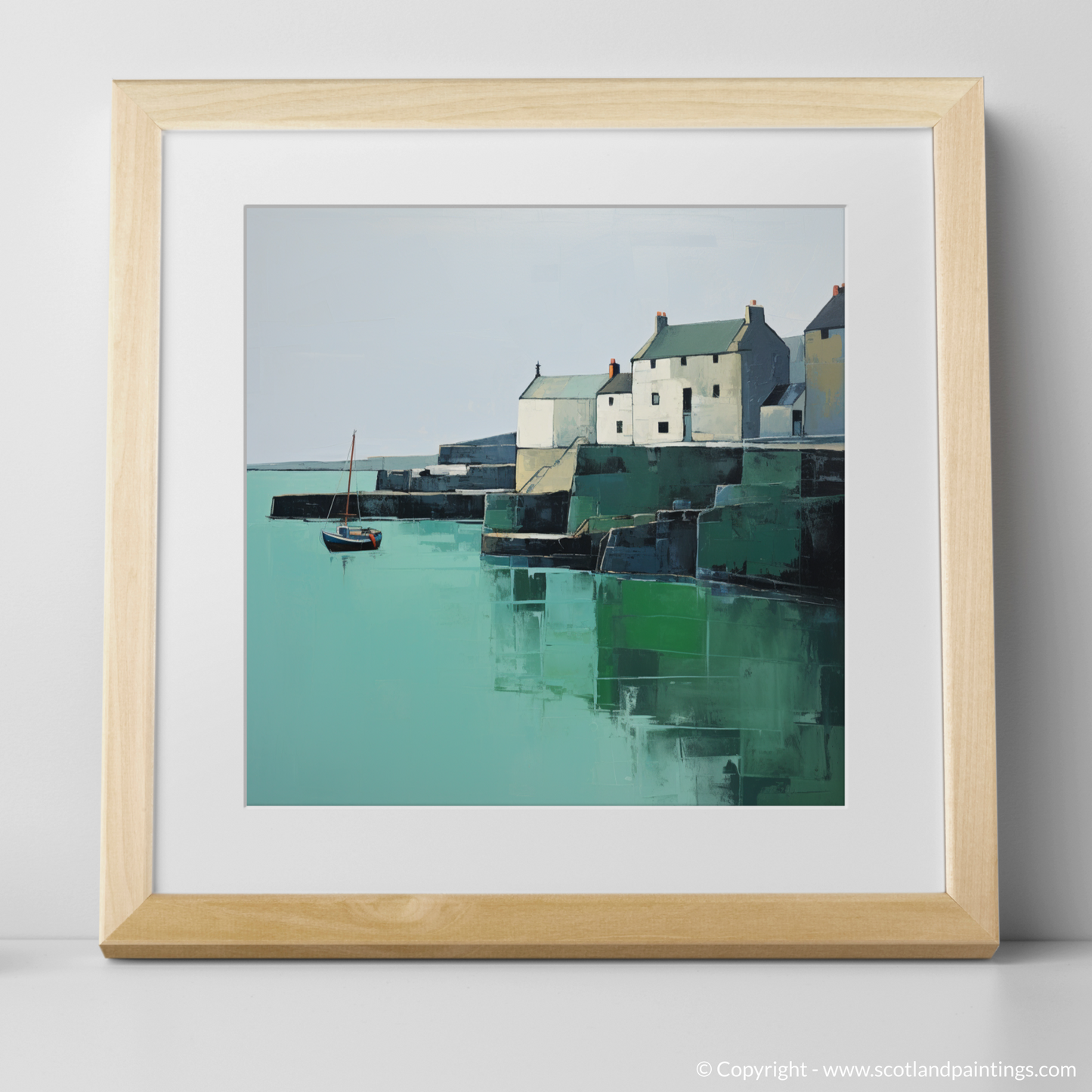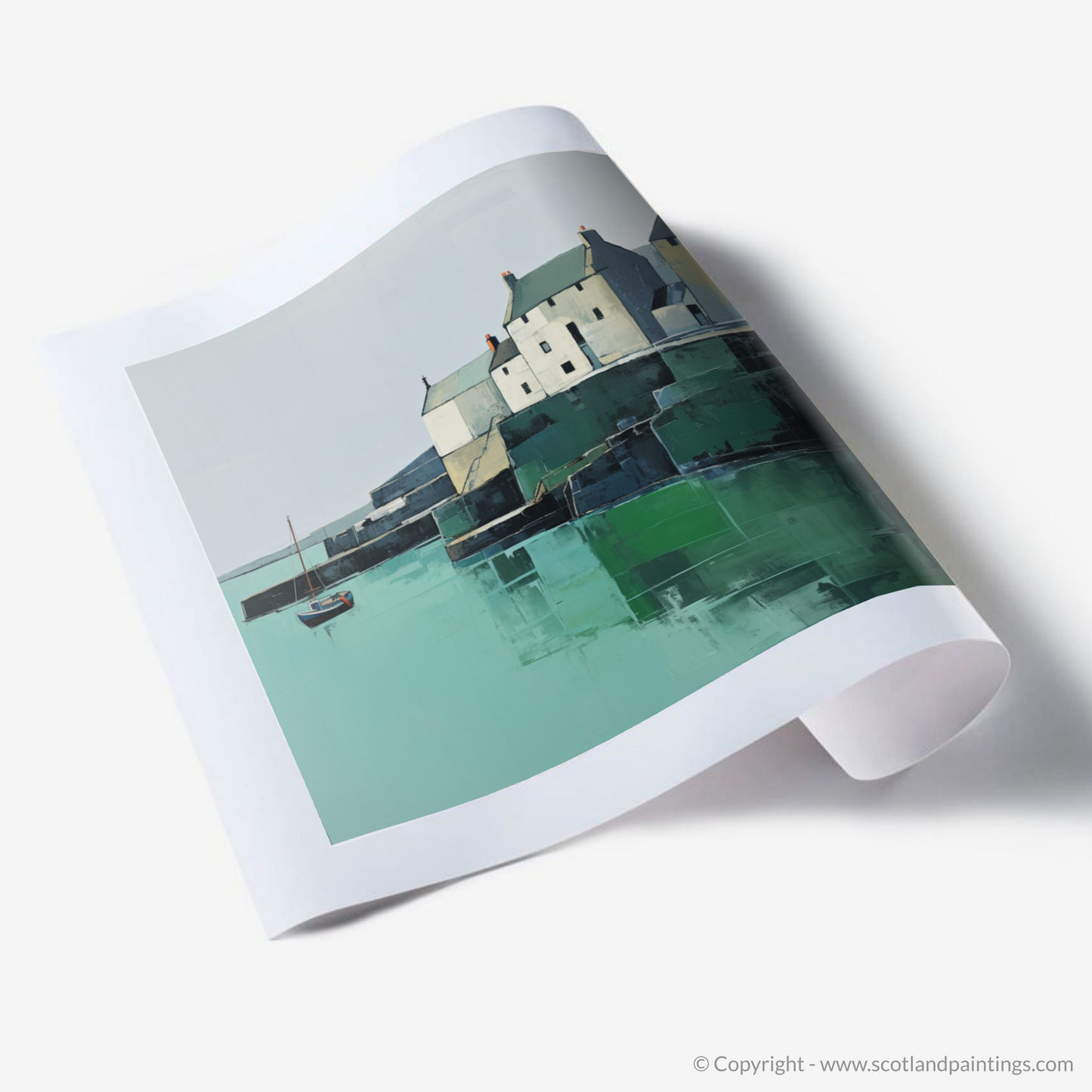 Embrace the serene simplicity of St Monans Harbour through this exquisite minimalist print that captures the essence of coastal tranquillity. With a calm and considered use of colour, the artwork showcases the soothing tones of sea greens and sky blues contrasting with the gentle whites and greys of the harbourside buildings which are portrayed with an almost geometric clarity.
